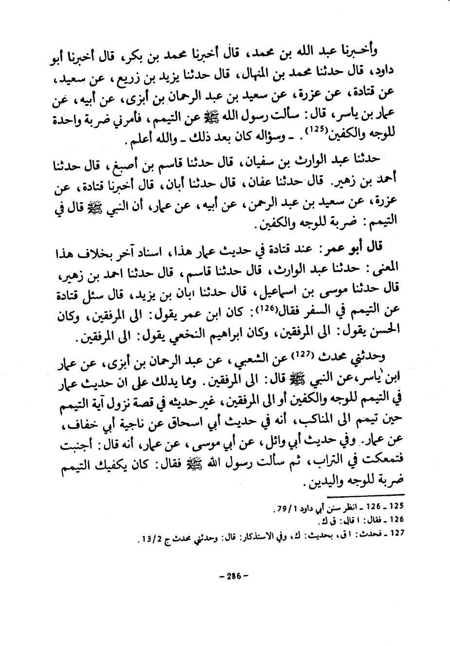 وَأَخْبَرَنَا عَبْدُ اللَّهِ بْنُ مُحَمَّدٍ قَالَ أَخْبَرَنَا مُحَمَّدُ بْنُ بَكْرٍ قَالَ أَخْبَرَنَا أَبُو دَاوُدَ قَالَ حَدَّثَنَا مُحَمَّدُ بْنُ الْمِنْهَالِ قَالَ حَدَّثَنَا يَزِيدُ بْنُ زُرَيْعٍ عَنْ سَعِيدٍ عَنْ قَتَادَةَ عَنْ عَزْرَةَ عَنْ سَعِيدِ بْنِ عبد الرحمان بْنِ أَبْزَى عَنْ أَبِيهِ عَنْ عَمَّارِ بْنِ يَاسِرٍ قَالَ سَأَلْتُ رَسُولَ اللَّهِ صَلَّى اللَّهُ عَلَيْهِ وَسَلَّمَ عَنِ التَّيَمُّمِ فَأَمَرَنِي ضَرْبَةً وَاحِدَةً لِلْوَجْهِ وَالْكَفَّيْنِ وَسُؤَالُهُ كَانَ بَعْدَ ذَلِكَ وَاللَّهُ أَعْلَمُ حَدَّثَنَا عَبْدُ الْوَارِثِ بْنُ سُفْيَانَ قَالَ حَدَّثَنَا قَاسِمُ بْنُ أَصْبَغَ قَالَ حَدَّثَنَا أَحْمَدُ بْنُ زُهَيْرٍ قَالَ حَدَّثَنَا عَفَّانُ قَالَ حَدَّثَنَا أَبَانٌ قَالَ أَخْبَرَنَا قَتَادَةُ عَنْ عَزْرَةَ عَنْ سَعِيدِ بْنِ عَبْدِ الرَّحْمَنِ عَنْ أَبِيهِ عَنْ عَمَّارٍ أَنَّ النَّبِيَّ صَلَّى اللَّهُ عَلَيْهِ وَسَلَّمَ قَالَ فِي التَّيَمُّمِ ضَرْبَةٌ لِلْوَجْهِ وَالْكَفَّيْنِ قَالَ أَبُو عُمَرَ عِنْدَ قَتَادَةَ فِي حَدِيثِ عَمَّارٍ هَذَا إِسْنَادٌ آخَرُ بِخِلَافِ هَذَا الْمَعْنَى حَدَّثَنَا عَبْدُ الْوَارِثِ قَالَ حَدَّثَنَا قَاسِمٌ قَالَ حَدَّثَنَا أَحْمَدُ بْنُ زُهَيْرٍ قَالَ حَدَّثَنَا مُوسَى بْنُ إِسْمَاعِيلَ قَالَ حَدَّثَنَا أَبَانُ بْنُ يَزِيدَ قَالَ سُئِلَ قَتَادَةُ عَنِ التَّيَمُّمِ فِي السَّفَرِ فَقَالَ كَانَ ابْنُ عُمَرَ يَقُولُ إِلَى الْمِرْفَقَيْنِ وَكَانَ الْحَسَنُ يَقُولُ إِلَى الْمِرْفَقَيْنِ وَكَانَ إِبْرَاهِيمُ النَّخَعِيُّ يَقُولُ إِلَى الْمِرْفَقَيْنِ وَحَدَّثَنِي مُحَدِّثٌ عَنِ الشَّعْبِيِّ عن عبد الرحمان بن أبزى عن عمار ابن يَاسِرٍ عَنِ النَّبِيِّ صَلَّى اللَّهُ عَلَيْهِ وَسَلَّمَ قَالَ إِلَى الْمِرْفَقَيْنِ وَمِمَّا يَدُلُّكَ عَلَى أَنَّ حَدِيثَ عَمَّارٍ فِي التَّيَمُّمِ لِلْوَجْهِ وَالْكَفَّيْنِ أَوِ إلى الْمِرْفَقَيْنِ غَيْرُ حَدِيثِهِ فِي قِصَّةِ نُزُولِ آيَةِ التَّيَمُّمِ حِينَ تَيَمَّمَ إِلَى الْمَنَاكِبِ أَنَّهُ فِي حَدِيثِ أَبِي إِسْحَاقَ عَنْ نَاجِيَةَ أَبِي خِفَافٍ عَنْ عَمَّارٍ وَفِي حَدِيثِ أَبِي وَائِلٍ عَنْ أَبِي مُوسَى عَنْ عَمَّارٍ أَنَّهُ قَالَ أَجْنَبْتُ فَتَمَعَّكْتُ فِي التُّرَابِ ثُمَّ سَأَلْتُ رَسُولَ اللَّهِ صَلَّى اللَّهُ عَلَيْهِ وَسَلَّمَ فَقَالَ كَانَ يَكْفِيكَ التَّيَمُّمُ ضَرْبَةً لِلْوَجْهِ وَالْيَدَيْنِ