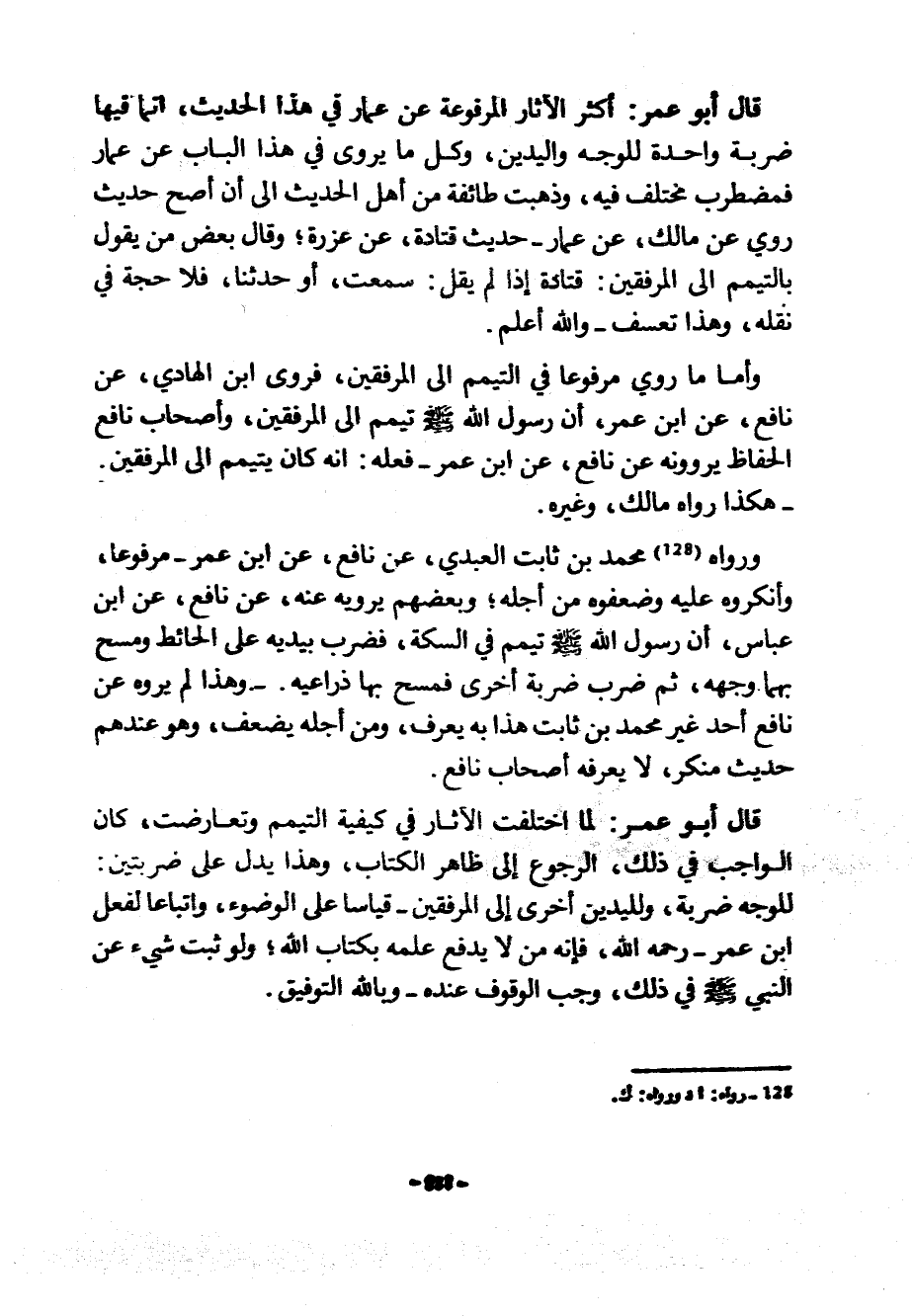 قَالَ أَبُو عُمَرَ أَكْثَرُ الْآثَارِ الْمَرْفُوعَةِ عَنْ عَمَّارٍ فِي هَذَا الْحَدِيثِ إِنَّمَا فِيهَا ضَرْبَةٌ واحدة للوجه واليدين وكل ما يورى فِي هَذَا الْبَابِ عَنْ عَمَّارٍ فَمُضْطَرِبٌ مُخْتَلَفٌ فِيهِ وَذَهَبَتْ طَائِفَةٌ مِنْ أَهْلِ الْحَدِيثِ إِلَى أَنَّ أَصَحَّ حَدِيثٍ رُوِيَ عَنْ مَالِكٍ عَنْ عَمَّارٍ حَدِيثُ قَتَادَةَ عَنْ عَزْرَةَ وَقَالَ بَعْضُ مَنْ يَقُولُ بِالتَّيَمُّمِ إِلَى الْمِرْفَقَيْنِ قَتَادَةُ إِذَا لَمْ يَقُلْ سَمِعْتُ أَوْ حَدَّثَنَا فَلَا حُجَّةَ فِي نَقْلِهِ وَهَذَا تَعَسُّفٌ وَاللَّهُ أَعْلَمُ وَأَمَّا مَا رُوِيَ مَرْفُوعًا فِي التَّيَمُّمِ إِلَى الْمِرْفَقَيْنِ فَرَوَى ابْنُ الْهَادِي عَنْ نَافِعٍ عَنِ ابْنِ عُمَرَ أَنَّ رَسُولَ اللَّهِ صَلَّى اللَّهُ عَلَيْهِ وَسَلَّمَ تَيَمَّمَ إِلَى الْمِرْفَقَيْنِ وَأَصْحَابُ نَافِعٍ الْحُفَّاظُ يَرْوُونَهُ عَنْ نَافِعٍ عَنِ ابْنِ عُمَرَ فَعَلَهُ أنه كان يتيمم الى المرفقين هكذ رَوَاهُ مَالِكٌ وَغَيْرُهُ وَرَوَاهُ مُحَمَّدُ بْنُ ثَابِتٍ الْعَبْدِيُّ عَنْ نَافِعٍ عَنِ ابْنِ عُمَرَ مَرْفُوعًا وَأَنْكَرُوهُ عَلَيْهِ وَضَعَّفُوهُ مِنْ أَجْلِهِ وَبَعْضُهُمْ يَرْوِيهِ عَنْهُ عَنْ نَافِعٍ عَنِ ابْنِ عَبَّاسٍ أَنَّ رَسُولَ اللَّهِ صَلَّى اللَّهُ عَلَيْهِ وَسَلَّمَ تَيَمَّمَ فِي السِّكَّةِ فَضَرَبَ بِيَدَيْهِ عَلَى الْحَائِطِ وَمَسَحَ بِهِمَا وَجْهَهُ ثُمَّ ضَرَبَ ضَرْبَةً أُخْرَى فَمَسَحَ بِهَا ذِرَاعَيْهِ وَهَذَا لَمْ يَرْوِهِ عَنْ نَافِعٍ أحد غير محمد بن ثابت هذا به يُعْرَفُ وَمِنْ أَجْلِهِ يُضَعَّفُ وَهُوَ عِنْدَهُمْ حَدِيثٌ مُنْكَرٌ لَا يَعْرِفُهُ أَصْحَابُ نَافِعٍ قَالَ أَبُو عُمَرَ لَمَّا اخْتَلَفَتِ الْآثَارُ فِي كَيْفِيَّةِ التَّيَمُّمِ وَتَعَارَضَتْ كَانَ الْوَاجِبُ فِي ذَلِكَ الرُّجُوعَ إِلَى ظَاهِرِ الْكِتَابِ وَهَذَا يَدُلُّ عَلَى ضَرْبَتَيْنِ لِلْوَجْهِ ضَرْبَةٌ وَلِلْيَدَيْنِ أُخْرَى إِلَى الْمِرْفَقَيْنِ قِيَاسًا عَلَى الْوُضُوءِ وَاتِّبَاعًا لِفِعْلِ ابْنِ عُمَرَ رَحِمَهُ اللَّهُ فَإِنَّهُ مَنْ لَا يُدْفَعُ عِلْمُهُ بِكِتَابِ اللَّهِ وَلَوْ ثَبَتَ شَيْءٌ عَنِ النَّبِيِّ صَلَّى اللَّهُ عَلَيْهِ وَسَلَّمَ فِي ذَلِكَ وَجَبَ الْوُقُوفُ عِنْدَهُ وبالله التوفيق