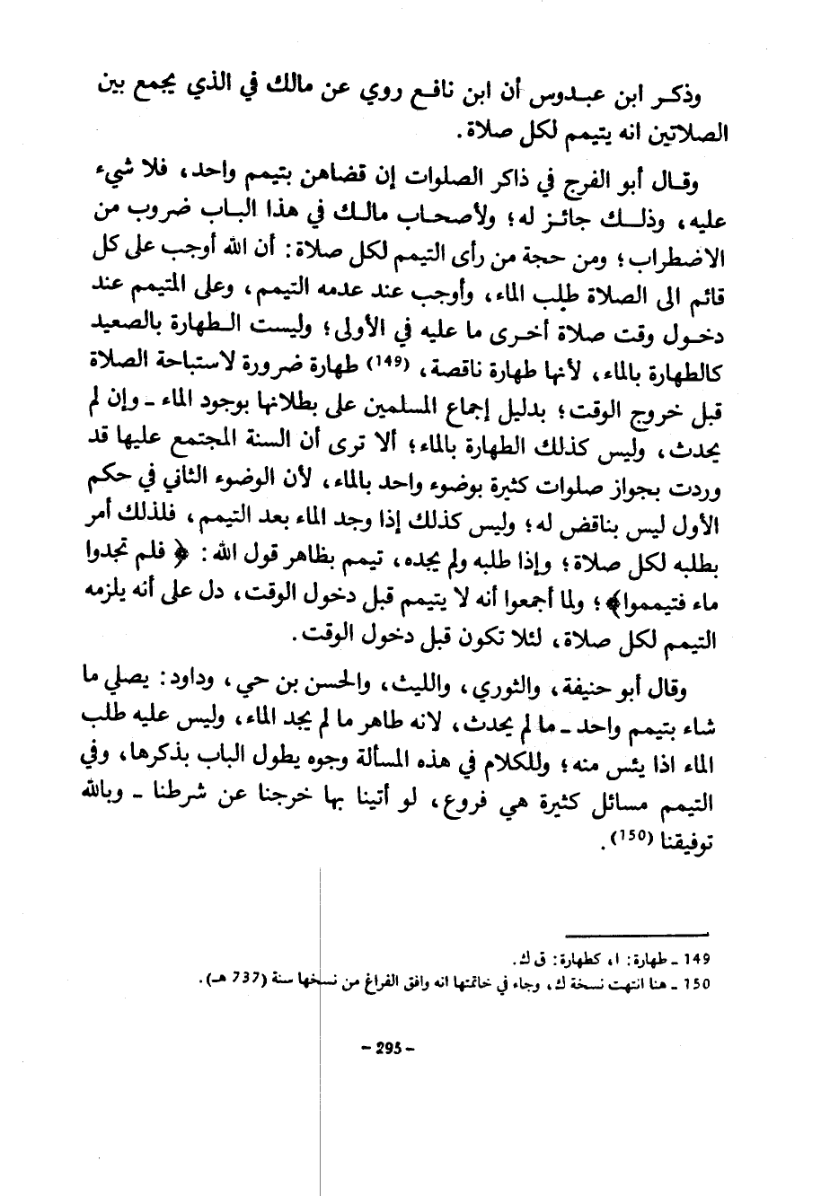وَذَكَرَ ابْنُ عَبْدُوسٍ أَنَّ ابْنَ نَافِعٍ رَوَى عَنْ مَالِكٍ فِي الَّذِي يَجْمَعُ بَيْنَ الصَّلَاتَيْنِ أَنَّهُ يَتَيَمَّمُ لِكُلِّ صَلَاةٍ وَقَالَ أَبُو الْفَرَجِ فِي ذَاكِرِ الصَّلَوَاتِ إِنْ قَضَاهُنَّ بِتَيَمُّمٍ وَاحِدٍ فَلَا شَيْءَ عَلَيْهِ وَذَلِكَ جَائِزٌ لَهُ وَلِأَصْحَابِ مَالِكٍ فِي هَذَا الْبَابِ ضُرُوبٌ مِنَ الِاضْطِرَابِ وَمِنْ حُجَّةِ مَنْ رَأَى التَّيَمُّمَ لِكُلِّ صَلَاةٍ أَنَّ اللَّهَ أَوْجَبَ عَلَى كُلِّ قَائِمٍ إِلَى الصَّلَاةِ طَلَبَ الْمَاءِ وَأَوْجَبَ عِنْدَ عَدَمِهِ التَّيَمُّمَ وَعَلَى الْمُتَيَمِّمِ عِنْدَ دُخُولِ وَقْتِ صَلَاةٍ أُخْرَى مَا عَلَيْهِ فِي الْأُولَى وَلَيْسَتِ الطَّهَارَةُ بِالصَّعِيدِ كَالطَّهَارَةِ بِالْمَاءِ لِأَنَّهَا طَهَارَةٌ نَاقِصَةٌ طَهَارَةُ ضَرُورَةٍ لِاسْتِبَاحَةِ الصَّلَاةِ قَبْلَ خُرُوجِ الْوَقْتِ بِدَلِيلِ إِجْمَاعِ الْمُسْلِمِينَ عَلَى بُطْلَانِهَا بِوُجُودِ الْمَاءِ وَإِنْ لَمْ يُحْدِثْ وَلَيْسَ كَذَلِكَ الطَّهَارَةُ بِالْمَاءِ أَلَا تَرَى أَنَّ السُّنَّةَ الْمُجْتَمَعَ عَلَيْهَا قَدْ وَرَدَتْ بِجَوَازِ صلوات كثيرة بوضوء واحد بالماء لأن الضووء الثَّانِيَ فِي حُكْمِ الْأَوَّلِ لَيْسَ بِنَاقِضٍ لَهُ وَلَيْسَ كَذَلِكَ إِذَا وُجِدَ الْمَاءُ بَعْدَ التَّيَمُّمِ فَلِذَلِكَ أَمَرَ بِطَلَبِهِ لِكُلِّ صَلَاةٍ وَإِذَا طَلَبَهُ ولم يجده تيمم بظاهر قوله اللَّهِ فَلَمْ تَجِدُوا مَاءً فَتَيَمَّمُوا وَلَمَّا أَجْمَعُوا أَنَّهُ لَا يَتَيَمَّمُ قَبْلَ دُخُولِ الْوَقْتِ دَلَّ عَلَى أَنَّهُ يَلْزَمُهُ التَّيَمُّمُ لِكُلِّ صَلَاةٍ لِئَلَّا تَكُونَ قَبْلَ دُخُولِ الْوَقْتِ وَقَالَ أَبُو حَنِيفَةَ وَالثَّوْرِيُّ وَاللَّيْثُ وَالْحَسَنُ بْنُ حَيٍّ وَدَاوُدُ يُصَلِّي مَا شَاءَ بِتَيَمُّمٍ وَاحِدٍ مَا لَمْ يُحْدِثْ لأنه طاره مَا لَمْ يَجِدِ الْمَاءَ وَلَيْسَ عَلَيْهِ طَلَبُ الْمَاءِ إِذَا يَئِسَ مِنْهُ وَلِلْكَلَامِ فِي هَذِهِ الْمَسْأَلَةِ وُجُوهٌ يَطُولُ الْبَابُ بِذِكْرِهَا وَفِي التَّيَمُّمِ مَسَائِلُ كَثِيرَةٌ هِيَ فُرُوعٌ لَوْ أَتَيْنَا بِهَا خَرَجْنَا عَنْ شَرْطِنَا وَبِاللَّهِ تَوْفِيقُنَا
