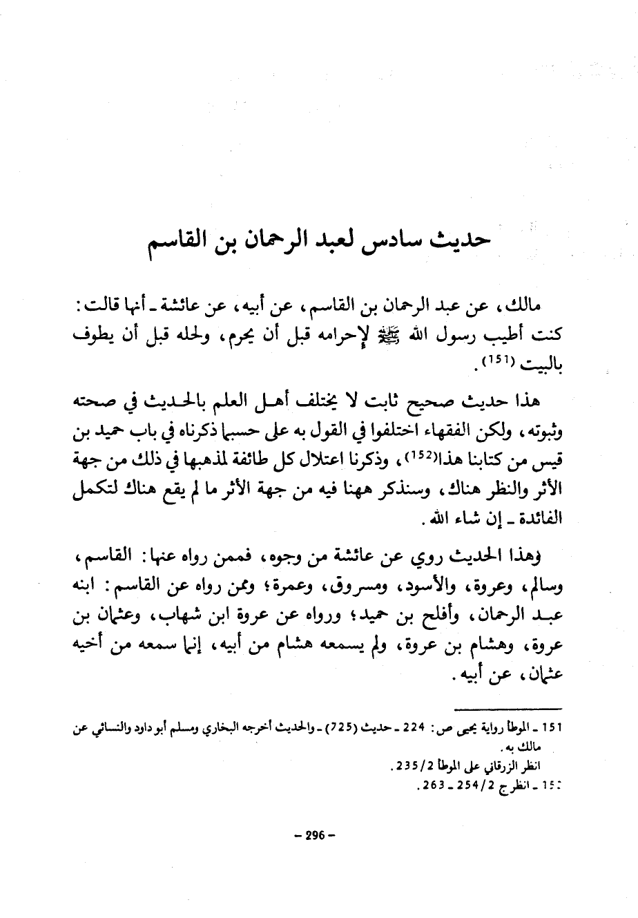 حديث سادس لعبد الرحمان بن القاسم مالك عن عبد الرحمان بْنِ الْقَاسِمِ عَنْ أَبِيهِ عَنْ عَائِشَةَ أَنَّهَا قَالَتْ كُنْتُ أُطَيِّبُ رَسُولَ اللَّهِ صَلَّى اللَّهُ عَلَيْهِ وَسَلَّمَ لِإِحْرَامِهِ قَبْلَ أَنْ يُحْرِمَ وَلِحِلِّهِ قَبْلَ أَنْ يَطُوفَ بِالْبَيْتِ هَذَا حَدِيثٌ صَحِيحٌ ثَابِتٌ لَا يَخْتَلِفُ أَهْلُ الْعِلْمِ بِالْحَدِيثِ فِي صِحَّتِهِ وَثُبُوتِهِ وَلَكِنَّ الْفُقَهَاءَ اخْتَلَفُوا فِي الْقَوْلِ به على حسبما ذَكَرْنَاهُ فِي بَابِ حُمَيْدِ بْنِ قَيْسٍ مِنْ كِتَابِنَا هَذَا وَذَكَرْنَا اعْتِلَالَ كُلِّ طَائِفَةٍ لِمَذْهَبِهَا فِي ذَلِكَ مِنْ جِهَةِ الْأَثَرِ وَالنَّظَرِ هُنَاكَ وسنذكر ههنا فيه من جهة الأثر مالم يقع هناك لتكمل الفائدة إِنْ شَاءَ اللَّهُ وَهَذَا الْحَدِيثُ رُوِيَ عَنْ عئاشة مِنْ وُجُوهٍ فَمِمَّنْ رَوَاهُ عَنْهَا الْقَاسِمُ وَسَالِمٌ وَعُرْوَةُ وَالْأَسْوَدُ وَمَسْرُوقٌ وَعَمْرَةُ وَمِمَّنْ رَوَاهُ عَنِ القاسم ابنه عبد الرحمان وأفلح بن حيمد وَرَوَاهُ عَنْ عُرْوَةَ ابْنُ شِهَابٍ وَعُثْمَانُ بْنُ عُرْوَةَ وَهِشَامُ بْنُ عُرْوَةَ وَلَمْ يَسْمَعْهُ هِشَامٌ مِنْ أَبِيهِ إِنَّمَا سَمِعَهُ مِنْ أَخِيهِ عُثْمَانَ عن أبيه