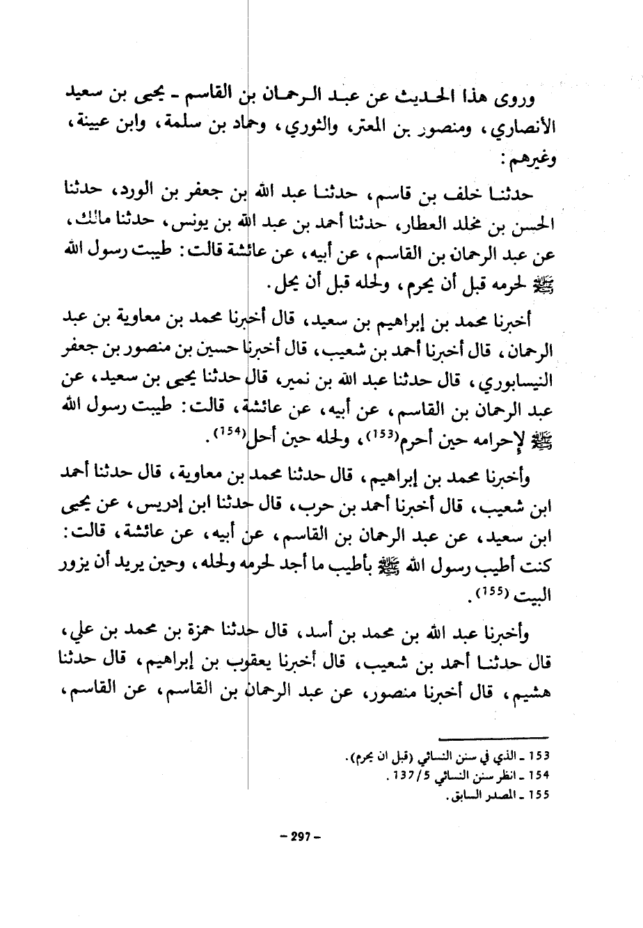 وروى هذا الحديث عن عبد الرحمان بْنِ الْقَاسِمِ يَحْيَى بْنُ سَعِيدٍ الْأَنْصَارِيُّ وَمَنْصُورُ بْنُ الْمُعْتَرِّ وَالثَّوْرِيُّ وَحَمَّادُ بْنُ سَلَمَةَ وَابْنُ عُيَيْنَةَ وَغَيْرُهُمْ حَدَّثَنَا خَلَفُ بْنُ قَاسِمٍ حَدَّثَنَا عَبْدُ اللَّهِ بْنُ جَعْفَرِ بْنِ الْوَرْدِ حَدَّثَنَا الْحَسَنُ بْنُ مَخْلَدٍ الْعَطَّارُ حَدَّثَنَا أَحْمَدُ بْنُ عَبْدِ اللَّهِ بْنِ يُونُسَ حَدَّثَنَا مَالِكٌ عَنْ عبد الرحمان بْنِ الْقَاسِمِ عَنْ أَبِيهِ عَنْ عَائِشَةَ قَالَتْ طَيَّبْتُ رَسُولَ اللَّهِ صَلَّى اللَّهُ عَلَيْهِ وَسَلَّمَ لِإِحْرَامِهِ قَبْلَ أَنْ يُحْرِمَ وَلِحِلِّهِ قَبْلَ أَنْ يُحِلَّ أَخْبَرَنَا مُحَمَّدُ بْنُ إِبْرَاهِيمَ بْنِ سَعِيدٍ قَالَ أَخْبَرَنَا مُحَمَّدُ بْنُ مُعَاوِيَةَ بْنِ عَبْدِ الرحمان قَالَ أَخْبَرَنَا أَحْمَدُ بْنُ شُعَيْبٍ قَالَ أَخْبَرَنَا حُسَيْنُ بْنُ مَنْصُورِ بْنِ جَعْفَرٍ النَّيْسَابُورِيُّ قَالَ حَدَّثَنَا عَبْدُ اللَّهِ بْنُ نُمَيْرٍ قَالَ حَدَّثَنَا يحيى بن سعيد عن عبد الرحمان بْنِ الْقَاسِمِ عَنْ أَبِيهِ عَنْ عَائِشَةَ قَالَتْ طَيَّبْتُ رَسُولَ اللَّهِ صَلَّى اللَّهُ عَلَيْهِ وَسَلَّمَ لِإِحْرَامِهِ حِينَ أَحْرَمَ وَلِحِلِّهِ حِينَ أَحَلَّ وَأَخْبَرَنَا مُحَمَّدُ بْنُ إِبْرَاهِيمَ قَالَ حَدَّثَنَا مُحَمَّدُ بْنُ معاوية قال حدثنا أحمد ابن شُعَيْبٍ قَالَ أَخْبَرَنَا أَحْمَدُ بْنُ حَرْبٍ قَالَ حدثنا ابن إدريس عن يحيى ابن سعيد عن عبد الرحمان بْنِ الْقَاسِمِ عَنْ أَبِيهِ عَنْ عَائِشَةَ قَالَتْ كُنْتُ أُطَيِّبُ رَسُولَ اللَّهِ صَلَّى اللَّهُ عَلَيْهِ وَسَلَّمَ بِأَطْيَبِ مَا أَجِدُ لِحُرْمِهِ وَلِحِلِّهِ وَحِينَ يُرِيدُ أَنْ يَزُورَ الْبَيْتَ وَأَخْبَرَنَا عَبْدُ اللَّهِ بْنُ مُحَمَّدِ بْنِ أَسَدٍ قَالَ حَدَّثَنَا حَمْزَةُ بْنُ مُحَمَّدِ بْنِ عَلِيٍّ قَالَ حَدَّثَنَا أَحْمَدُ بْنُ شُعَيْبٍ قَالَ أَخْبَرَنَا يَعْقُوبُ بْنُ إِبْرَاهِيمَ قَالَ حَدَّثَنَا هُشَيْمٌ قَالَ أَخْبَرَنَا مَنْصُورٌ عَنْ عبد الرحمان بْنِ الْقَاسِمِ عَنِ الْقَاسِمِ