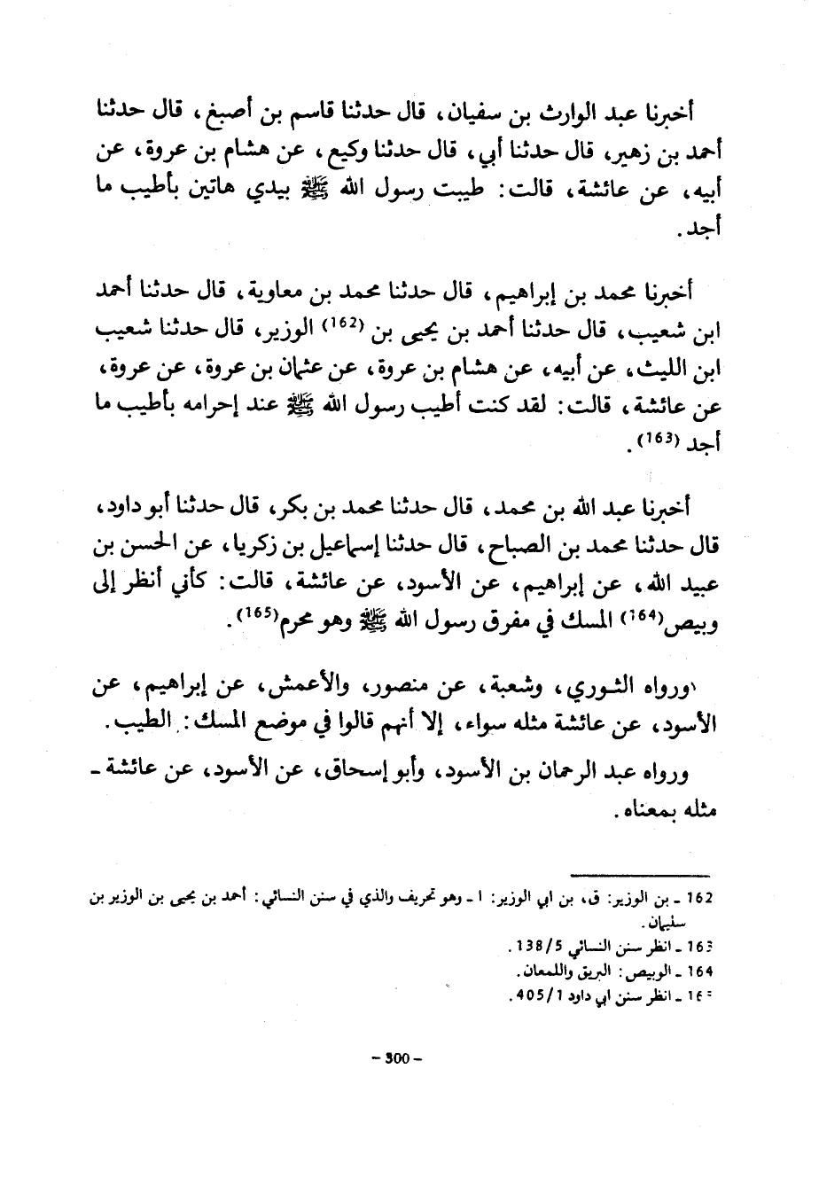 أَخْبَرَنَا عَبْدُ الْوَارِثِ بْنُ سُفْيَانَ قَالَ حَدَّثَنَا قَاسِمُ بْنُ أَصْبَغَ قَالَ حَدَّثَنَا أَحْمَدُ بْنُ زُهَيْرٍ قَالَ حَدَّثَنَا أَبِي قَالَ حَدَّثَنَا وَكِيعٌ عَنْ هِشَامِ بْنِ عُرْوَةَ عَنْ أَبِيهِ عَنْ عَائِشَةَ قَالَتْ طَيَّبْتُ رَسُولَ اللَّهِ صَلَّى اللَّهُ عَلَيْهِ وَسَلَّمَ بِيَدِي هَاتَيْنِ بِأَطْيَبِ مَا أَجِدُ أَخْبَرَنَا مُحَمَّدُ بْنُ إِبْرَاهِيمَ قَالَ حَدَّثَنَا مُحَمَّدُ بْنُ معاوية قال حدثنا أحمد ابن شُعَيْبٍ قَالَ حَدَّثَنَا أَحْمَدُ بْنُ يَحْيَى بْنِ الوزير قال حدثنا شعيب ابن اللَّيْثِ عَنْ أَبِيهِ عَنْ هِشَامِ بْنِ عُرْوَةَ عَنْ عُثْمَانَ بْنِ عُرْوَةَ عَنْ عُرْوَةَ عَنْ عَائِشَةَ قَالَتْ لَقَدْ كُنْتُ أُطَيِّبُ رَسُولَ اللَّهِ صَلَّى اللَّهُ عَلَيْهِ وَسَلَّمَ عِنْدَ إِحْرَامِهِ بِأَطْيَبِ مَا أَجِدُ أَخْبَرَنَا عَبْدُ اللَّهِ بْنُ مُحَمَّدٍ قَالَ حَدَّثَنَا مُحَمَّدُ بْنُ بَكْرٍ قَالَ حَدَّثَنَا أَبُو دَاوُدَ قَالَ حَدَّثَنَا مُحَمَّدُ بْنُ الصَّبَاحِ قَالَ حَدَّثَنَا إِسْمَاعِيلُ بْنُ زَكَرِيَّا عَنِ الْحَسَنِ بْنِ عُبَيْدِ اللَّهِ عَنْ إِبْرَاهِيمَ عَنِ الْأَسْوَدِ عَنْ عَائِشَةَ قَالَتْ كَأَنِّي أَنْظُرُ إِلَى وَبِيصِ الْمِسْكِ فِي مَفْرِقِ رَسُولِ اللَّهِ صَلَّى اللَّهُ عَلَيْهِ وَسَلَّمَ وَهُوَ مُحْرِمٌ وَرَوَاهُ الثَّوْرِيُّ وَشُعْبَةُ عَنْ مَنْصُورٍ وَالْأَعْمَشِ عَنْ إِبْرَاهِيمَ عَنِ الْأَسْوَدِ عَنْ عَائِشَةَ مِثْلَهُ سَوَاءً إِلَّا أَنَّهُمْ قَالُوا في موضع المسك الطيب ورواه عبد الرحمان بْنُ الْأَسْوَدِ وَأَبُو إِسْحَاقَ عَنِ الْأَسْوَدِ عَنْ عَائِشَةَ مِثْلَهُ بِمَعْنَاهُ