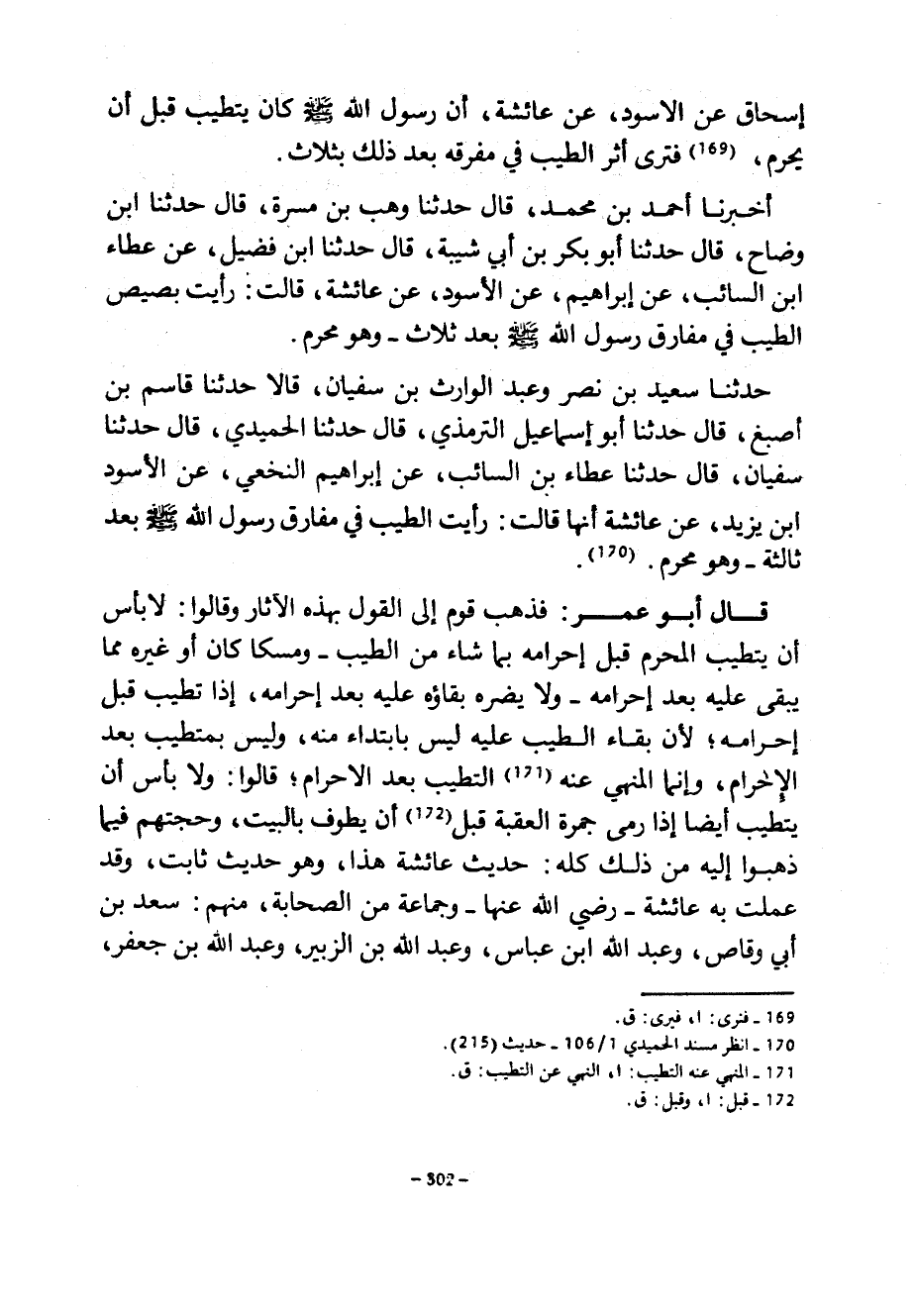 إِسْحَاقَ عَنِ الْأَسْوَدِ عَنْ عَائِشَةَ أَنَّ رَسُولَ اللَّهِ صَلَّى اللَّهُ عَلَيْهِ وَسَلَّمَ كَانَ يَتَطَيَّبُ قَبْلَ أَنْ يُحْرِمَ فَتَرَى أَثَرَ الطِّيبِ فِي مفرقه بعد ذلك بثلاث أَخْبَرَنَا أَحْمَدُ بْنُ مُحَمَّدٍ قَالَ حَدَّثَنَا وَهْبُ بْنُ مَسَرَّةَ قَالَ حَدَّثَنَا ابْنُ وَضَّاحٍ قَالَ حَدَّثَنَا أَبُو بَكْرِ بْنُ أَبِي شَيْبَةَ قَالَ حَدَّثَنَا ابْنُ فُضَيْلٍ عَنْ عطاء ابن السَّائِبِ عَنْ إِبْرَاهِيمَ عَنِ الْأَسْوَدِ عَنْ عَائِشَةَ قَالَتْ رَأَيْتُ بَصِيصَ الطِّيبِ فِي مَفَارِقِ رَسُولِ اللَّهِ صَلَّى اللَّهُ عَلَيْهِ وَسَلَّمَ بَعْدَ ثَلَاثٍ وَهُوَ مُحْرِمٌ حَدَّثَنَا سَعِيدُ بْنُ نَصْرٍ وَعَبْدُ الْوَارِثِ بْنُ سُفْيَانَ قَالَا حَدَّثَنَا قَاسِمُ بْنُ أَصْبَغَ قَالَ حَدَّثَنَا أَبُو إِسْمَاعِيلَ التِّرْمِذِيُّ قَالَ حَدَّثَنَا الْحُمَيْدِيُّ قَالَ حَدَّثَنَا سُفْيَانُ قَالَ حَدَّثَنَا عَطَاءُ بْنُ السَّائِبِ عَنْ إِبْرَاهِيمَ النَّخَعِيِّ عَنِ الأسود ابن يَزِيدَ عَنْ عَائِشَةَ أَنَّهَا قَالَتْ رَأَيْتُ الطِّيبِ فِي مَفَارِقِ رَسُولِ اللَّهِ صَلَّى اللَّهُ عَلَيْهِ وَسَلَّمَ بَعْدَ ثَالِثَةٍ وَهُوَ مُحْرِمٌ قَالَ أَبُو عُمَرَ فَذَهَبَ قَوْمٌ إِلَى الْقَوْلِ بِهَذِهِ الْآثَارِ وَقَالُوا لَا بَأْسَ أَنْ يَتَطَيَّبَ الْمُحْرِمُ قَبْلَ إِحْرَامِهِ بِمَا شَاءَ مِنَ الطِّيبِ وَمِسْكًا كَانَ أَوْ غَيْرَهُ مِمَّا يَبْقَى عَلَيْهِ بَعْدَ إِحْرَامِهِ وَلَا يَضُرُّهُ بَقَاؤُهُ عَلَيْهِ بَعْدَ إِحْرَامِهِ إِذَا تَطَيَّبَ قَبْلَ إِحْرَامِهِ لِأَنَّ بَقَاءَ الطِّيبِ عَلَيْهِ لَيْسَ بِابْتِدَاءٍ مِنْهُ وَلَيْسَ بِمُتَطَيِّبٍ بَعْدَ الْإِحْرَامِ وَإِنَّمَا الْمَنْهِيُّ عَنْهُ التَّطَيُّبُ بَعْدَ الْإِحْرَامِ قَالُوا وَلَا بَأْسَ أَنْ يَتَطَيَّبَ أَيْضًا إِذَا رَمَى جَمْرَةَ الْعَقَبَةِ قَبْلَ أَنْ يَطُوفَ بِالْبَيْتِ وَحُجَّتُهُمْ فِيمَا ذَهَبُوا إِلَيْهِ مِنْ ذَلِكَ كُلِّهِ حَدِيثُ عَائِشَةَ هَذَا وَهُوَ حَدِيثٌ ثَابِتٌ وَقَدْ عَمِلَتْ بِهِ عَائِشَةُ رَضِيَ اللَّهُ عَنْهَا وَجَمَاعَةٌ مِنَ الصَّحَابَةِ مِنْهُمْ سَعْدُ بْنُ أَبِي وَقَّاصٍ وَعَبْدُ الله ابن عَبَّاسٍ وَعَبْدُ اللَّهِ بْنِ الزُّبَيْرِ وَعَبْدِ اللَّهِ بْنِ جَعْفَرٍ