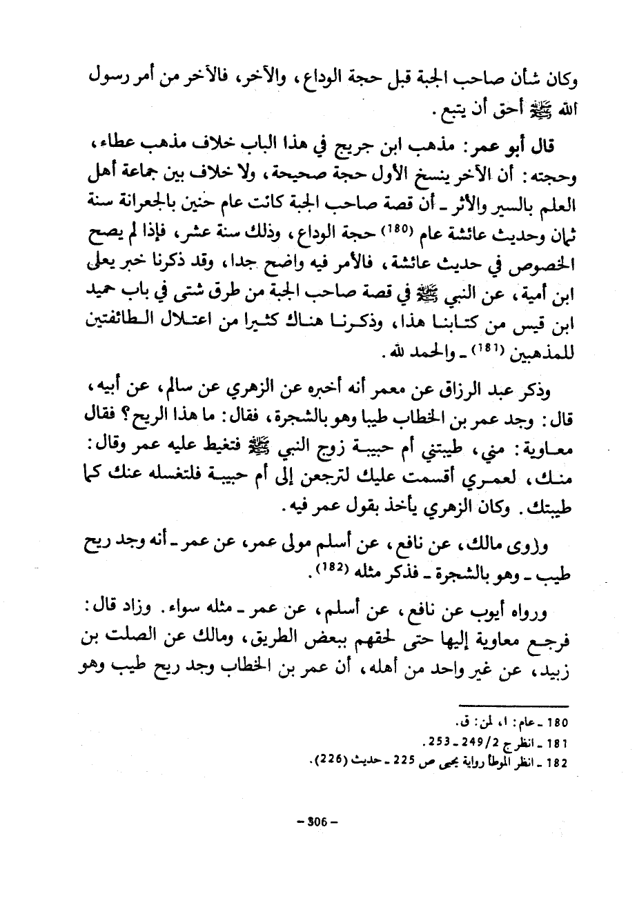 وَكَانَ شَأْنُ صَاحِبِ الْجُبَّةِ قَبْلَ حَجَّةِ الْوَدَاعِ وَالْآخِرُ فَالْآخِرُ مِنْ أَمْرِ رَسُولِ اللَّهِ صَلَّى اللَّهُ عَلَيْهِ وَسَلَّمَ أَحَقُّ أَنْ يُتَّبَعَ قَالَ أَبُو عُمَرَ مَذْهَبُ ابْنِ جُرَيْجٍ فِي هَذَا الْبَابِ خِلَافُ مَذْهَبِ عَطَاءٍ وَحُجَّتُهُ أَنَّ الْآخِرَ يَنْسَخُ الْأَوَّلَ حُجَّةٌ صَحِيحَةٌ وَلَا خِلَافَ بَيْنِ جَمَاعَةِ أَهْلِ الْعِلْمِ بِالسِّيَرِ وَالْأَثَرِ أَنَّ قِصَّةَ صَاحِبِ الْجُبَّةِ كَانَتْ عَامَ حُنَيْنٍ بِالْجِعْرَانَةِ سَنَةَ ثَمَانٍ وَحَدِيثُ عَائِشَةَ عَامَ حِجَّةِ الْوَدَاعِ وَذَلِكَ سَنَةَ عَشْرٍ فَإِذَا لَمْ يَصِحَّ الْخُصُوصُ فِي حَدِيثِ عَائِشَةَ فَالْأَمْرُ فِيهِ وَاضِحٌ جِدًّا وَقَدْ ذكرنا خبر يعلى ابن أُمَيَّةَ عَنِ النَّبِيِّ صَلَّى اللَّهُ عَلَيْهِ وَسَلَّمَ فِي قِصَّةِ صَاحِبِ الْجُبَّةِ مِنْ طُرُقٍ شَتَّى في باب حميد ابن قَيْسٍ مِنْ كِتَابِنَا هَذَا وَذَكَرْنَا هُنَاكَ كَثِيرًا مِنَ اعْتِلَالِ الطَّائِفَتَيْنِ لِلْمَذْهَبَيْنِ وَالْحَمْدُ لِلَّهِ وَذَكَرَ عَبْدُ الرَّزَّاقِ عَنْ مَعْمَرٍ أَنَّهُ أَخْبَرَهُ عَنِ الزُّهْرِيِّ عَنْ سَالِمٍ عَنْ أَبِيهِ قَالَ وَجَدَ عُمَرُ بْنُ الْخَطَّابِ طِيبًا وَهُوَ بِالشَّجَرَةِ فَقَالَ مَا هَذَا الرِّيحُ فَقَالَ مُعَاوِيَةُ مِنِّي طَيَّبَتْنِي أُمُّ حَبِيبَةَ زَوْجُ النَّبِيِّ صَلَّى اللَّهُ عَلَيْهِ وسلم فتغيط عَلَيْهِ عُمَرُ وَقَالَ مِنْكَ لَعَمْرِي أَقْسَمْتُ عَلَيْكَ لَتَرْجِعَنَّ إِلَى أُمِّ حَبِيبَةَ فَلْتَغْسِلْهُ عَنْكَ كَمَا طَيَّبَتْكَ وَكَانَ الزُّهْرِيُّ يَأْخُذُ بِقَوْلِ عُمَرَ فِيهِ وَرَوَى مَالِكٌ عَنْ نَافِعٍ عَنْ أَسْلَمَ مَوْلَى عُمَرَ عَنْ عُمَرَ أَنَّهُ وَجَدَ رِيحَ طِيبٍ وَهُوَ بِالشَّجَرَةِ فَذَكَرَ مِثْلَهُ وَرَوَاهُ أَيُّوبُ عَنْ نَافِعٍ عَنْ أَسْلَمَ عَنْ عُمَرَ مِثْلَهُ سَوَاءً وَزَادَ قَالَ فَرَجَعَ مُعَاوِيَةُ إِلَيْهَا حَتَّى لَحِقَهُمْ بِبَعْضِ الطَّرِيقِ وَمَالِكٌ عَنِ الصَّلْتِ بْنِ زُبَيْدٍ عَنْ غَيْرِ وَاحِدٍ مِنْ أَهْلِهِ أَنَّ عُمَرَ بْنَ الْخَطَّابِ وَجَدَ رِيحَ طِيبٍ وَهُوَ