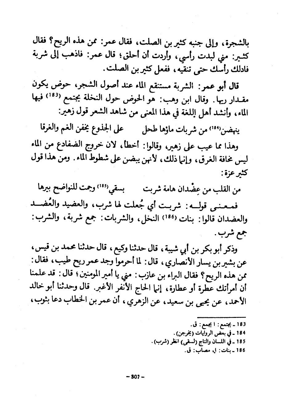 بِالشَّجَرَةِ وَإِلَى جَنْبِهِ كَثِيرُ بْنُ الصَّلْتِ فَقَالَ عُمَرُ مِمَّنْ هَذِهِ الرِّيحُ فَقَالَ كَثِيرٌ مِنِّي لَبَّدْتُ رَأْسِي وَأَرَدْتُ أَنْ أَحْلِقَ قَالَ عُمَرُ فَاذْهَبْ إِلَى شَرَبَةٍ فَادْلُكْ رَأْسَكَ حَتَّى تُنْقِيَهُ فَفَعَلَ كَثِيرُ بْنُ الصَّلْتِ قَالَ أَبُو عُمَرَ الشَّرَبَةُ مُسْتَنْقَعُ الْمَاءِ عِنْدَ أُصُولِ الشَّجَرِ حَوْضٌ يَكُونُ مِقْدَارَ رَيِّهَا وَقَالَ ابْنُ وَهْبٍ هُوَ الْحَوْضُ حَوْلَ النَّخْلَةِ يَجْتَمِعُ فِيهَا الْمَاءُ وَأَنْشَدَ أَهْلُ اللُّغَةِ فِي هَذَا الْمَعْنَى مِنْ شَاهِدِ الشِّعْرِ قَوْلَ زُهَيْرٍ ... يَنْهَضْنَ مِنْ شَرَبَاتٍ مَاؤُهَا طُحُلٌ ... عَلَى الْجُذُوعِ يَخَفْنَ الْغَمَّ وَالْغَرَقَا ... وَهَذَا مِمَّا عِيبَ عَلَى زُهَيْرٍ وَقَالُوا أَخْطَأَ لِأَنَّ خُرُوجَ الضَّفَادِعِ مِنَ الْمَاءِ لَيْسَ مَخَافَةَ الْغَرَقِ وَإِنَّمَا ذَلِكَ لِأَنَّهُنَّ يَبِضْنَ عَلَى شُطُوطِ الْمَاءِ ومن هذا قول كثير عزة ... من القلب مِنْ عِضْدَانِ هَامَةَ شُرِّبَتْ ... بِسَقْيٍ وَجَمَّتْ لِلنَّوَاضِحِ بِيرُهَا ... فَمَعْنَى قَوْلِهِ شُرِّبَتْ أَيْ جُعِلَتْ لَهَا شَرَبٌ وَالْعَضِيدُ وَالْعُضُدُ وَالْعُضْدَانِ قَالُوا بَنَاتُ النَّخْلِ وَالشَّرَبَاتُ جَمْعُ شَرَبَةٍ وَالشُّرَبُ جَمْعُ شُرْبٍ وَذَكَرَ أَبُو بَكْرِ بْنُ أَبِي شَيْبَةَ قَالَ حَدَّثَنَا وكيع قال حدثنا محمد بن قس عَنْ بَشِيرِ بْنِ يَسَارٍ الْأَنْصَارِيِّ قَالَ لَمَّا أَحْرَمُوا وَجَدَ عُمَرُ رِيحَ طِيبٍ فَقَالَ مِمَّنْ هَذِهِ الرِّيحُ فَقَالَ الْبَرَاءُ بْنُ عَازِبٍ مِنِّي يا أمير المؤمنين قَالَ قَدْ عَلِمْنَا أَنَّ امْرَأَتَكَ عَطِرَةٌ أَوْ عَطَّارَةٌ إِنَّمَا الْحَاجُّ الْأَنْفَرُ الْأَغْبَرُ قَالَ وَحَدَّثَنَا أبو خالد الأحمد! عَنْ يَحْيَى بْنِ سَعِيدٍ عَنِ الزُّهْرِيِّ أَنَّ عُمَرَ بْنَ الْخَطَّابِ دَعَا بِثَوْبٍ