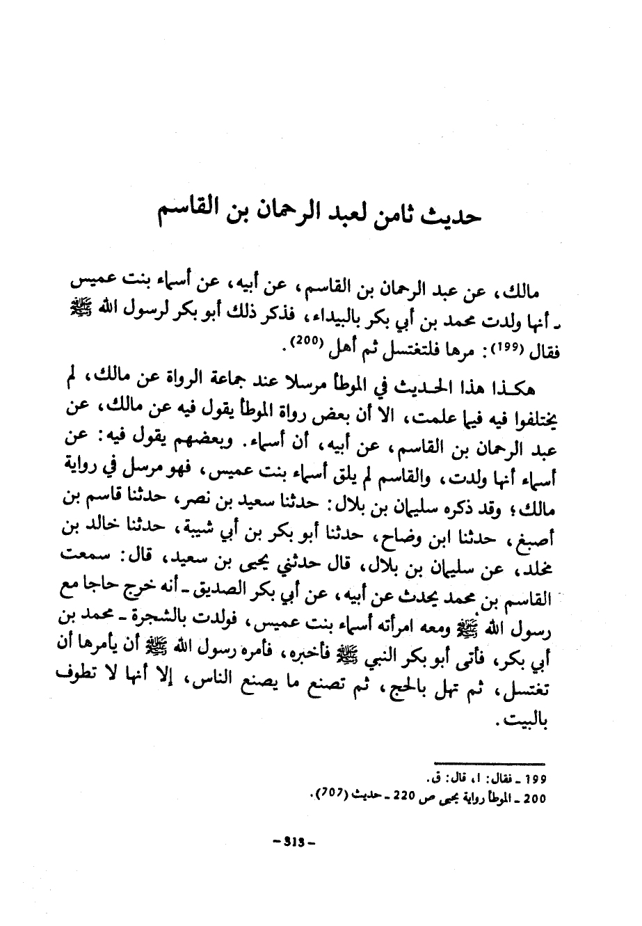 حديث ثامن لعبد الرحمان بن القاسم مالك عن عبد الرحمان بْنِ الْقَاسِمِ عَنْ أَبِيهِ عَنْ أَسْمَاءَ بِنْتِ عُمَيْسٍ أَنَّهَا وَلَدَتْ مُحَمَّدَ بْنَ أَبِي بَكْرٍ بِالْبَيْدَاءِ فَذَكَرَ ذَلِكَ أَبُو بَكْرٍ لِرَسُولِ اللَّهِ صَلَّى اللَّهُ عَلَيْهِ وَسَلَّمَ فَقَالَ مُرْهَا فَلْتَغْتَسِلْ ثُمَّ أَهَلَّ هَكَذَا هَذَا الْحَدِيثُ فِي الْمُوَطَّأِ مُرْسَلًا عِنْدَ جَمَاعَةُ الرُّوَاةِ عَنْ مَالِكٍ لَمْ يَخْتَلِفُوا فِيهِ فِيمَا عَلِمْتُ إِلَّا أَنَّ بَعْضَ رُوَاةِ الْمُوَطَّأِ يَقُولُ فِيهِ عَنْ مَالِكٍ عَنْ عبد الرحمان بْنِ الْقَاسِمِ عَنْ أَبِيهِ أَنَّ أَسْمَاءَ وَبَعْضُهُمْ يَقُولُ فِيهِ عَنْ أَسْمَاءَ أَنَّهَا وَلَدَتْ وَالْقَاسِمُ لَمْ يَلْقَ أَسْمَاءَ بِنْتَ عُمَيْسٍ فَهُوَ مُرْسَلٌ فِي رِوَايَةِ مَالِكٍ وَقَدْ ذَكَرَهُ سُلَيْمَانُ بْنُ بِلَالٍ حَدَّثَنَا سَعِيدُ بْنُ نَصْرٍ حَدَّثَنَا قَاسِمُ بْنُ أصبغ حدثنا بْنُ وَضَّاحٍ حَدَّثَنَا أَبُو بَكْرِ بْنُ أَبِي شَيْبَةَ حَدَّثَنَا خَالِدُ بْنُ مَخْلَدٍ عَنْ سُلَيْمَانُ بْنُ بِلَالٍ قَالَ حَدَّثَنِي يَحْيَى بْنُ سَعِيدٍ قَالَ سَمِعْتُ الْقَاسِمَ بْنَ مُحَمَّدٍ يُحَدِّثُ عَنْ أَبِيهِ عَنْ أَبِي بَكْرٍ الصِّدِّيقِ أَنَّهُ خَرَجَ حَاجًّا مَعَ رَسُولِ اللَّهِ صَلَّى اللَّهُ عَلَيْهِ وَسَلَّمَ وَمَعَهُ امْرَأَتُهُ أَسْمَاءُ بِنْتُ عُمَيْسٍ فَوَلَدَتْ بِالشَّجَرَةِ مُحَمَّدَ بْنَ أَبِي بَكْرٍ فَأَتَى أَبُو بَكْرٍ النَّبِيَّ صَلَّى اللَّهُ عَلَيْهِ وَسَلَّمَ فَأَخْبَرَهُ فَأَمَرَهُ رَسُولُ اللَّهِ صَلَّى اللَّهُ عَلَيْهِ وَسَلَّمَ أَنْ يَأْمُرَهَا أَنْ تَغْتَسِلَ ثُمَّ تُهِلَّ بِالْحَجِّ ثُمَّ تَصْنَعَ مَا يَصْنَعُ النَّاسُ إِلَّا أَنَّهَا لا تطوف