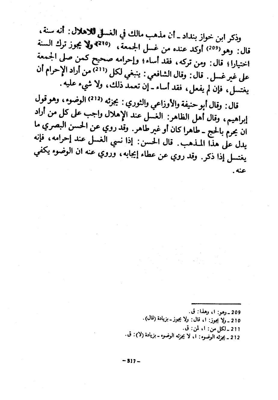 وذكر ابن خواز بنداد أَنَّ مَذْهَبَ مَالِكٍ فِي الْغُسْلِ لِلْإِهْلَالِ أَنَّهُ سُنَّةٌ قَالَ وَهُوَ أَوْكَدُ عِنْدَهُ مِنْ غُسْلِ الْجُمُعَةِ وَلَا يَجُوزُ تَرْكُ السُّنَّةِ اخْتِيَارًا قَالَ وَمَنْ تَرَكَهُ فَقَدْ أَسَاءَ وَإِحْرَامُهُ صَحِيحٌ كَمَنْ صَلَّى الْجُمُعَةَ عَلَى غَيْرِ غُسْلٍ قَالَ وَقَالَ الشَّافِعِيُّ يَنْبَغِي لِكُلِّ مَنْ أَرَادَ الْإِحْرَامَ أَنْ يَغْتَسِلَ فَإِنْ لَمْ يَفْعَلْ فَقَدْ أَسَاءَ إِنْ تَعَمَّدَ ذَلِكَ وَلَا شَيْءَ عَلَيْهِ قَالَ وَقَالَ أَبُو حَنِيفَةَ وَالْأَوْزَاعِيُّ وَالثَّوْرِيُّ يُجْزِئُهُ الْوُضُوءُ وَهُوَ قَوْلُ إِبْرَاهِيمَ وَقَالَ أَهْلُ الظَّاهِرِ الْغُسْلُ عِنْدَ الْإِهْلَالِ وَاجِبٌ عَلَى كُلِّ مَنْ أَرَادَ أَنْ يُحْرِمَ بِالْحَجِّ طَاهِرًا كَانَ أَوْ غَيْرَ طَاهِرٍ وَقَدْ رُوِيَ عَنِ الْحَسَنِ الْبَصْرِيِّ مَا يَدُلُّ عَلَى هَذَا الْمَذْهَبِ قَالَ الْحَسَنُ إِذَا نَسِيَ الْغُسْلَ عِنْدَ إِحْرَامِهِ فَإِنَّهُ يَغْتَسِلُ إِذَا ذَكَرَ وَقَدْ رُوِيَ عَنْ عَطَاءٍ إِيجَابُهُ وَرُوِيَ عَنْهُ أَنَّ الْوُضُوءَ يَكْفِي عَنْهُ