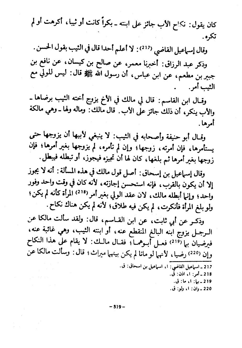 كَانَ يَقُولُ نِكَاحُ الْأَبِ جَائِزٌ عَلَى ابْنَتِهِ بِكْرًا كَانَتْ أَوْ ثَيِّبًا أُكْرِهَتْ أَوْ لَمْ تُكْرَهْ وَقَالَ إِسْمَاعِيلُ الْقَاضِي لَا أَعْلَمُ أَحَدًا قال في الثيب بقول الحسن وذك عَبْدُ الرَّزَّاقِ أَخْبَرَنَا مَعْمَرٌ عَنْ صَالِحِ بْنِ كَيْسَانَ عَنْ نَافِعِ بْنِ جُبَيْرِ بْنِ مُطْعِمٍ عَنْ ابْنِ عَبَّاسٍ أَنَّ رَسُولَ اللَّهِ صَلَّى اللَّهُ عَلَيْهِ وَسَلَّمَ قَالَ لَيْسَ لِلْوَلِيِّ مَعَ الثَّيِّبِ أَمْرٌ وَقَالَ ابْنُ الْقَاسِمِ قَالَ لِي مَالِكٌ فِي الْأَخِ يُزَوِّجُ أُخْتَهُ الثَّيِّبُ بِرِضَاهَا وَالْأَبُ يُنْكِرُ أَنَّ ذَلِكَ جَائِزٌ عَلَى الْأَبِ قَالَ مَالِكٌ وَمَالَهُ وَلَهَا وَهِيَ مَالِكَةُ أَمْرِهَا وَقَالَ أَبُو حَنِيفَةَ وَأَصْحَابُهُ فِي الثَّيِّبِ لَا يَنْبَغِي لِأَبِيهَا أَنْ يُزَوِّجَهَا حَتَّى يَسْتَأْمِرَهَا فَإِنْ أَمَرَتْهُ زَوَّجَهَا وَإِنْ لَمْ تَأْمُرْهُ لَمْ يُزَوِّجْهَا بِغَيْرِ أَمْرِهَا فَإِنْ زَوَّجَهَا بِغَيْرِ أَمْرِهَا ثُمَّ بَلَّغَهَا كَانَ لَهَا أَنْ تُجِيزَهُ فَيَجُوزَ أَوْ تُبْطِلَهُ فَيَبْطُلَ وَقَالَ إِسْمَاعِيلُ بْنُ إِسْحَاقَ أَصْلُ قَوْلِ مَالِكٍ فِي هَذِهِ الْمَسْأَلَةِ أَنَّهُ لَا يَجُوزُ إِلَّا أَنْ يَكُونَ بِالْقُرْبِ فَإِنَّهُ اسْتَحْسَنَ إِجَازَتَهُ لِأَنَّهُ كَانَ فِي وَقْتٍ وَاحِدٍ وَفَوْرٍ وَاحِدٍ وَإِنَّمَا أَبْطَلَهُ مَالِكٌ لِأَنَّ عَقْدَ الْوَلِيِّ بِغَيْرِ أَمْرِ الْمَرْأَةِ كَأَنَّهُ لَمْ يَكُنْ وَلَوْ بَلَغَ الْمَرْأَةَ فَأَنْكَرَتْ لَمْ يَكُنْ فِيهِ طَلَاقٌ لِأَنَّهُ لَمْ يَكُنْ هُنَاكَ نِكَاحٌ وَذُكِرَ عَنْ أَبِي ثَابِتٍ عَنِ ابْنِ الْقَاسِمِ قَالَ وَلَقَدْ سَأَلْتُ مَالِكًا عَنِ الرَّجُلِ يُزَوِّجُ ابْنَهُ الْبَالِغَ الْمُنْقَطِعَ عَنْهُ أَوِ ابْنَتَهُ الثَّيِّبَ وَهِيَ غَائِبَةٌ عَنْهُ فَيَرْضَيَانِ بِمَا فَعَلَ أَبُوهُمَا فَقَالَ مَالِكٌ لَا يُقَامُ عَلَى هَذَا النِّكَاحِ وَإِنْ رَضِيَا لِأَنَّهُمَا لَوْ مَاتَا لَمْ يَكُنْ بَيْنَهُمَا مِيرَاثٌ قَالَ وَسَأَلْتُ مَالِكًا عَنْ