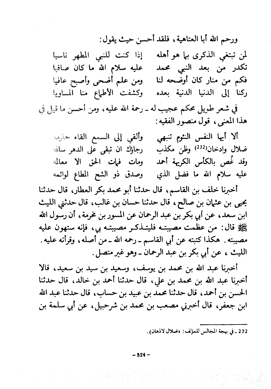 وَرَحِمَ اللَّهُ أَبَا الْعَتَاهِيَةِ فَلَقَدْ أَحْسَنَ حَيْثُ يَقُولُ ... لِمَنْ تَبْتَغِي الذِّكْرَى بِمَا هُوَ أَهْلُهُ ... إِذَا كُنْتَ لِلنَّبِيِّ الْمُطَهَّرِ نَاسِيَا ... ... ... تَكَدَّرْ مِنْ بَعْدِ النَّبِيِّ مُحَمَّدٍ ... عَلَيْهِ سَلَامُ اللَّهِ مَا كَانَ صَافِيَا ... ... فَكَمْ مِنْ مَنَارٍ كَانَ أَوْضَحَهُ لَنَا ... وَمِنْ عِلْمٍ أَضْحَى وَأَصْبَحَ عَافِيَا ... ... رَكَنَّا إِلَى الدُّنْيَا الدَّنِيَّةِ بَعْدَهُ ... وَكَشَّفَتِ الطِّمَاعُ مِنَّا الْمَسَاوِيَا ... فِي شِعْرٍ طَوِيلٍ مُحْكَمٍ عَجِيبٍ لَهُ رَحْمَةُ اللَّهِ عَلَيْهِ وَمِنْ أَحْسَنِ مَا قِيلَ فِي هَذَا الْمَعْنَى قَوْلُ مَنْصُورٍ الْفَقِيهِ ... أَلَا أيها النفس النئوم تنبهي ... وألقي إِلَيَّ السَّمْعَ إِلْقَاءَ حَازِمَهْ ... ... ضَلَالٌ وَإِدْخَانٌ وَظَنٌّ مُكَذَّبُ ... رَجَاؤُكِ أَنْ تَبْقَيْ عَلَى الدَّهْرِ سَالِمَهْ ... ... وَقَدْ غُصَّ بِالْكَأْسِ الْكَرِيهَةِ أَحْمَدُ ... وَمَاتَ فَمَاتَ الْحَقُّ إِلَّا مَعَالِمَهْ ... ... ... عَلَيْهِ سَلَامُ اللَّهِ مَا فُضِّلَ الَّذِي ... وَصَدَّقَ ذُو الشُّحِّ الْمُطَاعُ لِوَائِمَهْ ... أَخْبَرَنَا خَلَفُ بْنُ الْقَاسِمِ قَالَ حَدَّثَنَا أَبُو مُحَمَّدٍ بَكْرٌ الْعَطَّارُ قَالَ حَدَّثَنَا يَحْيَى بْنُ عُثْمَانَ بْنِ صَالِحٍ قَالَ حَدَّثَنَا حَسَّانُ بْنُ غالب قال حدثني الليث ابن سَعْدٍ عَنْ أَبِي بَكْرِ بْنِ عَبْدِ الرَّحْمَنِ عَنْ الْمِسْوَرِ بْنِ مَخْرَمَةَ أَنَّ رَسُولَ اللَّهِ قَالَ مَنْ عَظُمَتْ مُصِيبَتُهُ فَلْيَتَذَكَّرْ مُصِيبَتَهُ بِي فَإِنَّهُ سَتَهُونُ عَلَيْهِ مُصِيبَتُهُ هَكَذَا كَتَبْتُهُ عَنْ أَبِي الْقَاسِمِ رَحِمَهُ اللَّهُ مِنْ أَصْلِهِ وَقَرَأْتُهُ عَلَيْهِ اللَّيْثُ عَنْ أَبِي بَكْرِ بْنِ عَبْدِ الرحمان وَهُوَ غَيْرُ مُتَّصِلٍ أَخْبَرَنَا عَبْدُ اللَّهِ بْنُ مُحَمَّدِ بْنِ يُوسُفَ وَسَعِيدُ بْنُ سَيِّدِ بْنِ سَعِيدٍ قَالَا أَخْبَرَنَا عَبْدُ اللَّهِ بْنُ مُحَمَّدِ بْنِ عَلِيٍّ قَالَ حَدَّثَنَا أَحْمَدُ بْنُ خَالِدٍ قَالَ حَدَّثَنَا الْحَسَنُ بْنُ أَحْمَدَ قَالَ حَدَّثَنَا مُحَمَّدُ بْنُ عُبَيْدِ بْنِ حِسَابٍ قَالَ حَدَّثَنَا عبد الله ابن جَعْفَرٍ قَالَ أَخْبَرَنِي مُصْعَبُ بْنُ مُحَمَّدِ بْنِ شرحبيل عن أبي سلمة بن