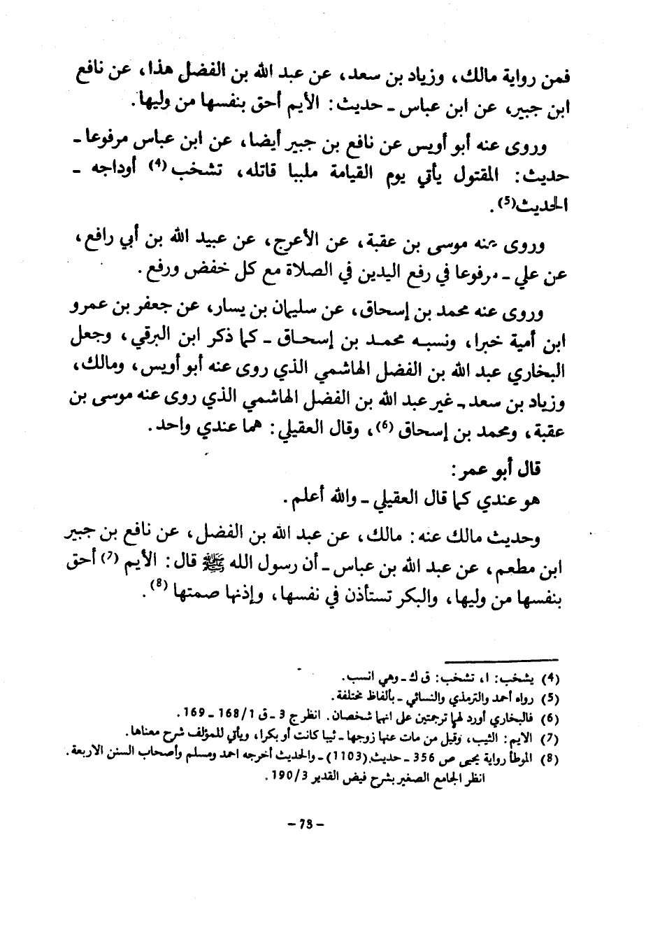 فَمِنْ رِوَايَةِ مَالِكٍ وَزِيَادِ بْنِ سَعْدٍ عَنْ عَبْدِ اللَّهِ بْنِ الْفَضْلِ هَذَا عَنْ نَافِعِ ابن جُبَيْرٍ عَنِ ابْنِ عَبَّاسٍ حَدِيثُ الْأَيِّمُ أَحَقُّ بِنَفْسِهَا مِنْ وَلِيِّهَا وَرَوَى عَنْهُ أَبُو أُوَيْسٍ عَنْ نَافِعِ بْنِ جُبَيْرٍ أَيْضًا عَنِ ابْنِ عَبَّاسٍ مَرْفُوعًا حَدِيثَ الْمَقْتُولُ يَأْتِي يَوْمَ الْقِيَامَةِ مُلَبِّبًا قَاتِلَهُ تَشْخَبُ أَوْدَاجُهُ الْحَدِيثَ وَرَوَى عَنْهُ مُوسَى بْنُ عُقْبَةَ عَنِ الْأَعْرَجِ عَنْ عُبَيْدِ اللَّهِ بْنِ أَبِي رَافِعٍ عَنْ عَلِيٍّ مَرْفُوعًا فِي رَفْعِ الْيَدَيْنِ فِي الصَّلَاةِ مَعَ كُلِّ خَفْضٍ وَرَفْعٍ وَرَوَى عَنْهُ مُحَمَّدُ بْنُ إِسْحَاقَ عَنْ سُلَيْمَانَ بْنِ يَسَارٍ عَنْ جَعْفَرِ بْنِ عمرو ابن أُمَيَّةَ خَبَرًا وَنَسَبَهُ مُحَمَّدُ بْنُ إِسْحَاقَ كَمَا ذَكَرَ ابْنُ الْبَرْقِيِّ وَجَعَلَ الْبُخَارِيُّ عَبْدَ اللَّهِ بْنَ الْفَضْلِ الْهَاشِمِيَّ الَّذِي رَوَى عَنْهُ أَبُو أُوَيْسٍ وَمَالِكٌ وَزِيَادُ بْنُ سَعْدٌ غَيْرَ عَبْدِ الله بن الفضل الهاشمي الذي روى عنه مُوسَى بْنُ عُقْبَةَ وَمُحَمَّدُ بْنُ إِسْحَاقَ وَقَالَ الْعُقَيْلِيُّ هُمَا عِنْدِي وَاحِدٌ قَالَ أَبُو عُمَرَ هُوَ عِنْدِي كَمَا قَالَ الْعُقَيْلِيُّ وَاللَّهُ أَعْلَمُ وَحَدِيثُ مَالِكٍ عَنْهُ مَالِكٌ عَنْ عَبْدِ اللَّهِ بن الفضل عن نافع بن جبير ابن مُطْعِمٍ عَنْ عَبْدِ اللَّهِ بْنِ عَبَّاسٍ أَنَّ رَسُولَ اللَّهِ صَلَّى اللَّهُ عَلَيْهِ وسلم قال الأيم أحق بنفسها من وليها والبكر تستأذن فِي نَفْسِهَا وَإِذْنُهَا صَمْتُهَا