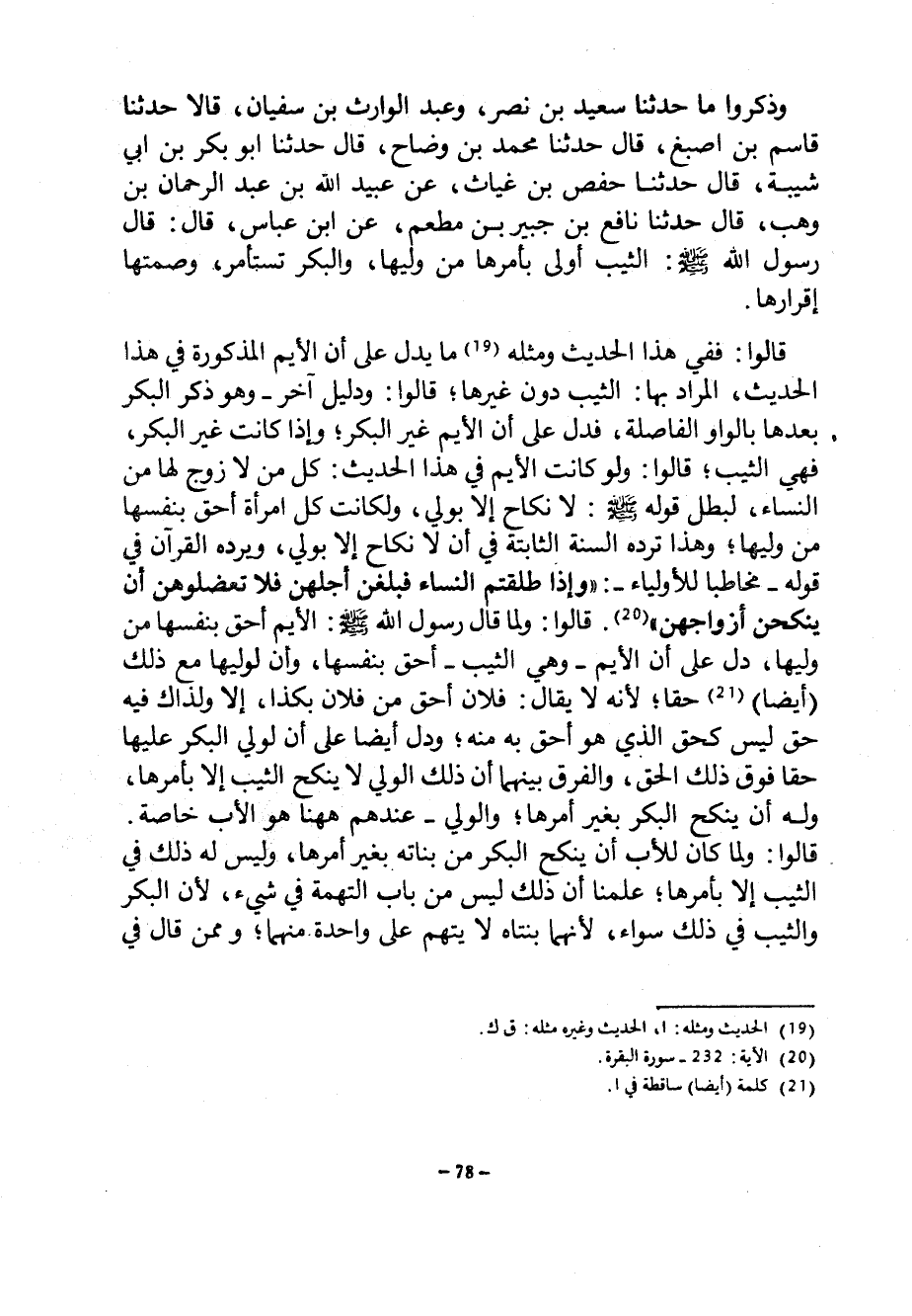 وَذَكَرُوا مَا حَدَّثَنَا سَعِيدُ بْنُ نَصْرٍ وَعَبْدُ الْوَارِثِ بْنُ سُفْيَانَ قَالَا حَدَّثَنَا قَاسِمُ بْنُ أَصْبَغَ قَالَ حَدَّثَنَا مُحَمَّدُ بْنُ وَضَّاحٍ قَالَ حَدَّثَنَا أَبُو بكر بن أبي شبة قَالَ حَدَّثَنَا حَفْصُ بْنُ غِيَاثٍ عَنْ عُبَيْدِ الله بن عبد الرحمان بْنِ وَهْبٍ قَالَ حَدَّثَنَا نَافِعِ بْنِ جُبَيْرِ بْنِ مُطْعِمٍ عَنِ ابْنِ عَبَّاسٍ قَالَ قَالَ رَسُولُ اللَّهِ صَلَّى اللَّهُ عَلَيْهِ وَسَلَّمَ الثَّيِّبُ أَوْلَى بِأَمْرِهَا مِنْ وَلِيِّهَا وَالْبِكْرُ تُسْتَأْمَرُ وَصَمْتُهَا إِقْرَارُهَا قَالُوا فَفِي هَذَا الْحَدِيثِ وَمِثْلِهِ مَا يَدُلُّ عَلَى أَنَّ الْأَيِّمَ الْمَذْكُورَةَ فِي هَذَا الْحَدِيثِ الْمُرَادُ بِهَا الثَّيِّبُ دُونَ غَيْرِهَا قَالُوا وَدَلِيلٌ آخَرُ وَهُوَ ذِكْرُ الْبِكْرِ بَعْدَهَا بِالْوَاوِ الْفَاصِلَةِ فَدَلَّ عَلَى أَنَّ الْأَيِّمَ غَيْرُ الْبِكْرِ وَإِذَا كَانَتْ غَيْرَ الْبِكْرِ فَهِيَ الثَّيِّبُ قَالُوا وَلَوْ كَانَتِ الْأَيِّمُ فِي هَذَا الْحَدِيثِ كُلَّ مَنْ لَا زَوْجَ لَهَا مِنَ النِّسَاءِ لَبَطَلَ قوله صلى الله عليه وسلم لا نكاح إِلَّا بِوَلِيٍّ وَلَكَانَتْ كُلُّ امْرَأَةٍ أَحَقَّ بِنَفْسِهَا مِنْ وَلِيِّهَا وَهَذَا تَرُدُّهُ السُّنَّةُ الثَّابِتَةُ فِي أَنْ لَا نِكَاحَ إِلَّا بِوَلِيٍّ وَيَرُدُّهُ الْقُرْآنُ فِي قَوْلِهِ مُخَاطِبًا لِلْأَوْلِيَاءِ وَإِذَا طَلَّقْتُمُ النِّسَاءَ فَبَلَغْنَ أَجَلَهُنَّ فَلَا تَعْضُلُوهُنَّ أَنْ يَنْكِحْنَ أَزْوَاجَهُنَّ قَالُوا وَلَمَّا قَالَ رَسُولُ اللَّهِ صَلَّى اللَّهُ عَلَيْهِ وَسَلَّمَ الأيم أحق بنفسها من وليها دَلَّ عَلَى أَنَّ الْأَيِّمَ وَهِيَ الثَّيِّبُ أَحَقُّ بِنَفْسِهَا وَأَنَّ لِوَلِيِّهَا مَعَ ذَلِكَ (أَيْضًا) حَقًّا لِأَنَّهُ لَا يُقَالُ فُلَانٌ أَحَقُّ مِنْ فُلَانٍ بِكَذَا إِلَّا وَلِذَاكَ فِيهِ حَقٌّ لَيْسَ كَحَقِّ الَّذِي هُوَ أَحَقُّ بِهِ مِنْهُ وَدَلَّ أَيْضًا عَلَى أَنَّ لِوَلِيِّ الْبِكْرِ عَلَيْهَا حَقًّا فَوْقَ ذَلِكَ الْحَقِّ وَالْفَرْقُ بَيْنَهُمَا أَنَّ ذَلِكَ الْوَلِيَّ لَا يُنْكِحُ الثَّيِّبَ إِلَّا بِأَمْرِهَا وَلَهُ أَنْ يُنْكِحَ الْبِكْرَ بِغَيْرِ أَمْرِهَا وَالْوَلِيُّ عِنْدَهُمْ هَهُنَا هُوَ الْأَبُ خَاصَّةً قَالُوا وَلَمَّا كَانَ لِلْأَبِ أَنْ يُنْكِحَ الْبِكْرَ مِنْ بَنَاتِهِ بِغَيْرِ أَمْرِهَا وَلَيْسَ لَهُ ذَلِكَ فِي الثَّيِّبِ إِلَّا بِأَمْرِهَا عَلِمْنَا أَنَّ ذَلِكَ لَيْسَ مِنْ بَابِ التُّهْمَةِ فِي شَيْءٍ لِأَنَّ الْبِكْرَ وَالثَّيِّبَ فِي ذَلِكَ سَوَاءٌ لِأَنَّهُمَا بِنْتَاهُ لَا يُتَّهَمُ عَلَى وَاحِدَةٍ مِنْهُمَا وَمِمَّنْ قَالَ فِي