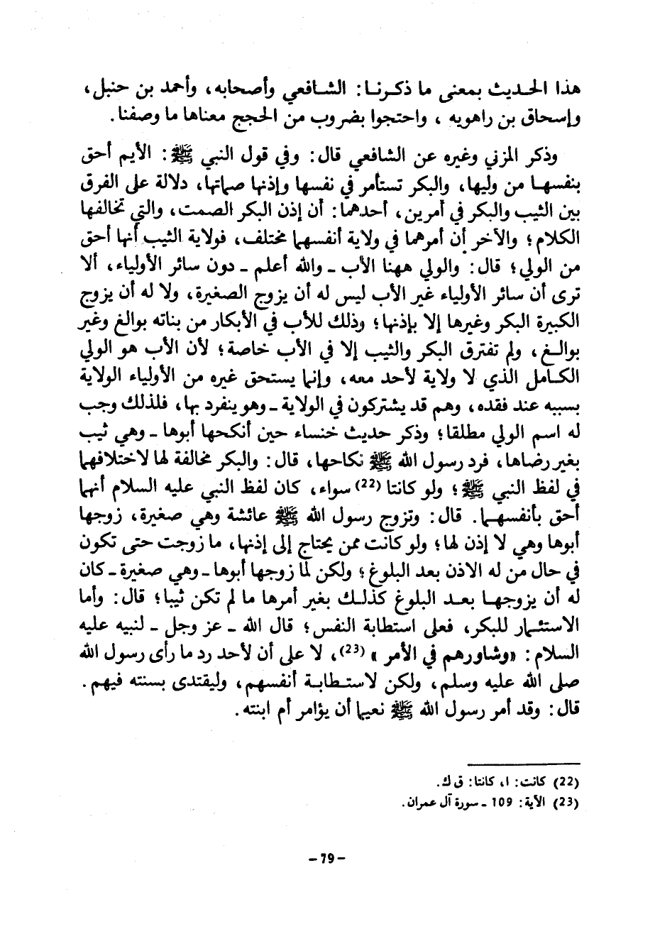 هَذَا الْحَدِيثِ بِمَعْنَى مَا ذَكَرْنَا الشَّافِعِيُّ وَأَصْحَابُهُ وَأَحْمَدُ بْنُ حَنْبَلٍ وَإِسْحَاقُ بْنُ رَاهَوَيْهِ وَاحْتَجُّوا بِضُرُوبٍ مِنَ الْحُجَجِ مَعْنَاهَا مَا وَصَفْنَا وَذَكَرَ الْمُزَنِيُّ وَغَيْرُهُ عَنِ الشَّافِعِيِّ قَالَ وَفِي قَوْلِ النَّبِيِّ صَلَّى اللَّهُ عَلَيْهِ وَسَلَّمَ الْأَيِّمُ أَحَقُّ بِنَفْسِهَا مِنْ وَلِيِّهَا وَالْبِكْرُ تُسْتَأْمَرُ فِي نَفْسِهَا وَإِذْنُهَا صُمَاتُهَا دَلَالَةٌ عَلَى الْفَرْقِ بَيْنَ الثَّيِّبِ وَالْبِكْرِ فِي أَمْرَيْنِ أَحَدُهُمَا أَنَّ إِذْنَ الْبِكْرِ الصَّمْتُ وَالَّتِي تُخَالِفُهَا الْكَلَامُ وَالْآخَرُ أَنَّ أَمْرَهُمَا فِي وِلَايَةِ أَنْفُسِهِمَا مُخْتَلِفٌ فَوِلَايَةُ الثَّيِّبِ أَنَّهَا أحق من الولي قال والولي ههنا الْأَبُ وَاللَّهُ أَعْلَمُ دُونَ سَائِرِ الْأَوْلِيَاءِ أَلَا تَرَى أَنَّ سَائِرَ الْأَوْلِيَاءِ غَيْرَ الْأَبِ لَيْسَ لَهُ أَنْ يُزَوِّجَ الصَّغِيرَةَ وَلَا لَهُ أَنْ يُزَوِّجَ الْكَبِيرَةَ الْبِكْرَ وَغَيْرَهَا إِلَّا بِإِذْنِهَا وَذَلِكَ لِلْأَبِ فِي الْأَبْكَارِ مِنْ بَنَاتِهِ بِوَالِغَ وَغَيْرَ بِوَالِغَ وَلَمْ تَفْتَرِقِ الْبِكْرُ وَالثَّيِّبُ إِلَّا فِي الْأَبِ خَاصَّةً لِأَنَّ الْأَبَ هُوَ الْوَلِيُّ الْكَامِلُ الَّذِي لَا وَلَايَةَ لِأَحَدٍ مَعَهُ وَإِنَّمَا يَسْتَحِقُّ غَيْرُهُ مِنَ الْأَوْلِيَاءِ الْوَلَايَةَ بِسَبَبِهِ عِنْدَ فَقْدِهِ وَهُمْ قَدْ يَشْتَرِكُونَ فِي الْوَلَايَةِ وَهُوَ يَنْفَرِدُ بِهَا فَلِذَلِكَ وَجَبَ لَهُ اسْمُ الْوَلِيِّ مُطْلَقًا وَذَكَرَ حَدِيثَ خَنْسَاءَ حِينَ أَنْكَحَهَا أَبُوهَا وَهِيَ ثَيِّبٌ بِغَيْرِ رِضَاهَا فَرَدَّ رَسُولُ اللَّهِ صَلَّى اللَّهُ عَلَيْهِ وَسَلَّمَ نِكَاحَهَا قَالَ وَالْبِكْرُ مُخَالِفَةٌ لَهَا لِاخْتِلَافِهِمَا فِي لَفْظِ النَّبِيِّ صَلَّى اللَّهُ عَلَيْهِ وَسَلَّمَ وَلَوْ كَانَتَا سَوَاءً كَانَ لَفْظُ النَّبِيِّ عَلَيْهِ السَّلَامُ أَنَّهُمَا أَحَقُّ بِأَنْفُسِهِمَا قَالَ وَتَزَوَّجَ رَسُولُ اللَّهِ صَلَّى اللَّهُ عَلَيْهِ وَسَلَّمَ عَائِشَةَ وَهِيَ صَغِيرَةٌ زَوَّجَهَا أَبُوهَا وَهِيَ لَا إِذْنَ لَهَا وَلَوْ كَانَتْ مِمَّنْ يُحْتَاجُ إِلَى إِذْنِهَا مَا زُوِّجَتْ حَتَّى تَكُونَ فِي حَالِ مَنْ لَهُ الْإِذْنُ بَعْدَ الْبُلُوغِ وَلَكِنْ لَمَّا زَوَّجَهَا أَبُوهَا وَهِيَ صَغِيرَةٌ كَانَ لَهُ أَنْ يُزَوِّجَهَا بَعْدَ الْبُلُوغِ كَذَلِكَ بِغَيْرِ أَمْرِهَا مَا لَمْ تَكُنْ ثَيِّبًا قَالَ وَأَمَّا الِاسْتِئْمَارُ لِلْبِكْرِ فَعَلَى اسْتِطَابَةِ النَّفْسِ قَالَ اللَّهُ عَزَّ وَجَلَّ لِنَبِيِّهِ عَلَيْهِ السَّلَامُ وَشَاوِرْهُمْ فِي الْأَمْرِ لَا عَلَى أَنَّ لِأَحَدٍ رَدَّ مَا رَأَى رَسُولَ اللَّهِ صَلَّى اللَّهُ عَلَيْهِ وَسَلَّمَ وَلَكِنْ لِاسْتِطَابَةِ أَنْفُسِهِمْ وَلِيُقْتَدَى بِسُنَّتِهِ فِيهِمْ قَالَ وَقَدْ أَمَرَ رَسُولُ اللَّهِ صَلَّى اللَّهُ عَلَيْهِ وَسَلَّمَ نُعَيْمًا أَنْ يُؤَامِرَ أُمَّ ابْنَتِهِ