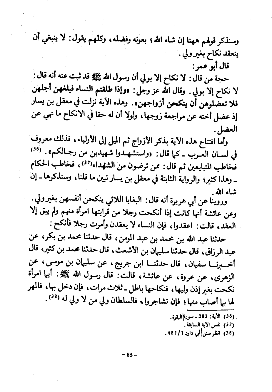 وسنذكر قولهم ههنا إِنْ شَاءَ اللَّهُ بِعَوْنِهِ وَفَضْلِهِ وَكُلُّهُمْ يَقُولُ لَا يَنْبَغِي أَنْ يَنْعَقِدَ نِكَاحٌ بِغَيْرٍ وَلِيٍّ قَالَ أَبُو عُمَرَ حُجَّةُ مَنْ قَالَ لَا نِكَاحَ إِلَّا بِوَلِيٍّ أَنَّ رَسُولَ اللَّهِ صَلَّى اللَّهُ عَلَيْهِ وَسَلَّمَ قَدْ ثَبَتَ عَنْهُ أَنَّهُ قَالَ لَا نِكَاحَ إِلَّا بِوَلِيٍّ وَقَالَ اللَّهُ عز وجل وإذا طلقتم النساء فبلغهن أَجَلَهُنَّ فَلَا تَعْضُلُوهُنَّ أَنْ يَنْكِحْنَ أَزْوَاجَهُنَّ وَهَذِهِ الْآيَةُ نَزَلَتْ فِي مَعْقِلِ بْنِ يَسَارٍ إِذْ عَضَلَ أُخْتَهُ عَنْ مُرَاجَعَةِ زَوْجِهَا وَلَوْلَا أَنَّ لَهُ حَقًّا فِي الْإِنْكَاحِ مَا نُهِيَ عَنِ الْعَضْلِ وَأَمَّا افْتِتَاحُ هَذِهِ الْآيَةِ بِذِكْرِ الزَّوَاجِ ثُمَّ الْمَيْلِ إِلَى الْأَوْلِيَاءِ فَذَلِكَ مَعْرُوفٌ فِي لِسَانِ الْعَرَبِ كَمَا قَالَ وَاسْتَشْهِدُوا شَهِيدَيْنِ مِنْ رِجَالِكُمْ فَخَاطَبَ الْمُتَبَايِعِينَ ثُمَّ قَالَ مِمَّنْ تَرْضَوْنَ مِنَ الشُّهَدَاءِ فَخَاطَبَ الْحُكَّامَ وَهَذَا كَثِيرٌ وَالرِّوَايَةُ الثَّابِتَةُ فِي مَعْقِلِ بْنِ يَسَارٍ تُبَيِّنُ مَا قُلْنَا وَسَنَذْكُرُهَا إِنْ شَاءَ اللَّهُ وَرُوِّينَا عَنْ أَبِي هُرَيْرَةَ أَنَّهُ قَالَ الْبَغَايَا اللَّائِي يُنْكِحْنَ أَنْفُسَهُنَّ بِغَيْرِ وَلِيٍّ وَعَنْ عَائِشَةَ أَنَّهَا كَانَتْ إِذَا أَنْكَحَتْ رَجُلًا مِنْ قَرَابَتِهَا امْرَأَةً مِنْهُمْ وَلَمْ يَبْقَ إِلَّا الْعَقْدُ قَالَتْ اعْقِدُوا فَإِنَّ النِّسَاءَ لَا يَعْقِدْنَ وَأَمَرَتْ رَجُلًا فَأَنْكَحَ حَدَّثَنَا عَبْدُ اللَّهِ بْنُ مُحَمَّدِ بْنِ عَبْدِ المؤمن قَالَ حَدَّثَنَا مُحَمَّدُ بْنُ بَكْرٍ عَنْ عَبْدِ الرَّزَّاقِ قَالَ حَدَّثَنَا سُلَيْمَانُ بْنُ الْأَشْعَثِ قَالَ حَدَّثَنَا مُحَمَّدُ بْنُ كَثِيرٍ قَالَ أَخْبَرَنَا سُفْيَانُ قَالَ حَدَّثَنَا ابْنِ جُرَيْجٍ عَنْ سُلَيْمَانَ بْنِ مُوسَى عَنْ الزُّهْرِيِّ عَنْ عُرْوَةَ عَنْ عَائِشَةَ قَالَتْ قَالَ رَسُولُ اللَّهِ صَلَّى اللَّهُ عَلَيْهِ وَسَلَّمَ أيما امرأة نكحت بغير إذن وليها فَنِكَاحُهَا بَاطِلٌ ثَلَاثَ مَرَّاتٍ فَإِنْ دَخَلَ بِهَا فَالْمَهْرُ لَهَا بِمَا أَصَابَ مِنْهَا فَإِنْ تَشَاجَرُوا فالسلطان ولي من ولا ولي له