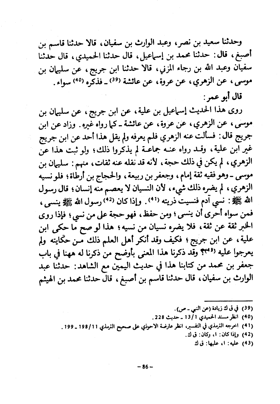 وَحَدَّثَنَا سَعِيدُ بْنُ نَصْرٍ وَعَبْدُ الْوَارِثِ بْنُ سُفْيَانَ قَالَا حَدَّثَنَا قَاسِمُ بْنُ أَصْبَغَ قَالَ حَدَّثَنَا مُحَمَّدُ بْنُ إِسْمَاعِيلَ قَالَ حَدَّثَنَا الْحُمَيْدِيُّ قَالَ حَدَّثَنَا سُفْيَانُ وَعَبْدُ اللَّهِ بْنُ رَجَاءٍ الْمُزَنِيُّ قَالَ حَدَّثَنَا ابْنِ جُرَيْجٍ عَنْ سُلَيْمَانَ بْنِ مُوسَى عَنْ الزُّهْرِيِّ عَنْ عُرْوَةَ عَنْ عَائِشَةَ فَذَكَرَهُ سَوَاءً قَالَ أَبُو عُمَرَ رَوَى هَذَا الْحَدِيثَ إِسْمَاعِيلُ بْنُ عُلَيَّةَ عَنِ ابْنِ جُرَيْجٍ عَنْ سُلَيْمَانَ بْنِ مُوسَى عَنِ الزُّهْرِيِّ عَنْ عُرْوَةَ عَنْ عَائِشَةَ كَمَا رَوَاهُ غَيْرُهُ وَزَادَ عَنِ ابْنِ جُرَيْجٍ قَالَ فَسَأَلْتُ عَنْهُ الزُّهْرِيَّ فَلَمْ يَعْرِفْهُ وَلَمْ يَقُلْ هَذَا أَحَدٌ عَنِ ابْنِ جُرَيْجٍ غَيْرَ ابْنِ عُلَيَّةَ وَقَدْ رَوَاهُ عَنْهُ جَمَاعَةٌ لَمْ يَذْكُرُوا ذَلِكَ وَلَوْ ثَبَتَ هَذَا عَنِ الزُّهْرِيِّ لَمْ يَكُنْ فِي ذَلِكَ حُجَّةٌ لِأَنَّهُ قَدْ نَقَلَهُ عَنْهُ ثِقَاتٌ مِنْهُمْ سُلَيْمَانُ بْنُ مُوسَى وَهُوَ فَقِيهٌ ثِقَةٌ إِمَامٌ وَجَعْفَرُ بْنُ رَبِيعَةَ وَالْحَجَّاجُ بْنُ أَرْطَأَةَ فلو نسيه الزهري لم يضره ذلك شَيْءٍ لِأَنَّ النِّسْيَانَ لَا يُعْصَمُ مِنْهُ إِنْسَانٌ قَالَ رَسُولُ اللَّهِ صَلَّى اللَّهُ عَلَيْهِ وَسَلَّمَ نَسِيَ آدَمُ فَنَسِيَتْ ذُرِّيَّتُهُ وَإِذَا كَانَ رَسُولُ اللَّهِ صَلَّى اللَّهُ عَلَيْهِ وَسَلَّمَ يَنْسَى فَمَنْ سِوَاهُ أَحْرَى أَنْ يَنْسَى وَمَنْ حَفِظَ فَهُوَ حُجَّةٌ عَلَى مَنْ نَسِيَ فَإِذَا رَوَى الْخَبَرَ ثِقَةٌ عَنْ ثِقَةٍ فَلَا يَضُرُّهُ نِسْيَانُ مَنْ نَسِيَهُ هَذَا لَوْ صَحَّ مَا حَكَى ابْنُ عُلَيَّةَ عَنِ ابْنُ جُرَيْجٍ فَكَيْفَ وَقَدْ أَنْكَرَ أَهْلُ الْعِلْمِ ذَلِكَ مِنْ حِكَايَتِهِ وَلَمْ يُعَرِّجُوا عَلَيْهِ وَقَدْ ذَكَرْنَا هَذَا الْمَعْنَى بِأَوْضَحَ مِنْ ذِكْرِنَا لَهُ هَهُنَا فِي بَابِ جَعْفَرِ بْنِ مُحَمَّدٍ مِنْ كِتَابِنَا هَذَا فِي حَدِيثِ الْيَمِينِ مَعَ الشَّاهِدِ حَدَّثَنَا عَبْدُ الْوَارِثِ بْنُ سُفْيَانَ قَالَ حَدَّثَنَا قَاسِمُ بْنُ أَصْبَغَ قَالَ حَدَّثَنَا مُحَمَّدُ بْنُ الْهَيْثَمِ