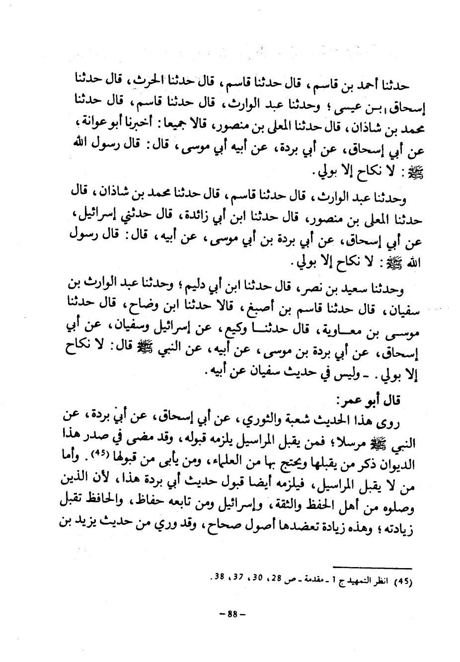 حَدَّثَنَا أَحْمَدُ بْنُ قَاسِمٍ قَالَ حَدَّثَنَا قَاسِمُ قال حدثنا الحرث قَالَ حَدَّثَنَا إِسْحَاقُ بْنُ عِيسَى وَحَدَّثَنَا عَبْدُ الْوَارِثِ قَالَ حَدَّثَنَا قَاسِمٌ قَالَ حَدَّثَنَا مُحَمَّدُ بْنُ شَاذَانَ قَالَ حَدَّثَنَا الْمُعَلَّى بْنُ مَنْصُورٍ قَالَا جَمِيعًا أَخْبَرَنَا أَبُو عَوَانَةَ عَنْ أَبِي إِسْحَاقَ عَنْ أَبِي بُرْدَةَ عَنْ أَبِيهِ أَبِي مُوسَى قَالَ قَالَ رَسُولُ اللَّهِ صَلَّى اللَّهُ عَلَيْهِ وَسَلَّمَ لَا نِكَاحَ إِلَّا بِوَلِيٍّ وَحَدَّثَنَا عَبْدُ الْوَارِثِ قَالَ حَدَّثَنَا قَاسِمٌ قَالَ حَدَّثَنَا مُحَمَّدُ بْنُ شَاذَانَ قَالَ حَدَّثَنَا الْمُعَلَّى بْنُ مَنْصُورٍ قَالَ حَدَّثَنَا ابْنُ أَبِي زَائِدَةَ قَالَ حَدَّثَنِي إِسْرَائِيلُ عَنْ أَبِي إِسْحَاقَ عَنْ أَبِي بُرْدَةَ بْنِ أَبِي مُوسَى عَنْ أَبِيهِ قَالَ قَالَ رَسُولُ اللَّهِ صَلَّى اللَّهُ عَلَيْهِ وَسَلَّمَ لَا نِكَاحَ إِلَّا بِوَلِيٍّ وَحَدَّثَنَا سَعِيدُ بْنُ نَصْرٍ قَالَ حَدَّثَنَا ابْنُ أَبِي دُلَيْمٍ وَحَدَّثَنَا عَبْدُ الْوَارِثِ بْنُ سُفْيَانَ قَالَ حَدَّثَنَا قَاسِمُ بْنُ أَصْبَغَ قَالَا حَدَّثَنَا ابْنُ وَضَّاحٍ قَالَ حَدَّثَنَا مُوسَى بْنُ مُعَاوِيَةَ قَالَ حَدَّثَنَا وَكِيعٌ عَنْ إِسْرَائِيلَ وَسُفْيَانُ عَنْ أَبِي إِسْحَاقَ عَنْ أَبِي بُرْدَةَ بْنِ مُوسَى عَنْ أَبِيهِ عَنِ النَّبِيِّ صَلَّى اللَّهُ عَلَيْهِ وسلم قال لا نِكَاحَ إِلَّا بِوَلِيٍّ وَلَيْسَ فِي حَدِيثِ سُفْيَانَ عَنْ أَبِيهِ قَالَ أَبُو عُمَرَ رَوَى هَذَا الْحَدِيثَ شُعْبَةُ وَالثَّوْرِيُّ عَنْ أَبِي إِسْحَاقَ عَنْ أَبِي بُرْدَةَ عَنْ النَّبِيِّ صَلَّى اللَّهُ عَلَيْهِ وَسَلَّمَ مُرْسَلًا فَمَنْ يَقْبَلُ الْمَرَاسِيلَ يَلْزَمُهُ قَبُولُهُ وَقَدْ مَضَى فِي صَدْرِ هَذَا الدِّيوَانِ ذِكْرُ مَنْ يَقْبَلُهَا وَيَحْتَجُّ بِهَا مِنَ الْعُلَمَاءِ وَمَنْ يَأْبَى مِنْ قَبُولِهَا وَأَمَّا مَنْ لَا يَقْبَلُ الْمَرَاسِيلَ فَيَلْزَمُهُ أَيْضًا قَبُولُ حَدِيثِ أَبِي بُرْدَةَ هذا لأن الذين وصوله مِنْ أَهْلِ الْحِفْظِ وَالثِّقَةِ وَإِسْرَائِيلُ وَمَنْ تَابَعَهُ حُفَّاظٌ وَالْحَافِظُ تُقْبَلُ زِيَادَتُهُ وَهَذِهِ زِيَادَةٌ تُعَضِّدُهَا أُصُولٌ صِحَاحٌ وَقَدْ رُوِيَ مِنْ حَدِيثِ يَزِيدَ بن