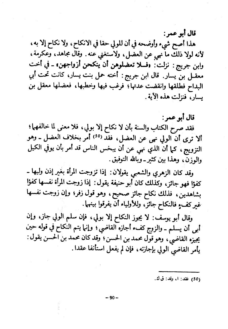 قَالَ أَبُو عُمَرَ هَذَا أَصَحُّ شَيْءِ وَأَوْضَحُهُ فِي أَنْ لِلْوَلِيِّ حَقًّا فِي الْإِنْكَاحِ وَلَا نِكَاحَ إِلَّا بِهِ لِأَنَّهُ لَوْلَا ذَلِكَ مَا نُهِيَ عَنِ الْعَضْلِ وَلَاسْتُغْنِيَ عَنْهُ وَقَالَ مُجَاهِدٌ وَعِكْرِمَةُ وَابْنُ جُرَيْجٍ نَزَلَتْ فَلَا تَعْضُلُوهُنَّ أَنْ يَنْكِحْنَ أَزْوَاجَهُنَّ فِي أُخْتِ مَعْقِلِ بْنِ يَسَارٍ قَالَ ابْنُ جُرَيْجٍ أُخْتُهُ حَمَلُ بِنْتُ يَسَارٍ كَانَتْ تَحْتَ أَبِي الْبَدَّاحِ فَطَلَّقَهَا وَانْقَضَتْ عِدَّتُهَا فَرَغِبَ فِيهَا وَخَطَبَهَا فَعَضَلهَا مَعْقِلُ بْنُ يَسَارٍ فَنَزَلَتْ هَذِهِ الْآيَةُ قَالَ أَبُو عُمَرَ فَقَدْ صَرَّحَ الْكِتَابُ وَالسَّنَةُ بِأَنْ لَا نِكَاحَ إِلَّا بِوَلِيٍّ فَلَا مَعْنَى لِمَا خَالَفَهُمَا أَلَا تَرَى أَنَّ الْوَلِيَّ نُهِيَ عَنِ الْعَضْلِ فَقَدْ أُمِرَ بِخِلَافِ الْعَضْلِ وَهُوَ التَّزْوِيجُ كَمَا أَنَّ الَّذِي نُهِيَ عَنْ أَنْ يَبْخَسَ النَّاسَ قَدْ أُمِرَ بِأَنْ يُوَفِّيَ الْكَيْلَ وَالْوَزْنَ وَهَذَا بَيِّنٌ كَثِيرٌ وَبِاللَّهِ التَّوْفِيقُ وَقَدْ كَانَ الزُّهْرِيُّ وَالشَّعْبِيُّ يَقُولَانِ إِذَا تَزَوَّجَتِ الْمَرْأَةُ بِغَيْرِ إِذْنِ وَلِيِّهَا كُفُؤًا فَهُوَ جَائِزٌ وَكَذَلِكَ كَانَ أَبُو حَنِيفَةَ يَقُولُ إِذَا زَوَّجَتِ الْمَرْأَةُ نَفْسَهَا كُفُؤًا بِشَاهِدَيْنِ فَذَلِكَ نِكَاحٌ جَائِزٌ صَحِيحٌ وَهُوَ قَوْلُ زُفَرٍ وَإِنْ زَوَّجَتْ نَفْسَهَا غَيْرَ كُفْءٍ فَالنِّكَاحُ جَائِزٌ وَلِلْأَوْلِيَاءِ أَنْ يُفَرِّقُوا بَيْنَهُمَا وَقَالَ أَبُو يُوسُفَ لَا يَجُوزُ النِّكَاحُ إِلَّا بِوَلِيٍّ فَإِنْ سَلَّمَ الْوَلِيُّ جَازَ وَإِنْ أَبَى أَنْ يُسَلِّمَ وَالزَّوْجُ كُفْءٌ أَجَازَهُ الْقَاضِي وَإِنَّمَا يَتِمُّ النِّكَاحُ فِي قَوْلِهِ حِينَ يُجِيزُهُ الْقَاضِي وَهُوَ قَوْلُ مُحَمَّدِ بْنِ الْحَسَنِ وَقَدْ كَانَ مُحَمَّدُ بْنُ الْحَسَنِ يَقُولُ يَأْمُرُ الْقَاضِي الْوَلِيَّ بِإِجَازَتِهِ فَإِنْ لَمْ يَفْعَلِ استأنفا عقدا
