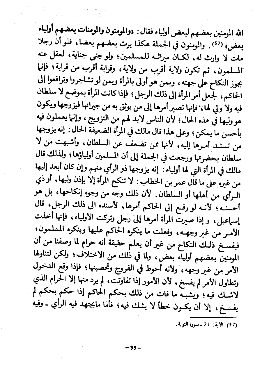 اللَّهُ الْمُؤْمِنِينَ بَعْضَهُمْ لِبَعْضٍ أَوْلِيَاءَ فَقَالَ وَالْمُؤْمِنُونَ وَالْمُؤْمِنَاتُ بَعْضُهُمْ أَوْلِيَاءُ بَعْضٍ وَالْمُؤْمِنُونَ فِي الْجُمْلَةِ هَكَذَا يَرِثُ بَعْضُهُمْ بَعْضًا فَلَوْ أَنَّ رَجُلًا مَاتَ لَا وَارِثَ لَهُ لَكَانَ مِيرَاثُهُ لِلْمُسْلِمِينَ وَلَوْ جَنَى جِنَايَةً لَعَقِلَ عَنْهُ الْمُسْلِمُونَ ثُمَّ تَكُونُ وِلَايَةٌ أَقْرَبَ مِنْ وِلَايَةٍ وَقَرَابَةٌ أَقْرَبَ من قاربة فَإِنَّمَا يَجُوزُ النِّكَاحُ عَلَى جِهَتِهِ وَبِمَنْ هُوَ أولى بالمرأة وبمن لو تاشجروا وَتَرَافَعُوا إِلَى الْحَاكِمِ لَجَعَلَ أَمْرَ الْمَرْأَةِ إِلَى ذَلِكَ الرَّجُلِ فَإِذَا كَانَتِ الْمَرْأَةُ بِمَوْضِعٍ لَا سُلْطَانَ فِيهِ وَلَا وَلِيَّ لَهَا فَإِنَّهَا تُصَيِّرُ أَمْرَهَا إِلَى مَنْ يُوثَقُ بِهِ مِنْ جِيرَانِهَا فَيُزَوِّجُهَا وَيَكُونُ هُوَ وَلِيَّهَا فِي هَذِهِ الْحَالِ لِأَنَّ النَّاسَ لَا بُدَّ لَهُمْ مِنَ التَّزْوِيجِ وَإِنَّمَا يَعْمَلُونَ فِيهِ بِأَحْسَنِ مَا يُمْكِنُ وَعَلَى هَذَا قَالَ مَالِكٌ فِي الْمَرْأَةِ الضَّعِيفَةِ الْحَالِ إِنَّهُ يُزَوِّجُهَا مَنْ تُسْنِدُ أَمْرَهَا إِلَيْهِ لِأَنَّهَا ممن تضعف عن السطان وَأَشْبَهَتْ مَنْ لَا سُلْطَانَ بِحَضْرَتِهَا وَرَجَعَتْ فِي الْجُمْلَةِ إِلَى أَنَّ الْمُسْلِمِينَ أَوْلِيَاؤُهَا وَلِذَلِكَ قَالَ مَالِكٌ فِي الْمَرْأَةِ الَّتِي لَهَا أَوْلِيَاءٌ إِنَّهُ يُزَوِّجُهَا ذُو الرَّأْيِ مِنْهُمْ وَإِنْ كَانَ أَبْعَدَ إِلَيْهَا مِنْ غَيْرِهِ عَلَى مَا قَالَ عُمَرُ بْنُ الْخَطَّابِ لَا تُنْكَحُ الْمَرْأَةُ إِلَّا بِإِذْنِ وَلِيِّهَا أَوْ ذِي الرَّأْيِ مِنْ أَهْلِهَا أَوِ السُّلْطَانِ لِأَنَّ ذَلِكَ وَجْهٌ مِنْ وُجُوهِ إِنْكَاحِهَا بَلْ هُوَ أَحْسَنُهُ لِأَنَّهُ لَوْ رُفِعَ إِلَى الْحَاكِمِ أَمْرُهَا لَأَسْنَدَهُ إِلَى ذَلِكَ الرَّجُلِ قَالَ إِسْمَاعِيلُ وَإِذَا صَيَّرَتِ الْمَرْأَةُ أَمْرَهَا إِلَى رَجُلٍ وَتَرَكَتِ الْأَوْلِيَاءَ فَإِنَّهَا أَخَذَتِ الْأَمْرَ مِنْ غَيْرِ وَجْهِهِ وَفَعَلَتْ مَا يُنْكِرُهُ الْحَاكِمُ عَلَيْهَا وَيُنْكِرُهُ الْمُسْلِمُونَ فَيُفْسَخُ ذَلِكَ النِّكَاحُ مِنْ غَيْرِ أَنْ يُعْلَمَ حَقِيقَةً أَنَّهُ حَرَامٌ لِمَا وَصَفْنَا مِنْ أَنَّ الْمُؤْمِنِينَ بَعْضَهُمْ أَوْلِيَاءُ بَعْضٍ وَلِمَا فِي ذَلِكَ مِنْ الِاخْتِلَافِ وَلَكِنْ لِتَنَاوُلِهَا الْأَمْرَ مِنْ غَيْرِ وَجْهِهِ وَلِأَنَّهُ أَحْوَطُ فِي الْفُرُوجِ وَتَحْصِينِهَا فَإِذَا وَقَعَ الدُّخُولُ وَتَطَاوَلَ الْأَمْرُ لَمْ يُفْسَخْ لِأَنَّ الْأُمُورَ إِذَا تَفَاوَتَتْ لَمْ يُرَدَّ مِنْهَا إِلَّا الْحَرَامُ الَّذِي لَا شَكَّ فِيهِ وَيُشَبَّهُ مَا فَاتَ مِنْ ذَلِكَ بِحُكْمِ الْحَاكِمِ إِذَا حَكَمَ بِحُكْمٍ لَمْ يُفْسَخْ إِلَّا أَنْ يَكُونَ خَطَأً لَا يُشَكُّ فِيهِ فَأَمَّا مَا يُجْتَهَدُ فِيهِ الرَّأْيُ وَفِيهِ