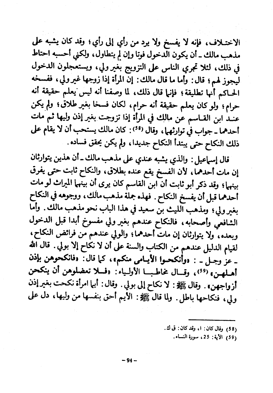 الِاخْتِلَافُ فَإِنَّهُ لَا يُفْسَخُ وَلَا يُرَدُّ مِنْ رَأْيٍ إِلَى رَأْيٍ وَقَدْ كَانَ يُشْبِهُ عَلَى مَذْهَبِ مَالِكٍ أَنْ يَكُونَ الدُّخُولُ فَوْتًا وَإِنْ لَمْ يَتَطَاوَلْ وَلَكِنِّي أَحْسَبُهُ احْتَاطَ فِي ذَلِكَ لِئَلَّا تَجْرِي النَّاسُ عَلَى التَّزْوِيجِ بِغَيْرِ وَلِيٍّ وَيَسْتَعْجِلُونَ الدُّخُولَ لِيَجُوزَ لَهُمْ قَالَ وَأَمَّا مَا قَالَ مَالِكٌ إِنَّ الْمَرْأَة إِذَا زَوَّجَهَا غَيْرُ وَلِيٍّ فَفَسَخَهُ الْحَاكِمُ أَنَّهَا تَطْلِيقَةٌ فَإِنَّمَا قَالَ ذَلِكَ لِمَا وَصَفْنَا أَنَّهُ لَيْسَ يُعْلَمُ حَقِيقَةً أَنَّهُ حَرَامٌ وَلَوْ كَانَ يُعْلَمُ حَقِيقَةً أَنَّهُ حَرَامٌ لَكَانَ فَسْخًا بِغَيْرِ طَلَاقٍ وَلَمْ يَكُنْ عند بن الْقَاسِمِ عَنْ مَالِكٍ فِي الْمَرْأَةِ إِذَا تَزَوَّجَتْ بِغَيْرِ إِذْنِ وَلِيِّهَا ثُمَّ مَاتَ أَحَدُهُمَا جَوَابٌ فِي تَوَارُثِهِمَا وَقَالَ كَانَ مَالِكٌ يَسْتَحِبُّ أَنْ لَا يُقَامَ عَلَى ذَلِكَ النِّكَاحِ حَتَّى يُبْتَدَأَ النِّكَاحُ جَدِيدًا وَلَمْ يَكُنْ يُحَقِّقُ فَسَادَهُ قَالَ إِسْمَاعِيلُ وَالَّذِي يُشْبِهُ عِنْدِي عَلَى مَذْهَبِ مَالِكٍ أَنَّ هَذَيْنِ يَتَوَارَثَانِ إِنْ مَاتَ أَحَدُهُمَا لِأَنَّ الْفَسْخَ يَقَعُ عِنْدَهُ بِطَلَاقٍ وَالنِّكَاحُ ثَابِتٌ حَتَّى يُفَرَّقَ بَيْنَهُمَا وَقَدْ ذَكَرَ أَبُو ثَابِتٍ أَنَّ ابْنَ الْقَاسِمِ كَانَ يَرَى أَنَّ بَيْنَهُمَا الْمِيرَاثَ لَوْ مَاتَ أَحَدُهُمَا قَبْلَ أَنْ يُفْسَخَ النِّكَاحُ فهذه جملة مذهب مالك ووجوه فِي النِّكَاحِ بِغَيْرِ وَلِيٍّ وَمَذْهَبُ اللَّيْثِ بْنِ سعيد فِي هَذَا الْبَابِ نَحْوَ مَذْهَبِ مَالِكٍ وَأَمَّا الشَّافِعِيُّ وَأَصْحَابُهُ فَالنِّكَاحُ عِنْدَهُمْ بِغَيْرِ وَلِيٍّ مَفْسُوخٌ أَبَدًا قَبْلَ الدُّخُولِ وَبَعْدَهُ وَلَا يَتَوَارَثَانِ إِنْ مَاتَ أَحَدُهُمَا وَالْوَلِيُّ عِنْدَهُمْ مِنْ فَرَائِضِ النِّكَاحِ لِقِيَامِ الدَّلِيلِ عِنْدَهُمْ مِنَ الْكِتَابِ وَالسُّنَّةِ عَلَى أَنْ لَا نِكَاحَ إِلَّا بِوَلِيٍّ قَالَ اللَّهُ عَزَّ وَجَلَّ وَأَنْكِحُوا الْأَيَامَى مِنْكُمْ كَمَا قَالَ فَانْكِحُوهُنَّ بِإِذْنِ أَهْلِهِنَّ وَقَالَ مُخَاطِبًا الْأَوْلِيَاءَ فَلَا تَعْضُلُوهُنَّ أَنْ يَنْكِحْنَ أَزْوَاجَهُنَّ وَقَالَ صَلَّى اللَّهُ عَلَيْهِ وَسَلَّمَ لَا نِكَاحَ إِلَّا بِوَلِيٍّ وَقَالَ أَيُّمَا امْرَأَةٍ نَكَحَتْ بِغَيْرِ إِذْنِ وَلِيٍّ فَنِكَاحُهَا بَاطِلٌ وَلَمَّا قَالَ صَلَّى اللَّهُ عَلَيْهِ وَسَلَّمَ الْأَيِّمُ أَحَقُّ بِنَفْسِهَا مِنْ وَلِيِّهَا دَلَّ عَلَى