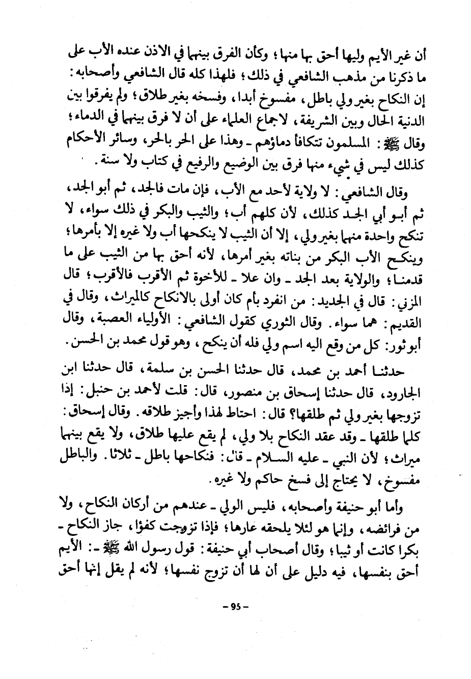 أَنَّ غَيْرَ الْأَيِّمِ وَلِيُّهَا أَحَقُّ بِهَا مِنْهَا وَكَأَنَّ الْفَرْقَ بَيْنَهُمَا فِي الْإِذْنِ عِنْدَهُ الْأَبُ عَلَى مَا ذَكَرْنَا مِنْ مَذْهَبِ الشَّافِعِيِّ فِي ذَلِكَ فَلِهَذَا كُلِّهِ قَالَ الشَّافِعِيُّ وَأَصْحَابُهُ إِنَّ النكاح بغير ولي باطل مفسوخ أبدإن وَفَسْخُهُ بِغَيْرِ طَلَاقٍ وَلَمْ يُفَرِّقُوا بَيْنَ الدَّنِيَّةِ الْحَالِ وَبَيْنَ الشَّرِيفَةِ لِإِجْمَاعِ الْعُلَمَاءِ عَلَى أَنْ لَا فَرْقَ بَيْنَهُمَا فِي الدِّمَاءِ وَقَالَ صَلَّى اللَّهُ عَلَيْهِ وَسَلَّمَ الْمُسْلِمُونَ تَتَكَافَأُ دِمَاؤُهُمْ وَهَذَا عَلَى الْحُرِّ بِالْحُرِّ وَسَائِرُ الْأَحْكَامِ كَذَلِكَ لَيْسَ فِي شَيْءٍ مِنْهَا فَرْقٌ بَيْنَ الْوَضِيعِ وَالرَّفِيعِ فِي كِتَابٍ وَلَا سُنَّةٍ وَقَالَ الشَّافِعِيُّ لَا ولاية لحد مَعَ الْأَبِ فَإِنْ مَاتَ فَالْجَدُّ ثُمَّ أَبُو الْجَدِّ ثُمَّ أَبُو أَبِي الْجَدِّ كَذَلِكَ لِأَنَّ كُلَّهُمْ أَبٌ وَالثَّيِّبُ وَالْبِكْرُ فِي ذَلِكَ سَوَاءٌ لَا تُنْكَحُ وَاحِدَةٌ مِنْهُمَا بِغَيْرِ وَلِيٍّ إِلَّا أَنَّ الثَّيِّبَ لَا يُنْكِحُهَا أَبٌ وَلَا غَيْرُهُ إِلَّا بِأَمْرِهَا وَيُنْكِحُ الْأَبُ الْبِكْرَ مِنْ بَنَاتِهِ بِغَيْرِ أَمْرِهَا لِأَنَّهُ أَحَقُّ بِهَا مِنَ الثَّيِّبِ عَلَى مَا قَدَّمْنَا وَالْوَلَايَةُ بَعْدَ الْجَدِّ وَإِنْ علا الأخوة ثُمَّ الْأَقْرَبِ فَالْأَقْرَبِ قَالَ الْمُزَنِيُّ قَالَ فِي الْجَدِيدِ مَنِ انْفَرَدَ بِأُمٍّ كَانَ أَوْلَى بِالْإِنْكَاحِ كَالْمِيرَاثِ وَقَالَ فِي الْقَدِيمِ هُمَا سَوَاءٌ وَقَالَ الثَّوْرِيُّ كَقَوْلِ الشَّافِعِيِّ الْأَوْلِيَاءُ الْعَصَبَةُ وَقَالَ أَبُو ثَوْرٍ كُلُّ مَنْ وَقَعَ إِلَيْهِ اسْمُ وَلِيٍّ فَلَهُ أَنْ يُنْكِحَ وَهُوَ قَوْلُ مُحَمَّدِ بْنِ الْحَسَنِ حَدَّثَنَا أَحْمَدُ بْنُ مُحَمَّدٍ قَالَ حَدَّثَنَا الْحَسَنُ بْنُ سَلَمَةَ قَالَ حَدَّثَنَا ابْنُ الْجَارُودِ قَالَ حَدَّثَنَا إِسْحَاقُ بْنُ مَنْصُورٍ قَالَ قُلْتُ لِأَحْمَدَ بْنِ حَنْبَلٍ إِذَا تَزَوَّجَهَا بِغَيْرِ وَلِيٍّ ثُمَّ طَلَّقَهَا قَالَ أحْتَاطُ لِهَذَا وَأُجِيزُ طَلَاقَهُ وَقَالَ إِسْحَاقُ كُلَّمَا طَلَّقَهَا وَقَدْ عُقِدَ النِّكَاحُ بِلَا وَلِيٍّ لَمْ يَقَعْ عَلَيْهَا طَلَاقٌ وَلَا يَقَعُ بَيْنَهُمَا مِيرَاثٌ لِأَنَّ النَّبِيَّ عَلَيْهِ السَّلَامُ قَالَ فَنِكَاحُهَا بَاطِلٌ ثَلَاثًا وَالْبَاطِلُ مَفْسُوخٌ لَا يحتاج إلى فسخ حاكم ولاغيره وَأَمَّا أَبُو حَنِيفَةَ وَأَصْحَابُهُ فَلَيْسَ الْوَلِيُّ عِنْدَهُمْ مِنْ أَرْكَانِ النِّكَاحِ وَلَا مِنْ فَرَائِضِهِ وَإِنَّمَا هو لئلا يلحقه عارها فإاذ تَزَوَّجَتْ كُفُؤًا جَازَ النِّكَاحُ بِكْرًا كَانَتْ أَوْ ثَيِّبًا وَقَالَ أَصْحَابُ أَبِي حَنِيفَةَ قَوْلُ رَسُولِ اللَّهِ صَلَّى اللَّهُ عَلَيْهِ وَسَلَّمَ الْأَيِّمُ أَحَقُّ بِنَفْسِهَا فِيهِ دَلِيلٌ عَلَى أَنَّ لَهَا أَنْ تُزَوِّجَ نَفْسَهَا لِأَنَّهُ لَمْ يَقُلْ إِنَّهَا أَحَقُّ