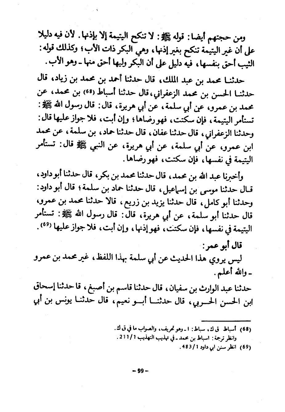 وَمِنْ حُجَّتِهِمْ أَيْضًا قَوْلُهُ صَلَّى اللَّهُ عَلَيْهِ وَسَلَّمَ لَا تُنْكَحُ الْيَتِيمَةُ إِلَّا بِإِذْنِهَا لِأَنَّ فِيهِ دَلِيلًا عَلَى أَنَّ غَيْرَ الْيَتِيمَةِ تُنْكَحُ بِغَيْرِ إِذْنِهَا وَهِيَ الْبِكْرُ ذَاتُ الْأَبِ وَكَذَلِكَ قَوْلُهُ الثَّيِّبُ أَحَقُّ بِنَفْسِهَا فِيهِ دَلِيلٌ عَلَى أَنَّ الْبِكْرَ وَلِيُّهَا أَحَقُّ مِنْهَا وَهُوَ الْأَبُ حَدَّثَنَا مُحَمَّدُ بْنُ عَبْدِ الْمَلِكِ قَالَ حَدَّثَنَا أَحْمَدُ بْنُ مُحَمَّدِ بْنِ زِيَادٍ قَالَ حَدَّثَنَا الْحَسَنُ بْنُ مُحَمَّدٍ الزَّعْفَرَانِيُّ قَالَ حَدَّثَنَا أَسْبَاطُ بْنُ مُحَمَّدٍ عَنْ مُحَمَّدِ بْنِ عَمْرٍو عَنْ أَبِي سَلَمَةَ عَنْ أَبِي هُرَيْرَةَ قَالَ قَالَ رَسُولُ اللَّهِ صَلَّى اللَّهُ عَلَيْهِ وَسَلَّمَ تُسْتَأْمَرُ الْيَتِيمَةُ فَإِنْ سَكَتَتْ فَهُوَ رِضَاهَا وَإِنْ أَبَتْ فَلَا جَوَازَ عَلَيْهَا قَالَ وَحَدَّثَنَا الزَّعْفَرَانِيُّ قَالَ حَدَّثَنَا عَفَّانُ قَالَ حَدَّثَنَا حَمَّادُ بْنُ سَلَمَةَ عن محمد ابن عَمْرٍو عَنْ أَبِي سَلَمَةَ عَنْ أَبِي هُرَيْرَةَ عَنِ النَّبِيِّ صَلَّى اللَّهُ عَلَيْهِ وَسَلَّمَ قَالَ تُسْتَأْمَرُ الْيَتِيمَةُ فِي نَفْسِهَا فَإِنْ سَكَتَتْ فَهُوَ رِضَاهَا وَأَخْبَرَنَا عَبْدُ اللَّهِ بْنُ مُحَمَّدٍ قَالَ حَدَّثَنَا مُحَمَّدُ بْنُ بَكْرٍ قَالَ حَدَّثَنَا أَبُو دَاوُدَ قَالَ حَدَّثَنَا مُوسَى بْنُ إِسْمَاعِيلَ قَالَ حَدَّثَنَا حَمَّادُ بْنُ سَلَمَةَ قَالَ أَبُو دَاوُدُ وَحَدَّثَنَا أَبُو كَامِلٍ قَالَ حَدَّثَنَا يَزِيدُ بْنُ زُرَيْعٍ قَالَا حَدَّثَنَا مُحَمَّدُ بْنُ عَمْرٍو قَالَ حَدَّثَنَا أَبُو سَلَمَةَ عَنْ أَبِي هُرَيْرَةَ قَالَ قَالَ رَسُولُ اللَّهِ صَلَّى اللَّهُ عَلَيْهِ وَسَلَّمَ تُسْتَأْمَرُ الْيَتِيمَةُ فِي نَفْسِهَا فَإِنْ سَكَتَتْ فَهُوَ إِذْنُهَا وَإِنْ أَبَتْ فَلَا جَوَازَ عَلَيْهَا قَالَ أَبُو عُمَرَ لَيْسَ يَرْوِي هَذَا الْحَدِيثَ عَنْ أَبِي سَلَمَةَ بِهَذَا اللَّفْظِ غَيْرُ مُحَمَّدِ بْنِ عَمْرٍو وَاللَّهُ أَعْلَمُ حَدَّثَنَا عَبْدُ الْوَارِثِ بْنُ سُفْيَانَ قَالَ حَدَّثَنَا قَاسِمُ بْنُ أَصْبَغَ قَالَ حَدَّثَنَا إسحاق ابن الْحَسَنِ الْحَرْبِيُّ قَالَ حَدَّثَنَا أَبُو نُعَيْمٍ قَالَ حَدَّثَنَا يُونُسُ بْنُ أَبِي