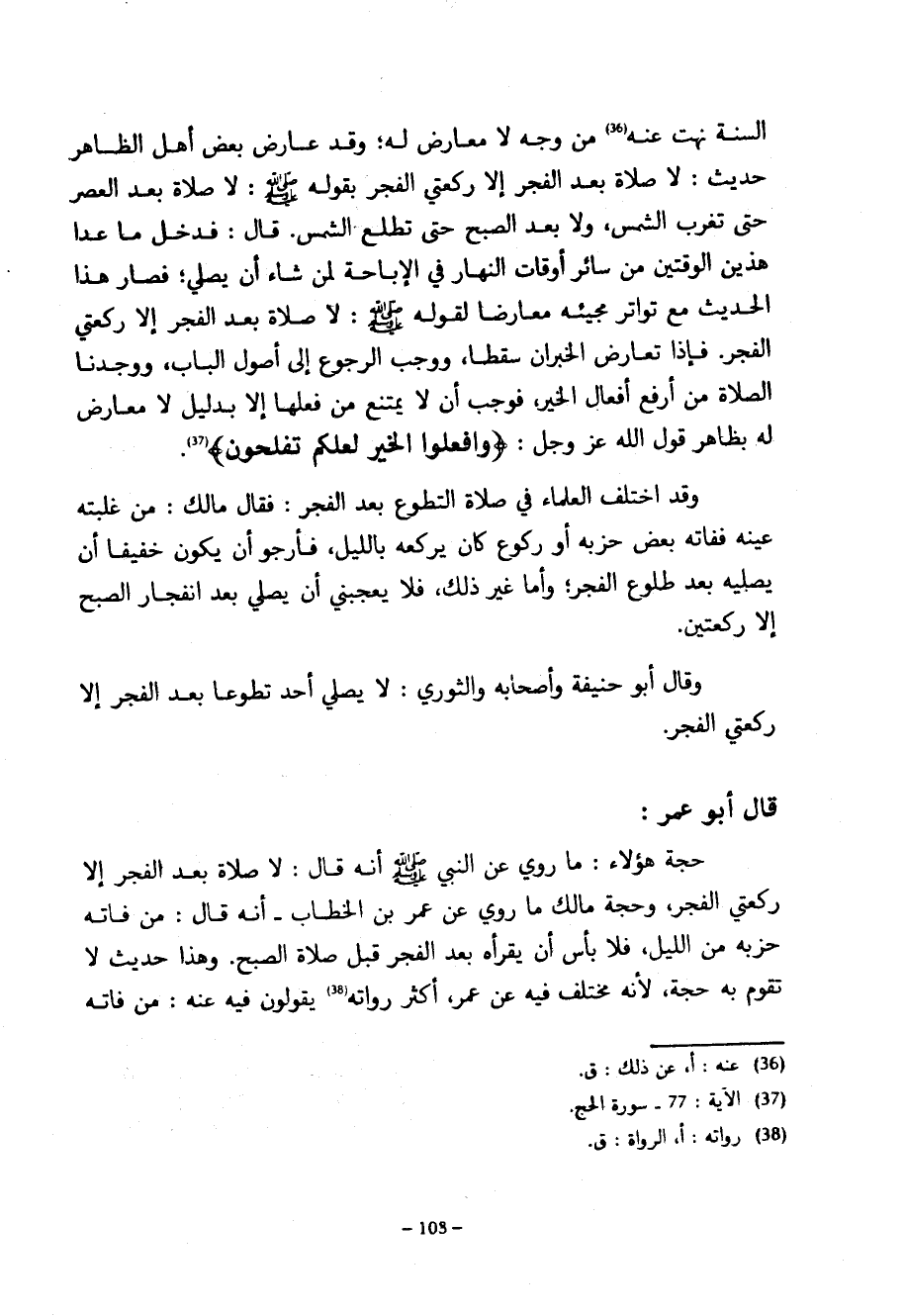 السُّنَّةَ نَهَتْ عَنْهُ مِنْ وَجْهٍ لَا مَعَارِضَ لَهُ وَقَدْ عَارَضَ بَعْضُ أَهْلِ الظَّاهِرِ حَدِيثَ لَا صَلَاةَ بَعْدَ الْفَجْرِ إِلَّا رَكْعَتَيِ الْفَجْرِ بِقَوْلِهِ صَلَّى اللَّهُ عَلَيْهِ وَسَلَّمَ لَا صَلَاةَ بَعْدَ الْعَصْرِ حَتَّى تَغْرُبَ الشَّمْسُ وَلَا بَعْدَ الصُّبْحِ حَتَّى تَطْلُعَ الشَّمْسُ قَالَ فَدَخَلَ مَا عَدَا هَذَيْنِ الْوَقْتَيْنِ مِنْ سَائِرِ أَوْقَاتِ النَّهَارِ فِي الْإِبَاحَةِ لِمَنْ شَاءَ أَنَّ يُصَلِّيَ فَصَارَ هَذَا الْحَدِيثُ مَعَ تَوَاتُرِ مَجِيئِهِ مُعَارِضًا لِقَوْلِهِ صَلَّى اللَّهُ عَلَيْهِ وَسَلَّمَ لَا صَلَاةَ بَعْدَ الْفَجْرِ إِلَّا رَكْعَتَيِ الْفَجْرِ فَإِذَا تَعَارَضَ الْخَبْرَانِ سَقَطَا وَوَجَبَ الرُّجُوعُ إِلَى أُصُولِ الْبَابِ وَوَجَدْنَا الصَّلَاةَ مِنْ أَرْفَعِ أَفْعَالِ الْخَيْرِ فَوَجَبَ أَنْ لَا يُمْتَنَعُ مِنْ فِعْلِهَا إِلَّا بِدَلِيلٍ لَا مُعَارِضَ لَهُ بِظَاهِرِ قَوْلِ اللَّهِ عَزَّ وَجَلَّ وَافْعَلُوا الْخَيْرَ لَعَلَّكُمْ تُفْلِحُونَ وَقَدِ اخْتَلَفَ الْعُلَمَاءُ فِي صَلَاةِ التَّطَوُّعِ بَعْدَ الْفَجْرِ فَقَالَ مَالِكٌ مَنْ غَلَبَتْهُ عَيْنُهُ فَفَاتَهُ بَعْضُ حِزْبِهِ أَوْ رُكُوعٌ كَانَ يَرْكَعُهُ بِاللَّيْلِ فَأَرْجُو أَنْ يَكُونَ خَفِيفًا أَنْ يُصَلِّيَهُ بَعْدَ طُلُوعِ الْفَجْرِ وَأَمَّا غَيْرُ ذَلِكَ فَلَا يُعْجِبُنِي أَنْ يُصَلِّيَ بَعْدَ انْفِجَارِ الصُّبْحِ إِلَّا رَكْعَتَيْنِ وَقَالَ أَبُو حَنِيفَةَ وَأَصْحَابُهُ وَالثَّوْرِيُّ لَا يُصَلِّي أَحَدٌ تَطَوُّعًا بَعْدَ الْفَجْرِ إِلَّا رَكْعَتَيِ الْفَجْرِ قَالَ أَبُو عُمَرَ حُجَّةُ هَؤُلَاءِ مَا رُوِيَ عَنِ النَّبِيِّ صَلَّى اللَّهُ عَلَيْهِ وَسَلَّمَ أَنَّهُ قَالَ لَا صَلَاةَ بَعْدَ الْفَجْرِ إِلَّا رَكْعَتَيِ الْفَجْرِ وَحَجَّةُ مَالِكٍ مَا رُوِيَ عَنْ عُمَرَ بْنِ الْخَطَّابِ أَنَّهُ قَالَ مَنْ فَاتَهُ حِزْبُهُ مِنَ اللَّيْلِ فَلَا بَأْسَ أَنْ يَقْرَأَهُ بَعْدَ الْفَجْرِ قَبْلَ صَلَاةِ الصُّبْحِ وَهَذَا حَدِيثٌ لَا تَقُومُ بِهِ حُجَّةٌ لِأَنَّهُ مُخْتَلَفٌ فِيهِ عَنْ عُمَرَ أَكْثَرُ رُوَاتِهِ يَقُولُونَ فِيهِ عَنْهُ مَنْ فَاتَهُ