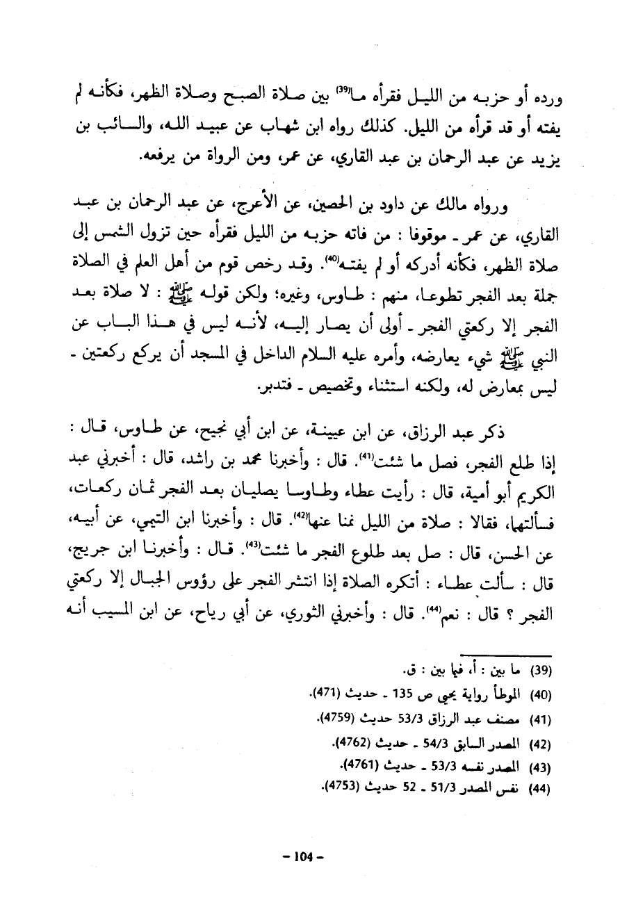 وِرْدُهُ أَوْ حِزْبُهُ مِنَ اللَّيْلِ فَقَرَأَهُ مَا بَيْنَ صَلَاةِ الصُّبْحِ وَصَلَاةِ الظُّهْرِ فَكَأَنَّهُ لَمْ يَفُتْهُ أَوْ قَدْ قَرَأَهُ مِنَ اللَّيْلِ كَذَلِكَ رَوَاهُ ابْنُ شِهَابٍ عَنْ عُبَيْدِ اللَّهِ وَالسَّائِبُ بن يزيد عن عبد الرحمان بْنِ عَبْدٍ الْقَارِّيِّ عَنْ عُمَرَ وَمِنَ الرُّوَاةِ مَنْ يَرْفَعُهُ وَرَوَاهُ مَالِكٌ عَنْ دَاوُدَ بْنِ الصحين عن الأعرج عن عبد الرحمان بْنِ عَبْدٍ الْقَارِّيِّ عَنْ عُمَرَ مَوْقُوفًا مَنْ فَاتَهُ حِزْبُهُ مِنَ اللَّيْلِ فَقَرَأَهُ حِينَ تَزُولُ الشَّمْسُ إِلَى صَلَاةِ الظُّهْرِ فَكَأَنَّهُ أَدْرَكَهُ أَوْ لَمْ يَفُتْهُ وَقَدْ رَخَّصَ قَوْمٌ مِنْ أَهْلِ الْعِلْمِ فِي الصَّلَاةِ جُمْلَةً بَعْدَ الْفَجْرِ تَطَوُّعًا مِنْهُمْ طَاوُسٌ وَغَيْرُهُ وَلَكِنَّ قَوْلِهِ صَلَّى اللَّهُ عَلَيْهِ وَسَلَّمَ لَا صَلَاةَ بَعْدَ الْفَجْرِ إِلَّا رَكْعَتَيِ الْفَجْرِ أَوْلَى أَنْ يُصَارَ إِلَيْهِ لِأَنَّهُ لَيْسَ فِي هَذَا الْبَابِ عَنِ النَّبِيِّ صَلَّى اللَّهُ عَلَيْهِ وَسَلَّمَ شَيْءٌ يُعَارِضُهُ وَأَمْرُهُ عَلَيْهِ السَّلَامُ الدَّاخِلَ فِي الْمَسْجِدِ أَنْ يَرْكَعَ رَكْعَتَيْنِ لَيْسَ بِمُعَارِضٍ لَهُ وَلَكِنَّهُ اسْتِثْنَاءٌ وَتَخْصِيصٌ فَتَدَبَّرْ ذَكَرَ عَبْدُ الرَّزَّاقِ عَنِ ابْنُ عُيَيْنَةَ عَنِ ابْنِ أَبِي نَجِيحٍ عَنْ طَاوُسٍ قَالَ إِذَا طَلَعَ الْفَجْرُ فَصَلِّ مَا شِئْتَ قَالَ وَأَخْبَرَنَا مُحَمَّدُ بْنُ رَاشِدٍ قَالَ أَخْبَرَنِي عَبْدُ الْكَرِيمِ أَبُو أُمَيَّةَ قَالَ رَأَيْتُ عَطَاءً وَطَاوُسًا يُصَلِّيَانِ بعد الفجر ثمان رَكَعَاتٍ فَسَأَلْتُهُمَا فَقَالَا صَلَاةٌ مِنَ اللَّيْلِ نِمْنَا عَنْهَا قَالَ وَأَخْبَرَنَا ابْنُ التَّيْمِيِّ عَنْ أَبِيهِ عَنِ الْحَسَنِ قَالَ صَلِّ بَعْدَ طُلُوعِ الْفَجْرِ مَا شِئْتَ قَالَ وَأَخْبَرَنَا ابْنُ جُرَيْجٍ قَالَ سَأَلْتُ عَطَاءً أَتَكْرَهُ الصَّلَاةَ إِذَا انْتَشَرَ الْفَجْرُ على رؤوس الْجِبَالِ إِلَّا رَكْعَتَيِ الْفَجْرِ قَالَ نَعَمْ قَالَ وَأَخْبَرَنِي الثَّوْرِيُّ عَنْ أَبِي رِيَاحٍ عَنِ ابْنِ المسيب أنه