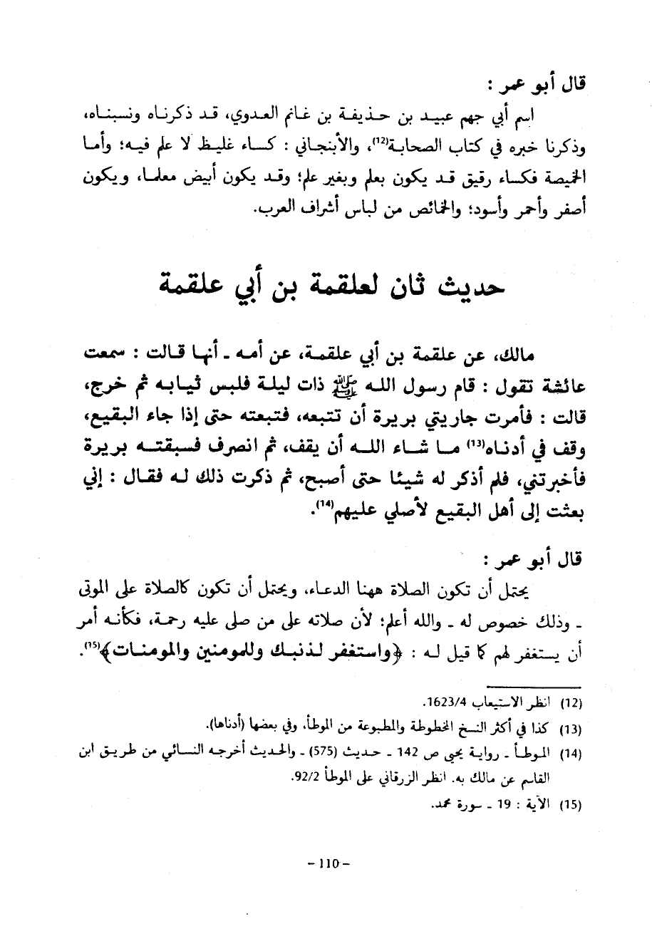 حَدِيثٌ ثَانٍ لِعَلْقَمَةَ بْنِ أَبِي عَلْقَمَةَ مَالِكٍ عَنْ عَلْقَمَةَ بْنِ أَبِي عَلْقَمَةَ عَنْ أُمِّهِ أَنَّهَا قَالَتْ سَمِعْتُ عَائِشَةَ تَقُولُ قَامَ رَسُولُ اللَّهِ صَلَّى اللَّهُ عَلَيْهِ وَسَلَّمَ ذَاتَ لَيْلَةٍ فَلَبِسَ ثِيَابَهُ ثُمَّ خَرَجَ قَالَتْ فَأَمَرْتُ جَارِيَتِي بَرِيرَةَ أَنْ تَتْبَعَهُ فَتَبِعَتْهُ حَتَّى إِذَا جَاءَ الْبَقِيعَ وَقَفَ فِي أَدْنَاهُ مَا شَاءَ اللَّهُ أَنْ يَقِفَ ثُمَّ انْصَرَفَ فَسَبَقَتْهُ بِرَيْرَةُ فَأَخْبَرَتْنِي فَلَمْ أَذْكُرْ لَهُ شَيْئًا حَتَّى أَصْبَحَ ثُمَّ ذَكَرْتُ ذَلِكَ لَهُ فَقَالَ إِنِّي بُعِثْتُ إِلَى أَهْلِ الْبَقِيعِ لِأُصَلِيَّ عَلَيْهِمْ قَالَ أَبُو عُمَرَ يُحْتَمَلُ أن تكون الصلاة ههنا الدُّعَاءَ وَيُحْتَمَلُ أَنْ تَكُونَ كَالصَّلَاةِ عَلَى الْمَوْتَى وَذَلِكَ خُصُوصٌ لَهُ وَاللَّهُ أَعْلَمُ لِأَنَّ صِلَاتَهُ على من صلى عليه رحمة فَكَأَنَّهُ أُمِرَ أَنْ يَسْتَغْفِرَ لَهُمْ كَمَا قِيلَ لَهُ وَاسْتَغْفِرْ لِذَنْبِكَ وَلِلْمُؤْمِنِينَ وَالْمُؤْمِنَاتِ