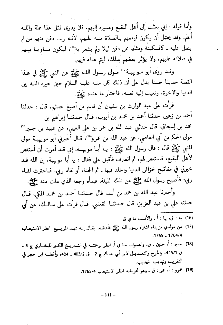 وَأَمَّا قَوْلُهُ إِنِّي بُعِثْتُ إِلَى أَهْلِ الْبَقِيعِ وَمَسِيرُهُ إِلَيْهِمْ فَلَا يُدْرَى لِمِثْلِ هَذَا عِلَّةٌ وَاللَّهُ أَعْلَمُ وَقَدْ يُحْتَمَلُ أَنْ يَكُونَ لِيَعُمَّهُمْ بِالصَّلَاةِ مِنْهُ عَلَيْهِمْ لِأَنَّهُ رُبَّمَا دُفِنَ مِنْهُمْ مَنْ لَمْ يُصَلِّ عَلَيْهِ كَالْمِسْكِينَةِ وَمِثْلِهَا مِمَّنْ دُفِنَ لَيْلًا وَلَمْ يَشْعُرْ بِهِ لِيَكُونَ مُسَاوِيًا بَيْنَهُمْ فِي صَلَاتِهِ عَلَيْهِمْ وَلَا يُؤْثِرُ بَعْضَهُمْ بِذَلِكَ لِيُتِمَّ عَدْلَهُ فِيهِمْ وَقَدْ رَوَى أَبُو مُوَيْهِبَةَ مَوْلَى رَسُولِ اللَّهِ صَلَّى اللَّهُ عَلَيْهِ وَسَلَّمَ عَنِ النَّبِيِّ صَلَّى اللَّهُ عَلَيْهِ وَسَلَّمَ فِي هذا القصة حديثا حسنا يَدُلُّ عَلَى أَنَّ ذَلِكَ كَانَ مِنْهُ عَلَيْهِ السَّلَامُ حِينَ خَيَّرَهُ اللَّهُ بَيْنَ الدُّنْيَا وَالْآخِرَةِ وَنُعِيَتْ إِلَيْهِ نَفْسُهُ فَاخْتَارَ مَا عِنْدَهُ صَلَّى اللَّهُ عَلَيْهِ وَسَلَّمَ قَرَأْتُ عَلَى عَبْدِ الْوَارِثِ بْنِ سُفْيَانَ أَنَّ قَاسِمَ بْنَ أَصْبَغَ حَدَّثَهُمْ قَالَ حَدَّثَنَا أَحْمَدُ بْنُ زُهَيْرٍ حَدَّثَنَا أَحْمَدُ بْنُ مُحَمَّدِ بْنِ أَيُّوبَ قَالَ حَدَّثَنَا إِبْرَاهِيمُ بْنُ سَعْدٍ عَنْ مُحَمَّدِ بْنِ إِسْحَاقَ قَالَ حَدَّثَنِي عَبْدُ اللَّهِ بْنُ عُمَرَ بْنِ عَلِيٍّ الْعَيْلِيُّ عَنْ عُبَيْدِ بْنِ جُبَيْرٍ مَوْلَى الْحَكَمِ بْنِ أَبِي الْعَاصِي عَنْ عَبْدِ اللَّهِ بْنِ عَمْرٍو قَالَ أَخْبَرَنِي أَبُو مُوَيْهِبَةَ مَوْلًى لِلنَّبِيِّ صَلَّى اللَّهُ عَلَيْهِ وَسَلَّمَ قَالَ قَالَ رَسُولُ اللَّهِ صَلَّى اللَّهُ عَلَيْهِ وَسَلَّمَ يَا أَبَا مُوَيْهِبَةَ إِنِّي قَدْ أُمِرْتُ أَنْ أَسْتَغْفِرَ لِأَهْلِ الْبَقِيعِ فَاسْتَغْفِرْ لَهُمْ ثُمَّ انْصَرَفَ فَأَقْبَلَ عَلَيَّ فَقَالَ يَا أَبَا مُوَيْهِبَةَ إِنَّ اللَّهَ قَدْ خَيَّرَنِي فِي مَفَاتِيحِ خَزَائِنَ الدُّنْيَا وَالْخَلَدِ فِيهَا ثُمَّ الْجَنَّةِ أَوْ لِقَاءِ رَبِّي فَاخْتَرْتُ لِقَاءَ رَبِّي فَأَصْبَحَ رَسُولُ اللَّهِ صَلَّى اللَّهُ عَلَيْهِ وَسَلَّمَ مِنْ تِلْكَ اللَّيْلَةِ فَبَدَأَهُ وَجَعُهُ الَّذِي مَاتَ مِنْهُ صَلَّى اللَّهُ عَلَيْهِ وَسَلَّمَ وَأَخْبَرَنَا عَبْدُ اللَّهِ بْنُ مُحَمَّدِ بْنِ أَسَدٍ قَالَ حَدَّثَنَا أَحْمَدُ بْنُ مُحَمَّدٍ الْمَكِّيُّ قَالَ حَدَّثَنَا عَلِيُّ بْنُ عَبْدِ الْعَزِيزِ قَالَ حَدَّثَنَا الْقَعْنَبِيُّ قَالَ قَرَأْتُ عَلَى مَالِكٍ عَنْ أَبِي