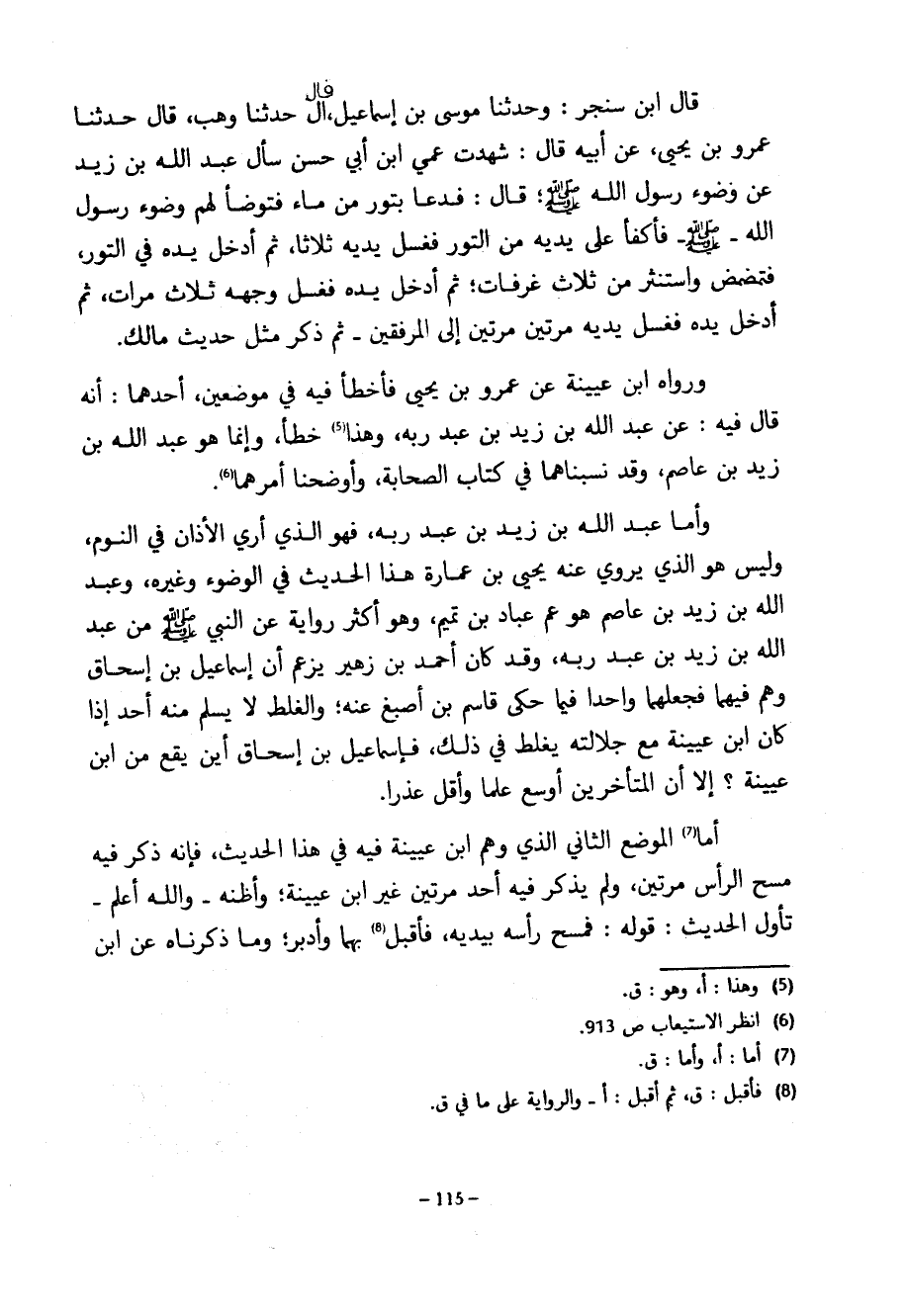 قَالَ ابْنُ سَنْجَرٍ وَحَدَّثَنَا مُوسَى بْنُ إِسْمَاعِيلَ قَالَ حَدَّثَنَا وَهْبٌ قَالَ حَدَّثَنَا عَمْرُو بْنُ يَحْيَى عَنْ أَبِيهِ قَالَ شَهِدْتُ عَمِّي ابْنَ أَبِي حَسَنٍ سَأَلَ عَبْدَ اللَّهِ بْنَ زَيْدٍ عَنْ وَضَوْءِ رَسُولِ اللَّهِ صَلَّى اللَّهُ عَلَيْهِ وَسَلَّمَ قَالَ فَدَعَا بِتَوْرٍ مِنْ مَاءٍ فَتَوَضَّأَ لَهُمْ وَضَوْءِ رَسُولِ اللَّهِ صَلَّى اللَّهُ عَلَيْهِ وَسَلَّمَ فَأَكْفَأَ عَلَى يَدَيْهِ مِنَ التَّوْرِ فَغَسَلَ يَدَيْهِ ثَلَاثًا ثُمَّ أَدْخَلَ يَدَهُ فِي التَّوْرِ فَتَمَضْمَضَ وَاسْتَنْثَرَ مِنْ ثَلَاثِ غَرْفَاتٍ ثُمَّ أَدْخَلَ يَدَهُ فَغَسَلَ وَجْهَهُ ثَلَاثَ مَرَّاتٍ ثُمَّ أَدْخَلَ يده غَسَلَ يَدَيْهِ مَرَّتَيْنِ مَرَّتَيْنِ إِلَى الْمَرْفِقَيْنِ ثُمَّ ذَكَرَ مِثْلَ حَدِيثِ مَالِكٍ وَرَوَاهُ ابْنُ عُيَيْنَةَ عَنْ عَمْرِو بْنِ يَحْيَى فَأَخْطَأَ فِيهِ فِي مَوْضِعَيْنِ أَحَدِهِمَا أَنَّهُ قَالَ فِيهِ عَنْ عَبْدِ اللَّهِ بْنِ زَيْدِ بْنِ عَبْدِ رَبِّهِ وَهَذَا خَطَأٌ وَإِنَّمَا هُوَ عَبْدُ اللَّهِ بْنُ زَيْدِ بْنِ عَاصِمٍ وَقَدْ نَسَبْنَاهُمَا فِي كِتَابِ الصَّحَابَةِ وَأَوْضَحْنَا أَمْرَهُمَا وَأَمَّا عَبْدُ اللَّهِ بْنُ زَيْدِ بْنِ عَبْدِ رَبِّهِ فَهُوَ الَّذِي أُرِيَ الْأَذَانَ فِي النَّوْمِ وَلَيْسَ هُوَ الَّذِي يَرْوِي عَنْهُ يَحْيَى بْنُ عُمَارَةَ هَذَا الْحَدِيثَ فِي الْوُضُوءِ وَغَيْرَهُ وَعَبْدُ اللَّهِ بْنُ زَيْدِ بْنِ عَاصِمٍ هُوَ عَمُّ عَبَّادِ بْنِ تَمِيمٍ وَهُوَ أَكْثَرُ رِوَايَةً عَنِ النَّبِيِّ صَلَّى اللَّهُ عَلَيْهِ وَسَلَّمَ مِنْ عَبْدُ اللَّهِ بْنُ زَيْدِ بْنِ عَبْدِ رَبِّهِ وَقَدْ كَانَ أَحْمَدُ بْنُ زُهَيْرٍ يَزْعُمُ أَنَّ إِسْمَاعِيلَ بْنَ إِسْحَاقَ وَهِمَ فِيهِمَا فَجَعَلَهُمَا وَاحِدًا فِيمَا حَكَى قَاسِمُ بْنُ أَصْبَغَ عَنْهُ وَالْغَلَطُ لَا يَسْلَمُ مِنْهُ أَحَدٌ إِذَا كَانَ ابْنُ عُيَيْنَةَ مَعَ جَلَالَتِهِ يَغْلَطُ فِي ذَلِكَ فَإِسْمَاعِيلُ بْنُ إِسْحَاقَ أَيْنَ يَقَعُ مِنِ ابْنِ عُيَيْنَةَ إِلَّا أَنَّ الْمُتَأَخِّرِينَ أَوْسَعُ عِلْمًا وَأَقَلُّ عُذْرًا أَمَّا الْمَوْضِعُ الثَّانِي الَّذِي وَهِمَ ابْنُ عُيَيْنَةَ فِيهِ فِي هَذَا الْحَدِيثِ فَإِنَّهُ ذَكَرَ فِيهِ مَسْحَ الرَّأْسِ مَرَّتَيْنِ وَلَمْ يَذْكُرْ فِيهِ أَحَدٌ مَرَّتَيْنِ غَيْرُ ابْنِ عُيَيْنَةَ وَأَظُنُّهُ وَاللَّهُ أَعْلَمُ تَأَوَّلَ الْحَدِيثُ قَوْلُهُ فَمَسَحَ رَأْسَهُ بِيَدَيْهِ فَأَقْبَلَ بِهِمَا وَأَدْبَرُ وَمَا ذَكَرْنَاهُ عَنِ ابْنِ