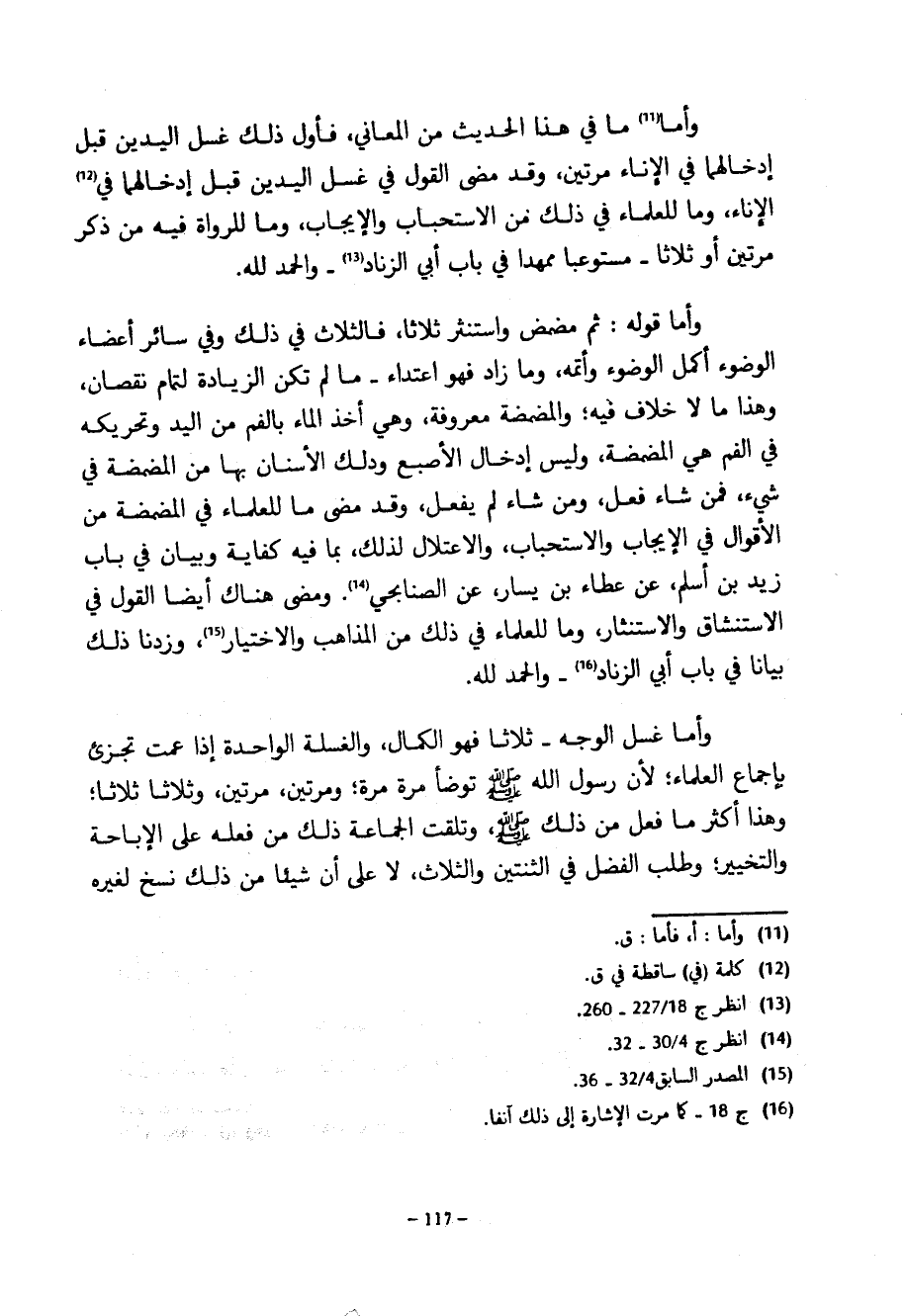 وَأَمَّا مَا فِي هَذَا الْحَدِيثِ مِنَ الْمَعَانِي فَأَوَّلُ ذَلِكَ غَسْلُ الْيَدَيْنِ قَبْلَ إِدْخَالِهِمَا فِي الْإِنَاءِ مَرَّتَيْنِ وَقَدْ مَضَى الْقَوْلُ فِي غَسْلِ الْيَدَيْنِ قَبْلَ إِدْخَالِهِمَا فِي الْإِنَاءِ وَمَا لِلْعُلَمَاءِ فِي ذَلِكَ مِنَ الِاسْتِحْبَابِ وَالْإِيجَابِ وَمَا لِلرُّوَاةِ فِيهِ مِنْ ذِكْرٍ مَرَّتَيْنِ أَوْ ثَلَاثًا مُسْتَوْعَبًا مُمَهَّدًا فِي بَابِ أَبِي الزِّنَادِ وَالْحَمْدُ لِلَّهِ وَأَمَّا قَوْلُهُ ثُمَّ مَضْمَضَ وَاسْتَنْثَرَ ثَلَاثًا فَالثَّلَاثُ فِي ذَلِكَ وَفِي سَائِرِ أَعْضَاءِ الْوُضُوءِ أَكْمَلُ الْوُضُوءِ وَأَتَمُّهُ وَمَا زَادَ فَهُوَ اعْتِدَاءٌ مَا لَمْ تَكُنِ الزِّيَادَةُ لِتَمَامِ نُقْصَانٍ وَهَذَا مَا لَا خِلَافَ فِيهِ وَالْمَضْمَضَةُ مَعْرُوفَةٌ وَهِيَ أَخْذُ الماء بالفم من اليد وتحركيه فِي الْفَمِ هِيَ الْمَضْمَضَةُ وَلَيْسَ إِدْخَالُ الْإِصْبَعِ ودلك الأسنان بها من المضمة فِي شَيْءٍ فَمَنْ شَاءَ فَعَلَ وَمَنْ شَاءَ لَمْ يَفْعَلْ وَقَدْ مَضَى مَا لِلْعُلَمَاءِ فِي الْمَضْمَضَةِ مِنَ الْأَقْوَالِ فِي الْإِيجَابِ وَالِاسْتِحْبَابِ وَالِاعْتِلَالِ لِذَلِكَ بِمَا فِيهِ كِفَايَةٌ وَبَيَانٌ فِي بَابِ زَيْدِ بْنِ أَسْلَمَ عَنْ عَطَاءِ بْنِ يَسَارٍ عَنِ الصُّنَابِحِيِّ وَمَضَى هُنَاكَ أَيْضًا الْقَوْلُ فِي الِاسْتِنْشَاقِ وَالِاسْتِنْثَارِ وَمَا لِلْعُلَمَاءِ فِي ذَلِكَ مِنَ الْمَذَاهِبِ وَالِاخْتِيَارِ وَزِدْنَا ذَلِكَ بَيَانًا فِي بَابِ أَبِي الزِّنَادِ وَالْحَمْدُ لِلَّهِ وَأَمَّا غَسْلُ الْوَجْهِ ثَلَاثًا فَهُوَ الْكَمَالُ وَالْغَسْلَةُ الْوَاحِدَةُ إِذَا عَمَّتْ تجزئ بِإِجْمَاعِ الْعُلَمَاءِ لِأَنَّ رَسُولَ اللَّهِ صَلَّى اللَّهُ عَلَيْهِ وَسَلَّمَ تَوَضَّأَ مَرَّةً مَرَّةً وَمَرَّتَيْنِ مَرَّتَيْنِ وَثَلَاثًا ثَلَاثًا وَهَذَا أَكْثَرُ مَا فَعَلَ مِنْ ذَلِكَ صَلَّى اللَّهُ عَلَيْهِ وَسَلَّمَ وَتَلَقَّتِ الْجَمَاعَةُ ذَلِكَ مِنْ فِعْلِهِ عَلَى الْإِبَاحَةِ وَالتَّخْيِيرِ وَطَلَبِ الْفَضْلِ فِي الثِّنْتَيْنِ وَالثَّلَاثِ لَا عَلَى أَنَّ شَيْئًا مِنْ ذَلِكَ نَسْخٌ لِغَيْرِهِ