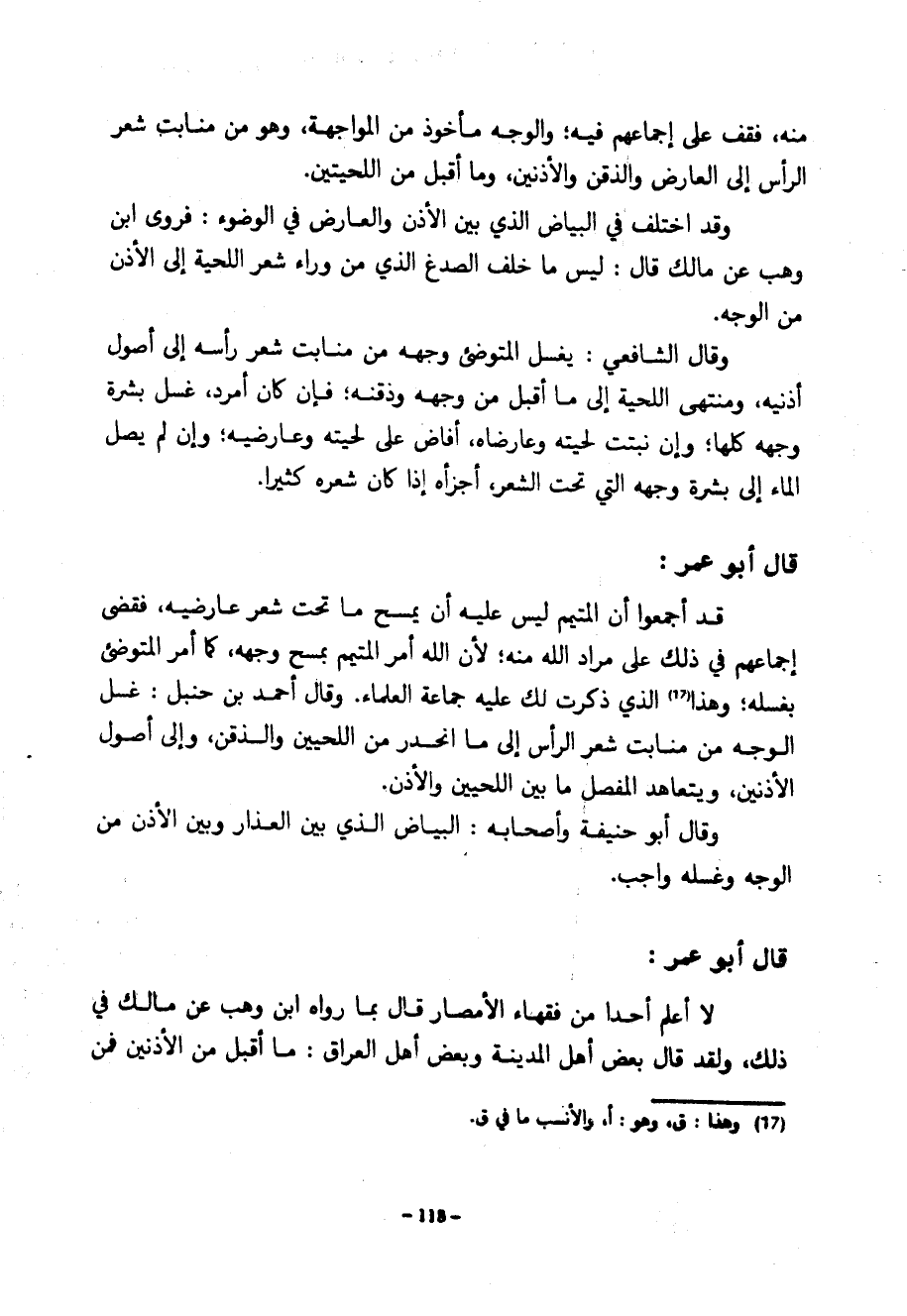 مِنْهُ فَقِفْ عَلَى إِجْمَاعِهِمْ فِيهِ وَالْوَجْهُ مَأْخُوذٌ مِنَ الْمُوَاجَهَةِ وَهُوَ مِنْ مَنَابِتِ شَعْرِ الرَّأْسِ إِلَى الْعَارِضِ وَالذَّقَنِ وَالْأُذُنَيْنِ وَمَا أَقْبَلَ مِنَ اللِّحْيَتَيْنِ وَقَدِ اخْتُلِفَ فِي الْبَيَاضِ الَّذِي بَيْنَ الْأُذُنِ وَالْعَارِضِ فِي الْوُضُوءِ فَرَوَى ابْنُ وَهْبٍ عَنْ مَالِكٍ قَالَ لَيْسَ مَا خَلْفَ الصُّدْغِ الَّذِي مِنْ وَرَاءِ شَعْرِ اللِّحْيَةِ إِلَى الْأُذُنِ من الوجه وقال الشافعي يغسل المتوضيء وَجْهَهُ مِنْ مَنَابِتِ شَعْرِ رَأْسِهِ إِلَى أُصُولِ أُذُنَيْهِ وَمُنْتَهَى اللِّحْيَةِ إِلَى مَا أَقْبَلَ مِنْ وَجْهِهِ وَذَقْنِهِ فَإِنْ كَانَ أَمَرَدَ غَسَلَ بَشَرَةَ وَجْهِهِ كُلَّهَا وَإِنْ نَبَتَتْ لِحْيَتُهُ وَعَارِضَاهُ أَفَاضَ عَلَى لِحْيَتِهِ وَعَارِضَيْهِ وَإِنْ لَمْ يَصِلِّ الْمَاءُ إِلَى بَشَرَةِ وَجْهِهِ الَّتِي تَحْتَ الشَّعْرِ أَجْزَأَهُ إِذَا كَانَ شِعْرُهُ كَثِيرًا قَالَ أَبُو عُمَرَ قَدْ أَجْمَعُوا أَنَّ الْمُتَيَمِّمَ لَيْسَ عَلَيْهِ أَنْ يَمْسَحَ مَا تَحْتَ شَعْرِ عَارِضَيْهِ فَقَضَى إِجْمَاعُهُمْ فِي ذَلِكَ عَلَى مُرَادِ اللَّهِ مِنْهُ لِأَنَّ اللَّهَ أَمَرَ الْمُتَيَمِّمِ بِمَسْحِ وَجْهِهِ كَمَا أَمَرَ الْمُتَوَضِّئَ بِغَسْلِهِ وَهَذَا الَّذِي ذَكَرْتُ لَكَ عَلَيْهِ جَمَاعَةُ الْعُلَمَاءِ وَقَالَ أَحْمَدُ بْنُ حَنْبَلٍ غَسْلُ الْوَجْهِ مِنْ مَنَابِتِ شَعْرِ الرَّأْسِ إِلَى مَا انْحَدَرَ مِنَ اللَّحْيَيْنِ وَالذَّقَنِ وَإِلَى أُصُولِ الْأُذُنَيْنِ وَيَتَعَاهَدُ الْمَفْصِلَ مَا بَيْنَ اللَّحْيَيْنِ وَالْأُذُنِ وَقَالَ أبو حنيفة وأصحابه الْبَيَاضُ الَّذِي بَيْنَ الْعَذَارِ وَبَيْنَ الْأُذُنِ مِنَ الوجه وغسله وَاجِبٌ قَالَ أَبُو عُمَرَ لَا أَعْلَمَ أَحَدًا مِنْ فُقَهَاءِ الْأَمْصَارِ قَالَ بِمَا رَوَاهُ ابْنُ وَهْبٍ عَنْ مَالِكٍ فِي ذَلِكَ وَلَقَدْ قَالَ بَعْضُ أَهْلِ الْمَدِينَةِ وَبَعْضُ أَهْلِ الْعِرَاقِ مَا أَقْبَلَ مِنَ الْأُذُنَيْنِ فَمِنَ