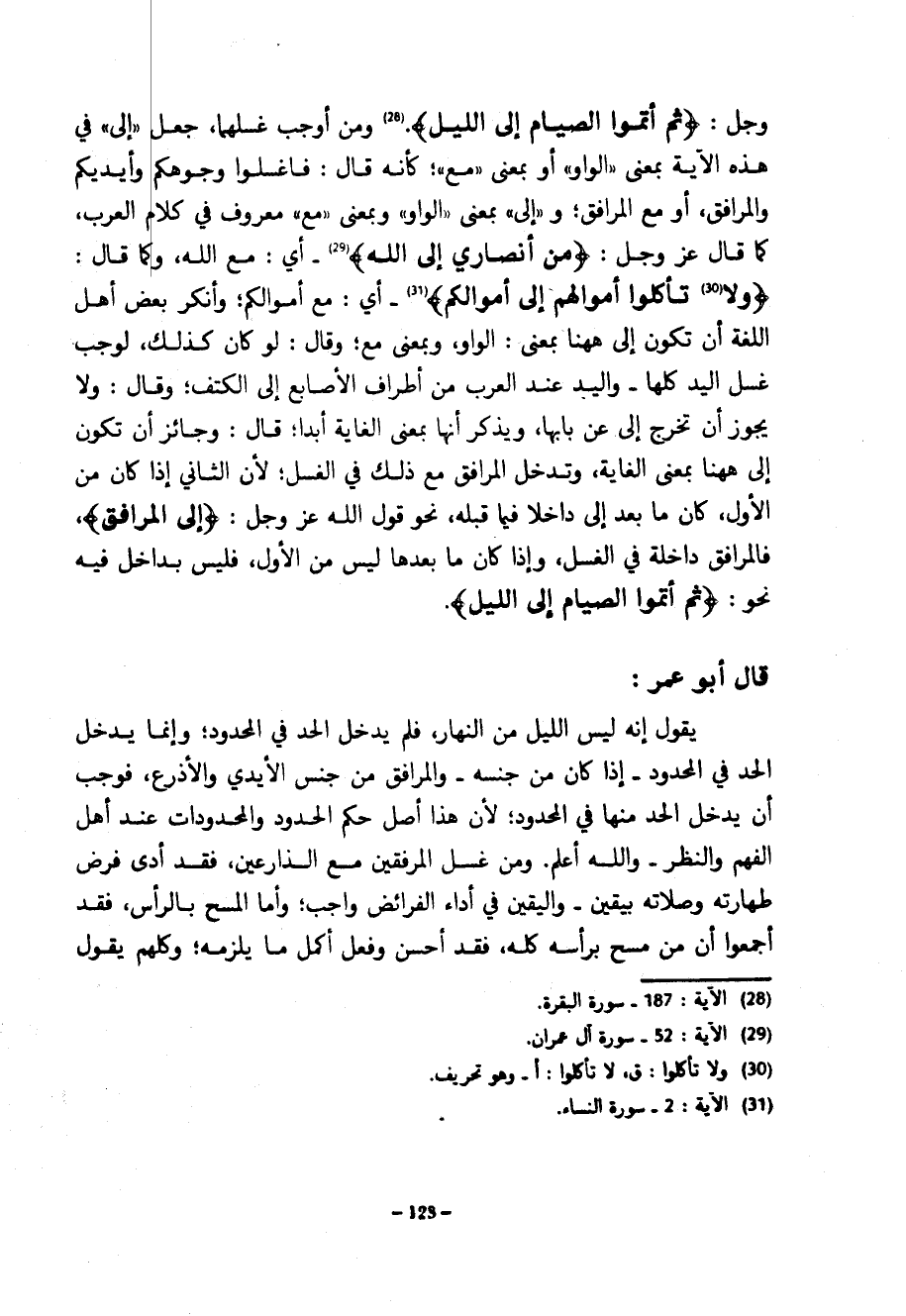 وَجَلَّ ثُمَّ أَتِمُّوا الصِّيَامَ إِلَى اللَّيْلِ وَمَنْ أَوْجَبَ غَسْلَهُمَا جَعَلَ إِلَى فِي هَذِهِ الْآيَةِ بِمَعْنَى الْوَاوِ أَوْ بِمَعْنَى مَعَ كَأَنَّهُ قَالَ فَاغْسِلُوا وُجُوهَكُمْ وَأَيْدِيَكُمْ وَالْمَرَافِقَ أَوْ مَعَ الْمَرَافِقِ وإلى بِمَعْنَى الْوَاوِ وَبِمَعْنَى مَعَ مَعْرُوفٌ فِي كَلَامِ الْعَرَبِ كَمَا قَالَ عَزَّ وَجَلَّ مَنْ أَنْصَارِي إِلَى اللَّهِ أَيْ مَعَ اللَّهِ وَكَمَا قَالَ ولا تأكلوا أمولاهم إِلَى أَمْوَالِكُمْ أَيْ مَعَ أَمْوَالِكُمْ وَأَنْكَرَ بَعْضُ أهل اللغة أن تكون إلى ههنا بمعنى الواو وبمعنى مَعَ وَقَالَ لَوْ كَانَ كَذَلِكَ لَوَجَبَ غَسْلُ الْيَدِ كُلِّهَا وَالْيَدُ عِنْدَ الْعَرَبِ مِنْ أَطْرَافِ الْأَصَابِعِ إِلَى الْكَتِفِ وَقَالَ وَلَا يَجُوزُ أَنْ تَخْرُجَ إِلَى عَنْ بَابِهَا وَيَذْكُرَ أَنَّهَا بِمَعْنَى الْغَايَةِ أَبَدًا قَالَ وَجَائِزٌ أَنْ تَكُونَ إِلَى ههنا بِمَعْنَى الْغَايَةِ وَتَدْخُلُ الْمَرَافِقَ مَعَ ذَلِكَ فِي الْغَسْلِ لِأَنَّ الثَّانِي إِذَا كَانَ مِنَ الْأَوَّلِ كا مَا بَعْدَ إِلَى دَاخِلًا فِيمَا قَبْلَهُ نَحْوَ قَوْلِ اللَّهِ عَزَّ وَجَلَّ إِلَى الْمَرَافِقِ فَالْمَرَافِقُ دَاخِلَةٌ فِي الْغَسْلِ وَإِذَا كَانَ مَا بَعْدَهَا ليس من الأول فلي بِدَاخِلٍ فِيهِ نَحْوَ ثُمَّ أَتِمُّوا الصِّيَامَ إِلَى اللَّيْلِ قَالَ أَبُو عُمَرَ يَقُولُ إِنَّهُ لَيْسَ اللَّيْلُ مِنَ النَّهَارِ فَلَمْ يَدْخُلِ الْحَدُّ فِي الْمَحْدُودِ وَإِنَّمَا يَدْخُلُ الْحَدُّ فِي الْمَحْدُودِ إِذَا كَانَ مِنْ جِنْسِهِ وَالْمَرَافِقُ مِنْ جِنْسِ الْأَيْدِي وَالْأَذْرُعِ فَوَجَبَ أَنْ يَدْخُلَ الْحَدُّ مِنْهَا فِي الْمَحْدُودِ لِأَنَّ هَذَا أَصْلُ حُكْمِ الْحُدُودِ وَالْمَحْدُودَاتِ عِنْدَ أَهْلِ الْفَهْمِ وَالنَّظَرِ وَاللَّهُ أَعْلَمُ وَمَنْ غَسَلَ الْمِرْفَقَيْنِ مَعَ الذِّرَاعَيْنِ فَقَدْ أَدَّى فَرْضَ طَهَارَتِهِ وَصَلَاتِهِ بِيَقِينٍ وَالْيَقِينُ فِي أَدَاءِ الْفَرَائِضِ واجب وأما المسح بالرأس فَقَدْ أَجْمَعُوا أَنَّ مَنْ مَسَحَ بِرَأْسِهِ كُلِّهِ فَقَدْ أَحْسَنَ وَفَعَلَ أَكْمَلَ مَا يَلْزَمُهُ وَكُلُّهُمْ يقول