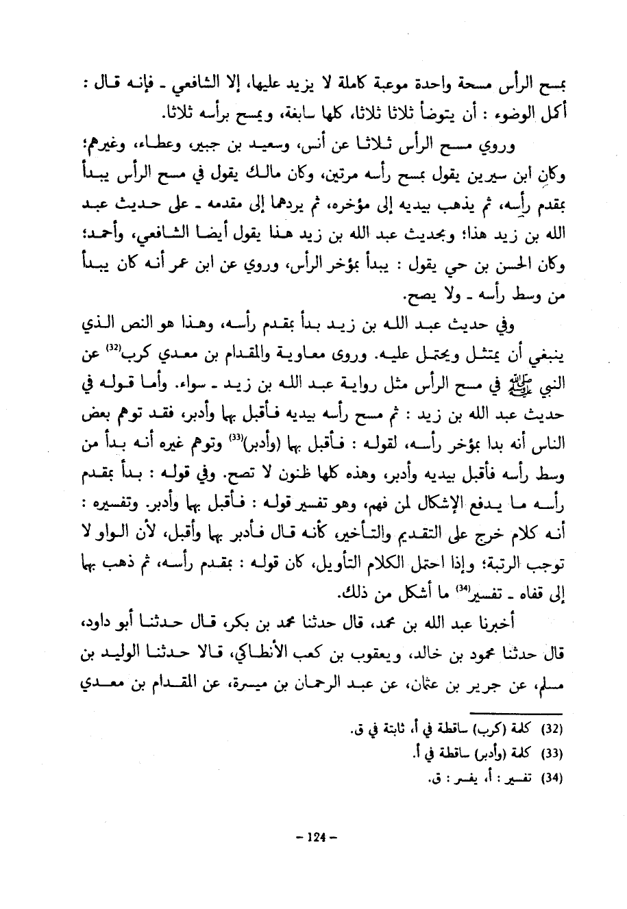 بمسح الرأس مسحة واحدة موعنة! كَامِلَةً لَا يَزِيدُ عَلَيْهَا إِلَّا الشَّافِعِيُّ فَإِنَّهُ قَالَ أَكْمَلُ الْوُضُوءِ أَنْ يَتَوَضَّأَ ثَلَاثًا ثَلَاثًا كُلُّهَا سَابِغَةٌ وَيَمْسَحَ بِرَأْسِهِ ثَلَاثًا وَرُوِيَ مَسْحُ الرَّأْسِ ثَلَاثًا عَنْ أَنَسٍ وَسَعِيدِ بْنِ جُبَيْرٍ وعطاء وغيرهم وكان ابن سرين يَقُولُ بِمَسْحِ رَأْسِهِ مَرَّتَيْنِ وَكَانَ مَالِكٌ يَقُولُ فِي مَسْحِ الرَّأْسِ يَبْدَأُ بِمُقَدَّمَ رَأْسِهِ ثُمَّ يَذْهَبُ بِيَدَيْهِ إِلَى مُؤَخَّرِهِ ثُمَّ يَرُدُّهُمَا إِلَى مُقَدَّمِهِ عَلَى حَدِيثِ عَبْدِ اللَّهِ بْنِ زَيْدٍ هَذَا وَبِحَدِيثِ عَبْدِ اللَّهِ بْنِ زَيْدٍ هَذَا يَقُولُ أَيْضًا الشَّافِعِيُّ وَأَحْمَدُ وَكَانَ الْحَسَنُ بْنُ حَيٍّ يَقُولُ يَبْدَأُ بِمُؤَخَّرِ الرَّأْسِ وَرُوِيَ عَنِ ابْنِ عُمَرَ أَنَّهُ كَانَ يَبْدَأُ مِنْ وَسَطِ رَأْسِهِ وَلَا يَصِحُّ وَفِي حَدِيثِ عَبْدِ اللَّهِ بْنِ زَيْدٍ بَدَأَ بِمُقَدَّمِ رَأْسِهِ وَهَذَا هُوَ النَّصُّ الَّذِي يَنْبَغِي أَنْ يُمْتَثَلَ وَيُحْتَمَلَ عَلَيْهِ وَرَوَى مُعَاوِيَةُ وَالْمِقْدَامُ بْنُ مَعْدِي كَرِبَ عَنِ النَّبِيِّ صَلَّى اللَّهُ عَلَيْهِ وَسَلَّمَ فِي مَسْحِ الرَّأْسِ مِثْلَ رِوَايَةِ عَبْدِ اللَّهِ بْنِ زَيْدٍ سَوَاءً وَأَمَّا قَوْلُهُ فِي حَدِيثِ عَبْدِ اللَّهِ بن زيد ثم سمح رَأْسَهُ بِيَدَيْهِ فَأَقْبَلَ بِهِمَا وَأَدْبَرَ فَقَدْ تَوَهَّمَ بَعْضُ النَّاسِ أَنَّهُ بَدَأَ بِمُؤَخَّرِ رَأْسِهِ لِقَوْلِهِ فَأَقْبَلَ بِهِمَا (وَأَدْبَرَ) وَتَوَهَّمَ غَيْرُهُ أَنَّهُ بَدَأَ من سوط رَأْسِهِ فَأَقْبَلَ بِيَدَيْهِ وَأَدْبَرَ وَهَذِهِ كُلُّهَا ظُنُونٌ لَا تَصِحُّ وَفِي قَوْلِهِ بَدَأَ بِمُقَدَّمِ رَأْسِهِ مَا يَدْفَعُ الْإِشْكَالَ لِمَنْ فَهِمَ وَهُوَ تَفْسِيرُ قَوْلِهِ فَأَقْبَلَ بِهِمَا وَأَدْبَرَ وَتَفْسِيرُهُ أَنَّهُ كَلَامٌ حرج عَلَى التَّقْدِيمِ وَالتَّأْخِيرِ كَأَنَّهُ قَالَ فَأَدْبَرَ بِهِمَا وَأَقْبَلَ لِأَنَّ الْوَاوَ لَا تُوجِبُ الرُّتْبَةَ وَإِذِ احْتَمَلَ الْكَلَامُ التَّأْوِيلَ كَانَ قَوْلُهُ بِمُقَدَّمِ رَأْسِهِ ثم ذهب هما إِلَى قَفَاهُ تَفْسِيرَ مَا أُشْكِلَ مِنْ ذَلِكَ أَخْبَرَنَا عَبْدُ اللَّهِ بْنُ مُحَمَّدٍ قَالَ حَدَّثَنَا مُحَمَّدُ بْنُ بَكْرٍ قَالَ حَدَّثَنَا أَبُو دَاوُدَ قَالَ حَدَّثَنَا مَحْمُودُ بْنُ خَالِدٍ وَيَعْقُوبُ بْنُ كَعْبٍ الْأَنْطَاكِيُّ قَالَا حَدَّثَنَا الْوَلِيدُ بْنُ مُسْلِمٍ عن جرير بن عثمان عن عبد الرحمان بْنِ مَيْسَرَةَ عَنِ الْمِقْدَامِ بْنِ مَعْدِي