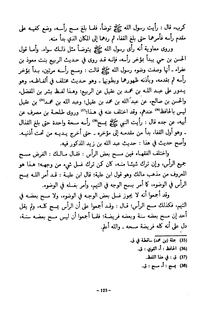 كَرِبَ قَالَ رَأَيْتُ رَسُولَ اللَّهِ صَلَّى اللَّهُ عَلَيْهِ وَسَلَّمَ تَوَضَّأَ فَلَمَّا بَلَغَ مَسْحَ رَأْسِهِ وَضَعَ كَفَّيْهِ عَلَى مُقَدَّمِ رَأْسِهِ فَأَمَرَّهُمَا حَتَّى بَلَغَ الْقَفَا ثُمَّ رَدَّهُمَا إِلَى الْمَكَانِ الَّذِي بَدَأَ مِنْهُ وَرَوَى مُعَاوِيَةُ أَنَّهُ رَأَى رَسُولَ اللَّهِ صَلَّى اللَّهُ عَلَيْهِ وَسَلَّمَ يَتَوَضَّأُ مِثْلَ ذَلِكَ سَوَاءً وَأَمَّا قَوْلُ الْحَسَنِ بْنِ حَيٍّ يَبْدَأُ بِمُؤَخَّرِ رَأْسِهِ فَإِنَّهُ قَدْ رَوَى فِي حَدِيثِ الرُّبَيِّعِ بِنْتِ مُعَوِّذِ بْنِ عَفْرَاءَ أَنَّهَا وَصَفَتْ وَضَوْءِ رَسُولِ اللَّهِ صَلَّى اللَّهُ عَلَيْهِ وَسَلَّمَ قَالَتْ وَمَسَحَ رَأْسَهُ مَرَّتَيْنِ بَدَأَ بِمُؤَخَّرِ رَأْسِهِ ثُمَّ بِمُقَدَّمِهِ وَبِأُذُنِهِ ظُهُورِهِمَا وَبُطُونِهِمَا وَهُوَ حَدِيثٌ مُخْتَلَفٌ فِي أَلْفَاظِهِ وَهُوَ يَدُورُ عَلَى عَبْدِ اللَّهِ بْنِ مُحَمَّدِ بْنِ عَقِيلٍ عَنْ الرُّبَيِّعِ وَهَذَا لَفْظُ بِشْرِ بْنِ الْمُفَضَّلِ وَالْحُسْنِ بْنِ صَالِحٍ عَنْ عَبْدِ اللَّهِ بْنِ مُحَمَّدِ بْنِ عَقِيلٍ وَعَبْدُ اللَّهِ بْنُ مُحَمَّدِ بْنِ عَقِيلٍ لَيْسَ بِالْحَافِظِ عِنْدَهُمْ وَقَدِ اخْتَلَفَ عَنْهُ فِي هَذَا وَرَوَى طَلْحَةَ بْنِ مُصَرِّفٍ عَنْ أَبِيهِ عَنْ جَدِّهِ قَالَ رَأَيْتُ النَّبِيَّ صَلَّى اللَّهُ عَلَيْهِ وَسَلَّمَ يَمْسَحُ رَأْسَهُ مَسْحَةً وَاحِدَةً حَتَّى بَلَغَ الْقَذَالَ وَهُوَ أَوَّلُ الْقَفَا بَدَأَ مِنْ مُقَدَّمِهِ إِلَى مُؤَخَّرِهِ حَتَّى أَخْرَجَ يَدَيْهِ مِنْ تَحْتِ أُذُنَيْهِ وَأَصَحُّ حَدِيثٍ فِي هَذَا حَدِيثُ عَبْدِ اللَّهِ بْنِ زَيْدٍ الْمَذْكُورُ فِيهِ وَاخْتَلَفَ الْفُقَهَاءُ فِيمَنْ مَسَحَ بَعْضَ الرَّأْسِ فَقَالَ مَالِكٌ الْفَرْضُ مَسْحُ جَمِيعِ الرَّأْسِ وَإِنْ تَرَكَ شَيْئًا مِنْهُ كَانَ كَمَنْ تَرَكَ غَسْلَ شَيْءٍ مِنْ وَجْهِهِ هَذَا هُوَ الْمَعْرُوفُ مِنْ مَذْهَبِ مَالِكٍ وَهُوَ قَوْلُ ابْنِ عُلَيَّةَ قَالَ ابْنُ عُلَيَّةَ قَدْ أَمَرَ اللَّهُ بِمَسْحِ الرَّأْسِ فِي الْوُضُوءِ كَمَا أَمَرَ مَسْحَ الْوَجْهِ فِي التَّيَمُّمِ وَأَمَرَ بِغَسْلِهِ فِي الْوُضُوءِ وَقَدْ أَجْمَعُوا أَنَّهُ لَا يَجُوزُ غَسْلُ بَعْضِ الْوَجْهِ فِي الْوُضُوءِ وَلَا مَسْحُ بَعْضِهِ فِي التَّيَمُّمِ فَكَذَلِكَ مَسْحُ الرَّأْسِ قَالَ وَقَدْ أَجْمَعُوا عَلَى أَنَّ الرَّأْسَ يُمْسَحُ كُلَّهُ وَلَمْ يَقُلْ أَحَدٌ إِنَّ مَسْحَ بَعْضِهِ سُنَّةٌ وَبَعْضِهِ فَرِيضَةٌ فَلَمَّا أَجْمَعُوا أَنْ لَيْسَ مَسْحُ بَعْضِهِ سُنَّةً دُلَّ عَلَى أَنَّهُ كُلَّهُ فَرِيضَةٌ مَسْحُهُ وَاللَّهُ أَعْلَمُ