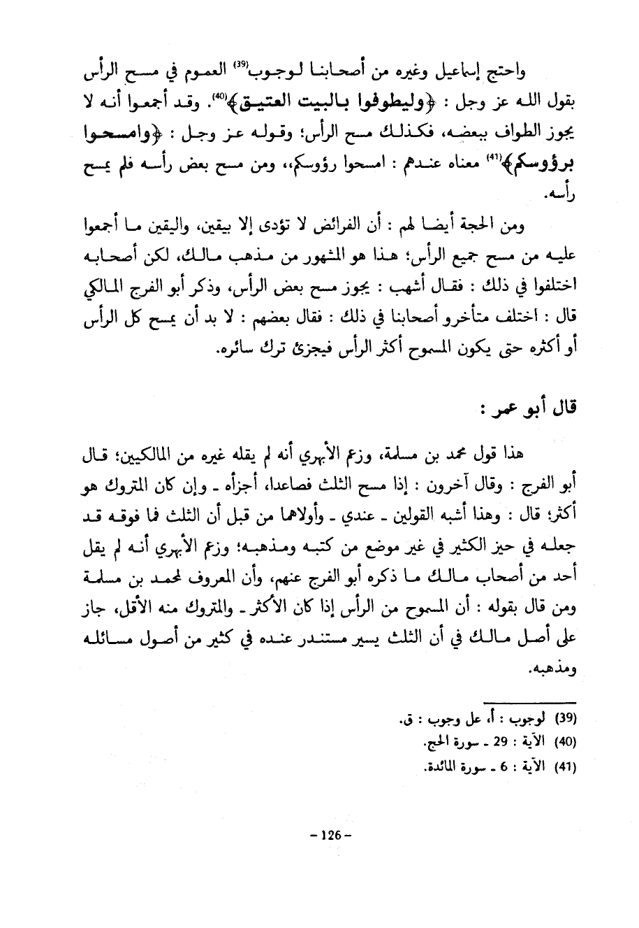 وَاحْتَجَّ إِسْمَاعِيلُ وَغَيْرُهُ مِنْ أَصْحَابِنَا لِوُجُوبِ الْعُمُومِ فِي مَسْحِ الرَّأْسِ بِقَوْلِ اللَّهِ عَزَّ وَجَلَّ وَلْيَطَّوَّفُوا بِالْبَيْتِ الْعَتِيقِ وَقَدْ أَجْمَعُوا أَنَّهُ لَا يَجُوزُ الطَّوَافُ بِبَعْضِهِ فَكَذَلِكَ مَسْحُ الرَّأْسِ وَقَوْلِهِ عز وجل وامسحوا برؤوسكم معناه عندهم امسحوا رؤوسكم وَمَنْ مَسَحَ بَعْضَ رَأْسِهِ فَلَمْ يَمْسَحْ رَأْسَهُ وَمِنَ الْحُجَّةِ أَيْضًا لَهُمْ أَنَّ الْفَرَائِضَ لَا تُؤَدَّى إِلَّا بِيَقِينٍ وَالْيَقِينُ مَا أَجْمَعُوا عَلَيْهِ مِنْ مَسْحِ جَمِيعِ الرَّأْسِ هَذَا هُوَ الْمَشْهُورُ مِنْ مَذْهَبِ مَالِكٍ لَكِنَّ أَصْحَابَهُ اخْتَلَفُوا فِي ذَلِكَ فَقَالَ أَشْهَبُ يَجُوزُ مَسْحُ بَعْضِ الرَّأْسِ وَذَكَرَ أَبُو الْفَرَجِ الْمَالِكِيُّ قَالَ اخْتَلَفَ مُتَأَخِّرُو أَصْحَابِنَا فِي ذَلِكَ فَقَالَ بَعْضُهُمْ لَا بُدَّ أَنْ يُمْسِحَ كُلُّ الرَّأْسِ أَوْ أَكْثَرُهُ حَتَّى يكون المسموح أَكْثَرَ الرَّأْسِ فَيُجْزِئُ تُرْكُ سَائِرِهِ قَالَ أَبُو عُمَرَ هَذَا قَوْلُ مُحَمَّدِ بْنِ مَسْلَمَةَ وَزَعَمَ الْأَبْهَرِيُّ أَنَّهُ لَمْ يَقُلْهُ غَيْرُهُ مِنَ الْمَالِكِيِّينَ قَالَ أَبُو الْفَرَجِ وَقَالَ آخَرُونَ إِذَا مَسَحَ الثلث فصاعدا أجزأه وإن كان المتروك هو أَكْثَرَ قَالَ وَهَذَا أَشْبَهُ الْقَوْلَيْنِ عِنْدِي وَأَوْلَاهُمَا مِنْ قِبَلِ أَنَّ الثُّلُثَ فَمَا فَوْقَهُ قَدْ جَعَلَهُ فِي حَيِّزِ الْكَثِيرِ فِي غَيْرِ مَوْضِعٍ مِنْ كُتُبِهِ وَمَذْهَبِهِ وَزَعَمَ الْأَبْهَرِيُّ أَنَّهُ لَمْ يَقُلْ أَحَدٌ مِنْ أَصْحَابِ مَالِكٍ مَا ذَكَرَهُ أَبُو الْفَرَجِ عَنْهُمْ وَأَنَّ الْمَعْرُوفَ لِمُحَمَّدِ بْنِ مسلمة ومن قال بقوله أن المسموح مِنَ الرَّأْسِ إِذَا كَانَ الْأَكْثَرُ وَالْمَتْرُوكَ مِنْهُ الْأَقَلُّ جَازَ عَلَى أَصْلِ مَالِكٍ فِي أَنَّ الثُّلُثَ يَسِيرٌ مُسْتَنْدَرٌ عِنْدَهُ فِي كَثِيرٍ مِنْ أُصُولِ مَسَائِلِهِ وَمَذْهَبِهِ