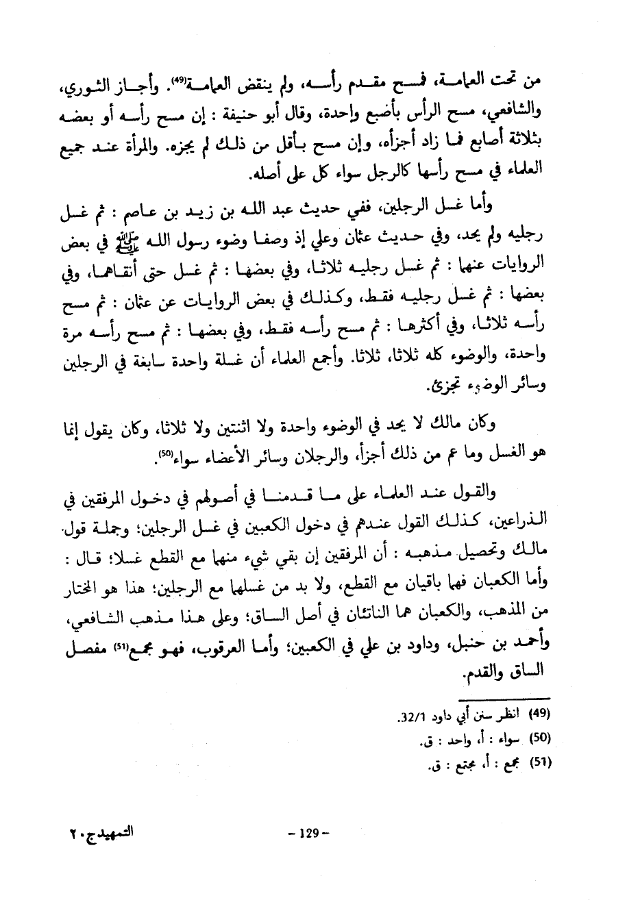 مِنْ تَحْتِ الْعِمَامَةِ فَمَسَحَ مُقَدَّمَ رَأْسِهِ وَلَمْ يَنْقُضِ الْعِمَامَةَ وَأَجَازَ الثَّوْرِيُّ وَالشَّافِعِيُّ مَسْحَ الرَّأْسِ بِإِصْبَعٍ وَاحِدَةٍ وَقَالَ أَبُو حَنِيفَةَ إِنْ مَسَحَ رَأْسَهُ أَوْ بَعْضَهُ بِثَلَاثَةِ أَصَابِعَ فَمَا زَادَ أجزأه وإن مسح بأقل من ذلك لم يجزه وَالْمَرْأَةُ عِنْدَ جَمِيعِ الْعُلَمَاءِ فِي مَسْحِ رَأْسِهَا كالرجل سواء كُلٌّ عَلَى أَصْلِهِ وَأَمَّا غَسْلُ الرِّجْلَيْنِ فَفِي حَدِيثِ عَبْدِ اللَّهِ بْنِ زَيْدِ بْنِ عَاصِمٍ ثُمَّ غَسَلَ رِجْلَيْهِ وَلَمْ يَحُدَّ وَفِي حَدِيثِ عُثْمَانَ وَعَلِيٍّ إِذْ وَصَفَا وَضَوْءِ رَسُولِ اللَّهِ صَلَّى اللَّهُ عَلَيْهِ وَسَلَّمَ فِي بَعْضِ الرِّوَايَاتِ عَنْهُمَا ثُمَّ غَسَلَ رِجْلَيْهِ ثَلَاثًا وَفِي بَعْضِهَا ثم غغسل حَتَّى أَنْقَاهُمَا وَفِي بَعْضِهَا ثُمَّ غَسَلَ رِجْلَيْهِ فَقَطْ وَكَذَلِكَ فِي بَعْضِ الرِّوَايَاتِ عَنْ عُثْمَانَ ثم سمح رَأْسَهُ ثَلَاثًا وَفِي أَكْثَرِهَا ثُمَّ مَسَحَ رَأْسَهُ فَقَطْ وَفِي بَعْضِهَا ثُمَّ مَسَحَ رَأْسَهُ مَرَّةً وَاحِدَةً وَالْوُضُوءُ كُلُّهُ ثَلَاثًا ثَلَاثًا وَأَجْمَعَ الْعُلَمَاءَ أَنَّ غَسْلَةً وَاحِدَةً سَابِغَةً فِي الرِّجْلَيْنِ وَسَائِرِ الْوُضُوءِ تُجْزِئُ وَكَانَ مَالِكٌ لَا يَحُدُّ فِي الْوُضُوءِ وَاحِدَةً وَلَا اثْنَتَيْنِ وَلَا ثَلَاثًا وَكَانَ يَقُولُ إِنَّمَا هُوَ الْغَسْلُ وَمَا عَمَّ مِنْ ذَلِكَ أَجْزَأَ وَالرِّجْلَانِ وَسَائِرُ الْأَعْضَاءِ سَوَاءٌ وَالْقَوْلُ عِنْدَ الْعُلَمَاءِ عَلَى مَا قَدَّمْنَا فِي أُصُولِهِمْ فِي دُخُولِ الْمِرْفَقَيْنِ فِي الذِّرَاعَيْنِ كَذَلِكَ الْقَوْلُ عِنْدَهُمْ فِي دُخُولِ الْكَعْبَيْنِ فِي غَسْلِ الرِّجْلَيْنِ وَجُمْلَةُ قَوْلِ مَالِكٍ وَتَحْصِيلُ مَذْهَبِهِ أَنَّ الْمِرْفَقَيْنِ إِنْ بَقِيَ شَيْءٌ مِنْهُمَا مَعَ الْقَطْعِ غُسِلَا قَالَ وَأَمَّا الْكَعْبَانِ فَهُمَا بَاقِيَانِ مَعَ الْقَطْعِ وَلَا بُدَّ مِنْ غَسْلِهِمَا مَعَ الرِّجْلَيْنِ هَذَا هُوَ الْمُخْتَارُ مِنَ الْمَذْهَبِ وَالْكَعْبَانِ هُمَا النَّاتِئَانِ فِي أَصْلِ السَّاقِ وَعَلَى هَذَا مَذْهَبُ الشَّافِعِيِّ وَأَحْمَدَ بْنِ حَنْبَلٍ وَدَاوُدَ بْنِ عَلِيٍّ فِي الْكَعْبَيْنِ وَأَمَّا الْعُرْقُوبُ فَهُوَ مَجْمَعُ مَفْصِلِ السَّاقِ والقدم