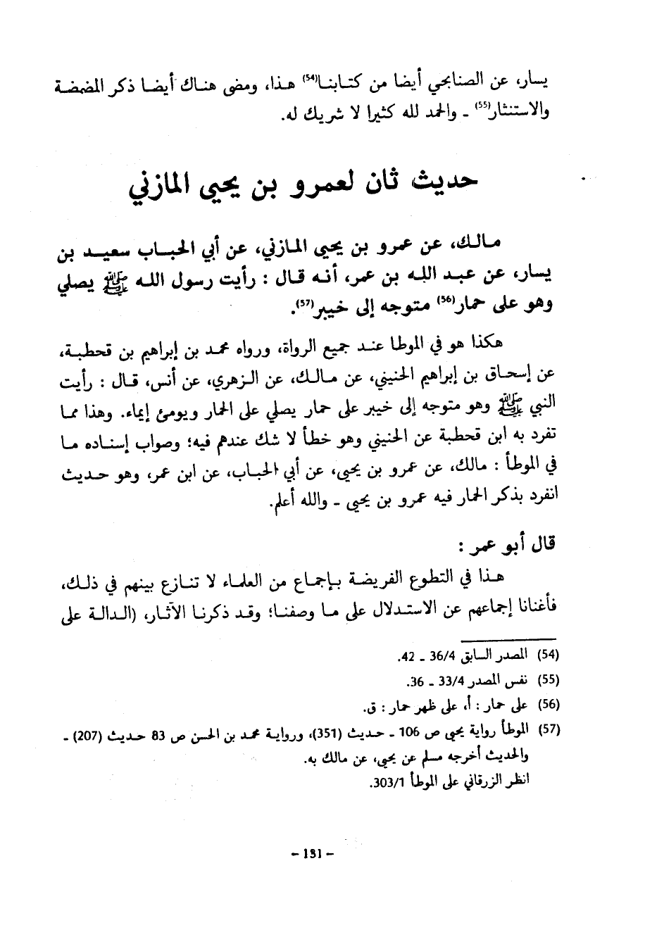 حَدِيثٌ ثَانٍ لِعَمْرِو بْنِ يَحْيَى الْمَازِنِيِّ مَالِكٌ عَنْ عَمْرِو بْنِ يَحْيَى الْمَازِنِيِّ عَنْ أَبِي الْحُبَابِ سَعِيدِ بْنِ يَسَارٍ عَنْ عَبْدِ اللَّهِ بْنِ عُمَرَ أَنَّهُ قَالَ رَأَيْتُ رَسُولَ اللَّهِ صَلَّى اللَّهُ عَلَيْهِ وَسَلَّمَ يُصَلِّي وهو على حمار مُتَوَجِّهٌ إِلَى خَيْبَرَ هَكَذَا هُوَ فِي الْمُوَطَّأِ عِنْدَ جَمِيعِ الرُّوَاةِ وَرَوَاهُ مُحَمَّدُ بْنُ إِبْرَاهِيمَ بْنِ قَحْطَبَةَ عَنْ إِسْحَاقَ بْنِ إِبْرَاهِيمَ الْحُنَيْنِيِّ عَنْ مَالِكٍ عَنِ الزُّهْرِيِّ عَنْ أَنَسٍ قَالَ رَأَيْتُ النَّبِيَّ صَلَّى اللَّهُ عَلَيْهِ وَسَلَّمَ وَهُوَ مُتَوَجِّهٌ إِلَى خَيْبَرَ عَلَى حِمَارٍ يُصَلِّي عَلَى الْحِمَارِ وَيُومِئُ إِيمَاءً وَهَذَا مِمَّا تَفَرَّدَ بِهِ ابْنُ قَحْطَبَةَ عَنِ الْحُنَيْنِيِّ وَهُوَ خَطَأٌ لَا شَكَّ عِنْدَهُمْ فِيهِ وَصَوَابُ إِسْنَادِهِ مَا فِي الْمُوَطَّإِ مَالِكٌ عَنْ عَمْرِو بْنِ يَحْيَى عَنْ أَبِي الْحُبَابِ عَنِ ابْنِ عُمَرَ وَهُوَ حَدِيثٌ انْفَرَدَ بِذِكْرِ الْحِمَارِ فِيهِ عَمْرُو بْنُ يَحْيَى وَاللَّهُ أَعْلَمُ قَالَ أَبُو عُمَرَ هَذَا فِي التطوع الْفَرِيضَةِ بِإِجْمَاعٍ مِنَ الْعُلَمَاءِ لَا تَنَازُعَ بَيْنَهُمْ فِي ذَلِكَ فَأَغْنَانَا إِجْمَاعُهُمْ عَنْ الِاسْتِدْلَالِ عَلَى مَا وَصَفْنَا وَقَدْ ذَكَرْنَا الْآثَارَ (الدَّالَّةَ عَلَى