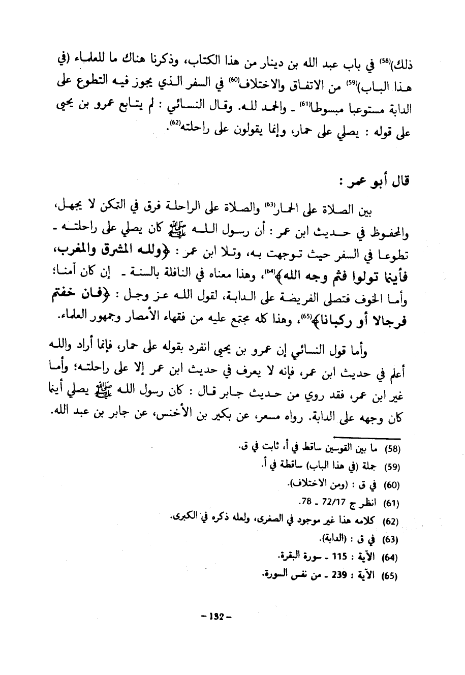 ذَلِكَ) فِي بَابِ عَبْدِ اللَّهِ بْنِ دِينَارٍ مِنْ هَذَا الْكِتَابِ وَذَكَرْنَا هُنَاكَ مَا لِلْعُلَمَاءِ (فِي هَذَا الْبَابِ) مِنْ الِاتِّفَاقِ وَالِاخْتِلَافِ فِي السفر الذي جوز فِيهِ التَّطَوُّعُ عَلَى الدَّابَّةِ مُسْتَوْعَبًا مَبْسُوطًا وَالْحَمْدُ لِلَّهِ وَقَالَ النَّسَائِيُّ لَمْ يُتَابَعْ عَمْرُو بْنُ يَحْيَى عَلَى قَوْلِهِ يُصَلِّي عَلَى حِمَارٍ وَإِنَّمَا يَقُولُونَ عَلَى رَاحِلَتِهِ قَالَ أَبُو عُمَرَ بَيْنَ الصَّلَاةِ عَلَى الْحِمَارِ وَالصَّلَاةِ عَلَى الرَّاحِلَةِ فَرْقٌ فِي التَّمَكُّنِ لَا يُجْهَلُ وَالْمَحْفُوظُ فِي حَدِيثِ ابْنِ عُمَرَ أَنَّ رَسُولَ اللَّهِ صَلَّى اللَّهُ عَلَيْهِ وَسَلَّمَ كَانَ يُصَلِّي عَلَى رَاحِلَتِهِ تَطَوُّعًا فِي السَّفَرِ حَيْثُ تَوَجَّهَتْ بِهِ وَتَلَا ابْنُ عُمَرَ وَلِلَّهِ الْمَشْرِقُ وَالْمَغْرِبُ فَأَيْنَمَا تُوَلُّوا فَثَمَّ وَجْهُ اللَّهِ وَهَذَا مَعْنَاهُ فِي النَّافِلَةِ بِالسُّنَّةِ إِنْ كَانَ آمِنًا وَأَمَّا الْخَوْفُ فَتُصَلَّى الْفَرِيضَةُ عَلَى الدَّابَّةِ لِقَوْلِ اللَّهِ عَزَّ وَجَلَّ فَإِنْ خِفْتُمْ فَرِجَالًا أَوْ رُكْبَانًا وَهَذَا كُلُّهُ مُجْتَمَعٌ عَلَيْهِ مِنْ فُقَهَاءِ الْأَمْصَارِ وَجُمْهُورِ الْعُلَمَاءِ وَأَمَّا قَوْلُ النَّسَائِيِّ إِنَّ عَمْرَو بْنَ يَحْيَى انْفَرَدَ بِقَوْلِهِ عَلَى حِمَارٍ فَإِنَّمَا أَرَادَ وَاللَّهُ أَعْلَمُ فِي حَدِيثِ ابْنِ عُمَرَ فَإِنَّهُ لَا يُعْرَفُ فِي حَدِيثِ ابْنِ عُمَرَ إِلَّا عَلَى رَاحِلَتِهِ وَأَمَّا غَيْرُ ابْنِ عُمَرَ فَقَدْ رُوِيَ مِنْ حَدِيثِ جَابِرٍ قَالَ كَانَ رَسُولُ اللَّهِ صَلَّى اللَّهُ عَلَيْهِ وَسَلَّمَ يُصَلِّي أَيْنَمَا كَانَ وَجْهُهُ عَلَى الدَّابَّةِ رَوَاهُ مِسْعَرٌ عَنْ بُكَيْرِ بْنِ الْأَخْنَسِ عَنْ جَابِرِ بْنِ عَبْدِ اللَّهِ