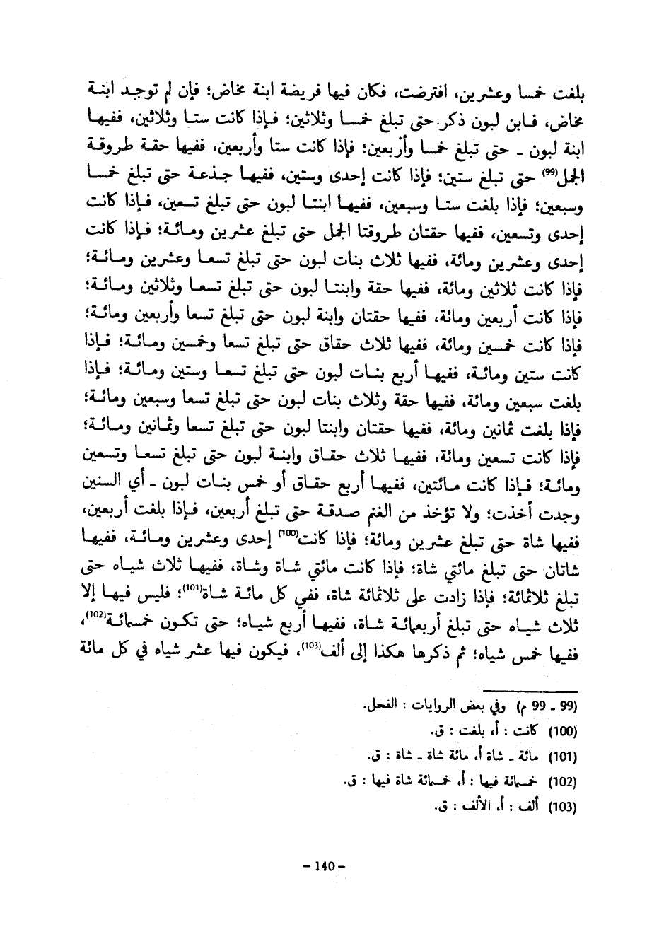 بَلَغَتْ خَمْسًا وَعِشْرِينَ افْتَرَضَتْ فَكَانَ فِيهَا فَرِيضَةُ ابنة مخاض فإن لم توجد ابنة مخاص فَابْنُ لَبُونٍ ذَكَرٌ حَتَّى تَبْلُغَ خَمْسًا وَثَلَاثِينَ فَإِذَا كَانَتْ سِتًّا وَثَلَاثِينَ فَفِيهَا ابْنَةُ لَبُونٍ حَتَّى تَبْلُغَ خَمْسًا وَأَرْبَعِينَ فَإِذَا كَانَتْ سِتًّا وَأَرْبَعِينَ فَفِيهَا حِقَّةٌ طَرُوقَةُ الْجَمَلِ حَتَّى تَبْلُغَ سِتِّينَ فَإِذَا كَانَتْ إِحْدَى وَسِتِّينَ فَفِيهَا جَذَعَةٌ حَتَّى تَبْلُغَ خَمْسًا وَسَبْعِينَ فَإِذَا بَلَغَتْ سِتًّا وَسَبْعِينَ فَفِيهَا ابْنَتَا لَبُونٍ حَتَّى تَبْلُغَ تِسْعِينَ فَإِذَا كَانَتْ إِحْدَى وَتِسْعِينَ فَفِيهَا حِقَّتَانِ طَرُوقَتَا الْجَمَلِ حَتَّى تَبْلُغَ عِشْرِينَ وَمِائَةً فَإِذَا كَانَتْ إِحْدَى وَعِشْرِينَ وَمِائَةً فَفِيهَا ثَلَاثُ بَنَاتِ لَبُونٍ حتى تبلغ تسعا وعشرين مائة فَإِذَا كَانَتْ ثَلَاثِينَ وَمِائَةً فَفِيهَا حِقَّةٌ وَابْنَتَا لَبُونٍ حَتَّى تَبْلُغَ تِسْعًا وَثَلَاثِينَ وَمِائَةً فَإِذَا كَانَتْ أَرْبَعِينَ وَمِائَةً فَفِيهَا حِقَّتَانِ وَابْنَةُ لَبُونٍ حَتَّى تَبْلُغَ تِسْعًا وَأَرْبَعِينَ وَمِائَةً فَإِذَا كَانَتْ خَمْسِينَ وَمِائَةً فَفِيهَا ثَلَاثُ حِقَاقٍ حَتَّى تَبْلُغَ تِسْعًا وَخَمْسِينَ وَمِائَةً فَإِذَا كَانَتْ سِتِّينَ وَمِائَةً فَفِيهَا أَرْبَعُ بَنَاتِ لَبُونٍ حَتَّى تَبْلُغَ تِسْعًا وَسِتِّينَ وَمِائَةً فَإِذَا بَلَغَتْ سَبْعِينَ وَمِائَةً فَفِيهَا حقة وثلاث لبون بنات حَتَّى تَبْلُغَ تِسْعًا وَسَبْعِينَ وَمِائَةً فَإِذَا بَلَغَتْ ثَمَانِينَ وَمِائَةً فَفِيهَا حِقَّتَانِ وَابْنَتَا لَبُونٍ حَتَّى تَبْلُغَ تِسْعًا وَثَمَانِينَ وَمِائَةً فَإِذَا كَانَتْ تِسْعِينَ وَمِائَةً فَفِيهَا ثَلَاثُ حِقَاقٍ وَابْنَةُ لَبُونٍ حَتَّى تَبْلُغَ تِسْعًا وَتِسْعِينَ وَمِائَةً فَإِذَا كَانَتْ مِائَتَيْنِ فَفِيهَا أَرْبَعُ حِقَاقٍ أَوْ خَمْسُ بَنَاتِ لَبُونٍ أَيُّ السِّنِينَ وُجِدَتْ أُخِذَتْ وَلَا تُؤْخَذُ مِنَ الْغَنَمِ صَدَقَةٌ حَتَّى تَبْلُغَ أَرْبَعِينَ فَإِذَا بَلَغَتْ أَرْبَعِينَ فَفِيهَا شَاةٌ حَتَّى تَبْلُغَ عِشْرِينَ وَمِائَةً فَإِذَا كَانَتْ إِحْدَى وَعِشْرِينَ وَمِائَةً فَفِيهَا شَاتَانِ حَتَّى تَبْلُغَ مِائَتَيْ شَاةٍ فَإِذَا كَانَتْ مِائَتَيْ شَاةٍ وَشَاةً فَفِيهَا ثَلَاثُ شِيَاهٍ حَتَّى تَبْلُغَ ثَلَاثَمِائَةٍ فَإِذَا زَادَتْ عَلَى ثَلَاثِمِائَةِ شَاةٍ فَفِي كُلِّ مِائَةٍ شَاةٌ فَلَيْسَ فِيهَا إِلَّا ثَلَاثُ شِيَاهٍ حَتَّى تَبْلُغَ أَرْبَعَمِائَةِ شَاةٍ فَفِيهَا أَرْبَعُ شِيَاهٍ حَتَّى تَكُونَ خَمْسَمِائَةٍ فَفِيهَا خَمْسُ شِيَاهٍ ثُمَّ ذَكَرَهَا هَكَذَا إِلَى أَلْفٍ فَيَكُونُ فِيهَا عَشْرُ شِيَاهٍ فِي كُلِّ مِائَةِ
