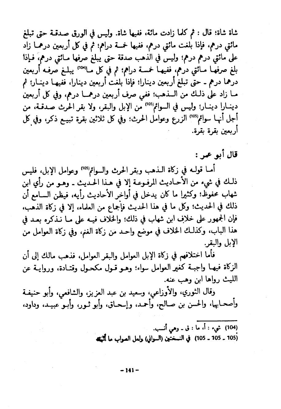 شَاةٍ شَاةٌ قَالَ ثُمَّ كُلَّمَا زَادَتْ مِائَةً ففيها شاة ولس فِي الْوَرِقِ صَدَقَةٌ حَتَّى تَبْلُغَ مِائَتَيْ دِرْهَمٍ فَإِذَا بَلَغَتْ مِائَتَيْ دِرْهَمٍ فَفِيهَا خَمْسَةُ دَرَاهِمَ ثم في كل أربعين ردهما زَادَ عَلَى مِائَتَيْ دِرْهَمٍ دِرْهَمٌ وَلَيْسَ فِي الذَّهَبِ صَدَقَةٌ حَتَّى يَبْلُغَ صَرْفُهَا مِائَتَيْ دِرْهَمٍ فَإِذَا بَلَغَ صَرْفُهَا مِائَتَيْ دِرْهَمٍ فَفِيهَا خَمْسَةُ دَرَاهِمَ ثُمَّ فِي كُلِّ مَا يَبْلُغُ صَرْفُهُ أَرْبَعِينَ دِرْهَمًا دِرْهَمٌ حَتَّى تَبْلُغَ أَرْبَعِينَ دِينَارًا فَإِذَا بَلَغَتْ أَرْبَعِينَ دِينَارًا فَفِيهَا دِينَارٌ ثُمَّ مَا زَادَ عَلَى ذَلِكَ مِنَ الذَّهَبِ فَفِي صَرْفِ أَرْبَعِينَ دِرْهَمًا دِرْهَمٌ وَفِي كُلِّ أَرْبَعِينَ دِينَارًا دِينَارٌ وَلَيْسَ فِي السَّوَائِمِ مِنَ الْإِبِلِ وَالْبَقَرِ وَلَا بَقَرِ الْحَرْثِ صَدَقَةٌ مِنْ أَجْلِ أَنَّهَا سَوَائِمُ الزَّرْعِ وَعَوَامِلُ الْحَرْثِ وَفِي كُلِّ ثَلَاثِينَ بَقَرَةً تَبِيعٌ ذَكَرٌ وَفِي كُلِّ أَرْبَعِينَ بَقَرَةً بَقَرَةٌ قَالَ أَبُو عُمَرَ أَمَّا قَوْلُهُ في زكاة الذهب وبقر الحرث والسوائم عوامل الْإِبِلِ فَلَيْسَ ذَلِكَ فِي شَيْءٍ مِنَ الْأَحَادِيثِ الْمَرْفُوعَةِ إِلَّا فِي هَذَا الْحَدِيثِ وَهُوَ مِنْ رَأْيِ ابْنِ شِهَابٍ مَحْفُوظٌ وَكَثِيرًا مَا كَانَ يدخل في أواخر الحاديث رَأْيَهُ فَيَظُنُّ السَّامِعُ أَنَّ ذَلِكَ فِي الْحَدِيثِ وَكُلُّ مَا فِي هَذَا الْحَدِيثِ فَإِجْمَاعٌ مِنَ الْعُلَمَاءِ إِلَّا فِي زَكَاةِ الذَّهَبِ فَإِنَّ الْجُمْهُورَ عَلَى خِلَافِ ابْنِ شِهَابٍ فِي ذَلِكَ وَالْخِلَافُ فِيهِ عَلَى مَا نَذْكُرُهُ بَعْدُ فِي هَذَا الْبَابِ وَكَذَلِكَ الْخِلَافُ فِي مَوْضِعٍ وَاحِدٍ مِنْ زَكَاةِ الْغَنَمِ وَفِي زَكَاةِ الْعَوَامِلِ مِنَ الْإِبِلِ وَالْبَقَرِ فَأَمَّا اخْتِلَافُهُمْ فِي زَكَاةِ الْإِبِلِ الْعَوَامِلِ وَالْبَقَرِ الْعَوَامِلِ فَذَهَبَ مَالِكٌ إِلَى أَنَّ الزَّكَاةَ فِيهَا وَاجِبَةٌ كَغَيْرِ الْعَوَامِلِ سَوَاءً وَهُوَ قَوْلُ مَكْحُولٍ وَقَتَادَةَ وَرِوَايَةٌ عَنِ اللَّيْثِ رَوَاهَا ابْنُ وَهْبٍ عَنْهُ وَقَالَ الثَّوْرِيُّ وَالْأَوْزَاعِيُّ وَسَعِيدُ بْنُ عَبْدِ الْعَزِيزِ وَالشَّافِعِيُّ وَأَبُو حَنِيفَةَ وَأَصْحَابُهُمَا وَالْحَسَنُ بْنُ صَالِحٍ وَأَحْمَدُ وَإِسْحَاقُ وَأَبُو ثَوْرٍ وَأَبُو عُبَيْدٍ وَدَاوُدُ