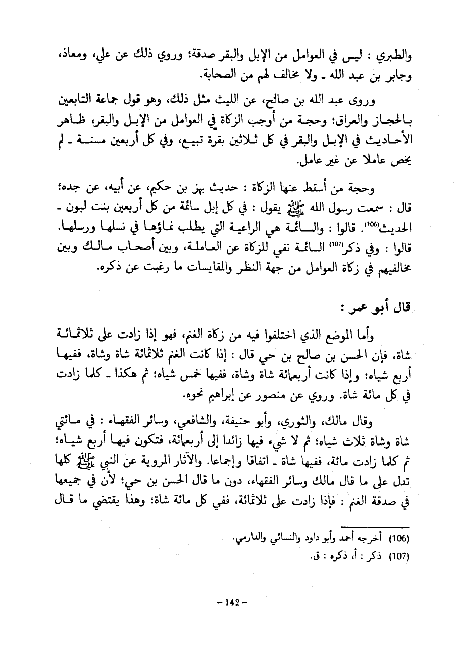وَالطَّبَرِيُّ لَيْسَ فِي الْعَوَامِلِ مِنَ الْإِبِلِ وَالْبَقَرِ صَدَقَةٌ وَرُوِيَ ذَلِكَ عَنْ عَلِيٍّ وَمُعَاذٍ وَجَابِرِ بْنِ عَبْدِ اللَّهِ وَلَا مُخَالِفَ لَهُمْ مِنَ الصَّحَابَةِ وَرَوَى عَبْدُ اللَّهِ بْنُ صَالِحٍ عَنِ اللَّيْثِ مِثْلَ ذَلِكَ وَهُوَ قَوْلُ جَمَاعَةِ التَّابِعِينَ بِالْحِجَازِ وَالْعِرَاقِ وَحُجَّةُ مَنْ أَوْجَبَ الزَّكَاةَ فِي الْعَوَامِلِ مِنَ الْإِبِلِ وَالْبَقَرِ ظَاهِرُ الْأَحَادِيثِ فِي الْإِبِلِ وَالْبَقَرِ فِي كُلِّ ثَلَاثِينَ بَقَرَةً تَبِيعٌ وَفِي كُلِّ أَرْبَعِينَ مُسِنَّةٌ لَمْ يَخُصَّ عَامِلًا عَنْ غَيْرِ عَامِلٍ وَحُجَّةُ مَنْ أَسْقَطَ عَنْهَا الزَّكَاةَ حَدِيثُ بَهْزُ بْنُ حَكِيمٍ عَنْ أَبِيهِ عَنْ جَدِّهِ قَالَ سَمِعْتُ رَسُولَ اللَّهِ صَلَّى اللَّهُ عَلَيْهِ وَسَلَّمَ يَقُولُ فِي كُلِّ إِبِلٍ سَائِمَةٍ مِنْ كُلِّ أَرْبَعِينَ بِنْتُ لَبُونٍ الْحَدِيثَ قَالُوا وَالسَّائِمَةُ هِيَ الرَّاعِيَةُ الَّتِي يُطْلَبُ نَمَاؤُهَا فِي نَسْلِهَا وَرِسْلِهَا قَالُوا وَفِي ذِكْرِ السَّائِمَةِ نَفْيٌ لِلزَّكَاةِ عَنِ الْعَامِلَةِ وَبَيْنَ أَصْحَابِ مَالِكٍ وَبَيْنَ مُخَالِفِيهِمْ فِي زَكَاةِ الْعَوَامِلِ مِنْ جِهَةِ النَّظَرِ وَالْمُقَايَسَاتِ مَا رَغِبْتُ عَنْ ذِكْرِهِ قَالَ أَبُو عُمَرَ وَأَمَّا الْمَوْضِعُ الَّذِي اخْتَلَفُوا فِيهِ مِنْ زَكَاةِ الْغَنَمِ فَهُوَ إِذَا زَادَتْ عَلَى ثَلَاثِمِائَةِ شَاةٍ فَإِنَّ الْحَسَنَ بْنَ صَالِحِ بْنِ حَيٍّ قَالَ إِذَا كَانَتِ الْغَنَمُ ثَلَاثَمِائَةِ شَاةٍ وَشَاةً فَفِيهَا أَرْبَعُ شِيَاهٍ وَإِذَا كَانَتْ أَرْبَعَمِائَةِ شَاةٍ وَشَاةً فَفِيهَا خَمْسُ شِيَاهٍ ثُمَّ هَكَذَا كُلَّمَا زَادَتْ فِي كُلِّ مِائَةٍ شَاةٌ وَرُوِيَ عَنْ مَنْصُورٍ عَنْ إِبْرَاهِيمَ نَحْوَهُ وَقَالَ مَالِكٌ وَالثَّوْرِيُّ وَأَبُو حَنِيفَةَ وَالشَّافِعِيُّ وَسَائِرُ الْفُقَهَاءِ فِي مِائَتَيْ شَاةٍ وَشَاةٍ ثَلَاثُ شِيَاهٍ ثُمَّ لَا شَيْءَ فِيهَا زَائِدًا إِلَى أَرْبَعِمِائَةٍ فَتَكُونُ فِيهَا أَرْبَعُ شِيَاهٍ ثُمَّ كُلَّمَا زَادَتْ مِائَةً فَفِيهَا شَاةٌ اتِّفَاقًا وَإِجْمَاعًا وَالْآثَارُ الْمَرْوِيَّةَ عَنِ النَّبِيِّ صَلَّى اللَّهُ عَلَيْهِ وَسَلَّمَ كُلُّهَا تَدُلُّ عَلَى مَا قَالَ مَالِكٌ وَسَائِرُ الْفُقَهَاءِ دُونَ مَا قَالَ الْحَسَنُ بْنُ حَيٍّ لِأَنَّ فِي جَمِيعِهَا فِي صَدَقَةِ الْغَنَمِ فَإِذَا زَادَتْ عَلَى ثَلَاثِمِائَةٍ فَفِي كُلِّ مِائَةٍ شَاةٌ وَهَذَا يَقْتَضِي مَا قال
