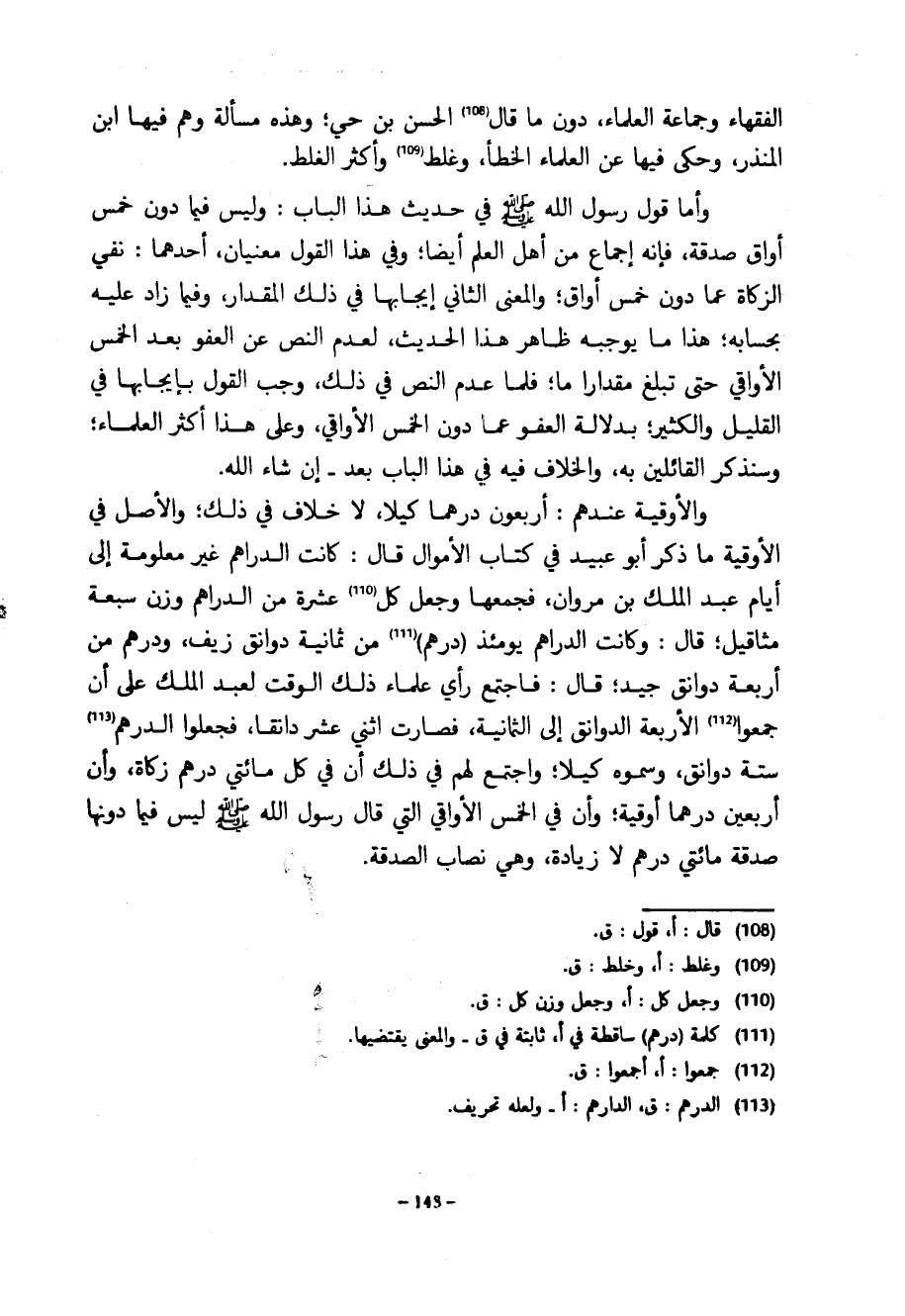 الْفُقَهَاءُ وَجَمَاعَةُ الْعُلَمَاءِ دُونَ مَا قَالَ الْحَسَنُ بْنُ حَيٍّ وَهَذِهِ مَسْأَلَةٌ وَهِمَ فِيهَا ابْنُ الْمُنْذِرِ وَحَكَى فِيهَا عَنِ الْعُلَمَاءِ الْخَطَأَ وَغَلِطَ وَأَكْثَرَ الْغَلَطَ وَأَمَّا قَوْلُ رَسُولِ اللَّهِ صَلَّى اللَّهُ عَلَيْهِ وَسَلَّمَ فِي حَدِيثِ هَذَا الْبَابِ وَلَيْسَ فِيمَا دُونَ خَمْسِ أَوَاقٍ صَدَقَةٌ فَإِنَّهُ إِجْمَاعٌ مِنْ أَهْلِ الْعِلْمِ أَيْضًا وَفِي هَذَا الْقَوْلِ مَعْنَيَانِ أَحَدُهُمَا نَفْيُ الزَّكَاةِ عَمَّا دُونَ خَمْسِ أَوَاقٍ وَالْمَعْنَى الثَّانِي إِيجَابُهَا فِي ذَلِكَ الْمِقْدَارِ وَفِيمَا زَادَ عَلَيْهِ بِحِسَابِهِ هَذَا مَا يُوجِبُهُ ظَاهِرُ هَذَا الْحَدِيثِ لِعَدَمِ النَّصِّ عَنِ الْعَفْوِ بَعْدَ الْخَمْسِ الْأَوَاقِي حَتَّى تُبْلُغَ مِقْدَارًا مَا فَلَمَّا عُدِمَ النَّصُّ فِي ذَلِكَ وَجَبَ الْقَوْلُ بِإِيجَابِهَا فِي الْقَلِيلِ وَالْكَثِيرِ بِدَلَالَةِ الْعَفْوِ عَمَّا دُونَ الْخَمْسِ الْأَوَاقِي وَعَلَى هَذَا أَكْثَرُ الْعُلَمَاءِ وَسَنَذْكُرُ الْقَائِلِينَ بِهِ وَالْخِلَافَ فِيهِ فِي هَذَا الْبَابِ بَعْدُ إِنْ شَاءَ اللَّهُ وَالْأُوقِيَّةُ عِنْدَهُمْ أَرْبَعُونَ دِرْهَمًا كَيْلًا لَا خِلَافَ فِي ذَلِكَ وَالْأَصْلُ فِي الْأُوقِيَّةِ مَا ذَكَرَ أَبُو عبيد في كتاب الموال قَالَ كَانَتِ الدَّرَاهِمُ غَيْرَ مَعْلُومَةٍ إِلَى أَيَّامِ عَبْدِ الْمَلِكِ بْنِ مَرْوَانَ فَجَمَعَهَا وَجَعَلَ كُلَّ عَشَرَةٍ مِنَ الدَّرَاهِمِ وَزْنَ سَبْعَةِ مَثَاقِيلَ قَالَ وَكَانَتِ الدَّرَاهِمُ يَوْمَئِذٍ (دِرْهَمٌ) مِنْ ثَمَانِيَةِ دَوَانِقَ زيف ودرهم من أربعة دوانق جيد قال فَاجْتَمَعَ رَأْيُ عُلَمَاءِ ذَلِكَ الْوَقْتِ لِعَبْدِ الْمَلِكِ عَلَى أَنْ جَمَعُوا الْأَرْبَعَةَ الدَّوَانِقَ إِلَى الثَّمَانِيَةِ فَصَارَتِ اثْنَيْ عَشَرَ دَانِقًا فَجَعَلُوا الدِّرْهَمَ سِتَّةَ دَوَانِقَ وَسَمَّوْهُ كَيْلًا وَاجْتَمَعَ لَهُمْ فِي ذَلِكَ أَنَّ فِي كُلِّ مِائَتَيْ دِرْهَمٍ زَكَاةً وَأَنَّ أَرْبَعِينَ دِرْهَمًا أُوقِيَّةً وَأَنَّ فِي الْخَمْسِ الْأَوَاقِي الَّتِي قَالَ رَسُولُ اللَّهِ صَلَّى اللَّهُ عَلَيْهِ وَسَلَّمَ لَيْسَ فِيمَا دُونَهَا صَدَقَةٌ مِائَتَيْ دِرْهَمٍ لَا زِيَادَةَ وَهِيَ نِصَابُ الصَّدَقَةِ