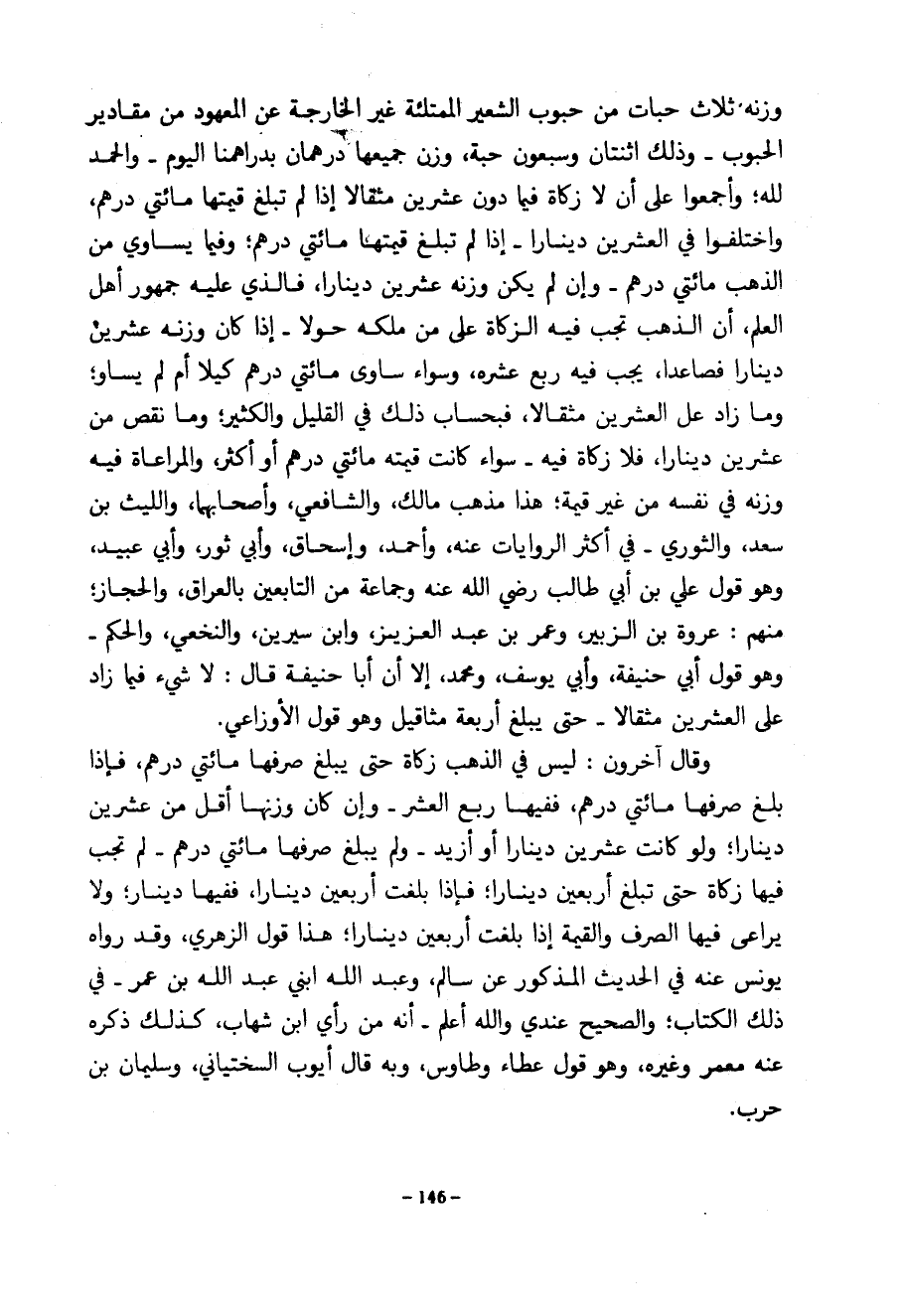 وَزْنُهُ ثَلَاثُ حَبَّاتٍ مِنْ حُبُوبِ الشَّعِيرِ الْمُمْتَلِئَةِ غَيْرِ الْخَارِجَةِ عَنِ الْمَعْهُودِ مِنْ مَقَادِيرِ الْحُبُوبِ وَذَلِكَ اثْنَتَانِ وَسَبْعُونَ حَبَّةً وَزْنُ جَمِيعِهَا دِرْهَمَانِ بِدَرَاهِمِنَا الْيَوْمَ وَالْحَمْدُ لِلَّهِ وَأَجْمَعُوا عَلَى أَنْ لا زكاة فيما دون عشرين مثالا إِذَا لَمْ تَبْلُغْ قِيمَتُهَا مِائَتَيْ دِرْهَمٍ وَاخْتَلَفُوا فِي الْعِشْرِينَ دِينَارًا إِذَا لَمْ تَبْلُغْ قِيمَتُهَا مِائَتَيْ دِرْهَمٍ وَفِيمَا يُسَاوِي مِنَ الذَّهَبِ مِائَتَيْ دِرْهَمٍ وَإِنْ لَمْ يَكُنْ وَزْنُهُ عِشْرِينَ دِينَارًا فَالَّذِي عَلَيْهِ جُمْهُورُ أَهْلِ الْعِلْمِ أَنَّ الذَّهَبَ تَجِبُ فِيهِ الزَّكَاةُ عَلَى مَنْ مَلَكَهُ حَوْلًا إذا كان وزنه عشرين دينارا فصاعدا يَجِبُ فِيهِ رُبْعُ عُشْرِهِ وَسَوَاءٌ سَاوَى مِائَتَيْ دِرْهَمٍ كَيْلًا أَمْ لَمْ يُسَاوِ وَمَا زَادَ عَلَى الْعِشْرِينَ مِثْقَالًا فَبِحِسَابِ ذَلِكَ فِي الْقَلِيلِ وَالْكَثِيرِ وَمَا نَقَصَ مِنْ عِشْرِينَ دِينَارًا فَلَا زَكَاةَ فِيهِ سَوَاءٌ كَانَتْ قِيمَتُهُ مِائَتَيْ دِرْهَمٍ أَوْ أَكَثُرَ وَالْمُرَاعَاةُ فِيهِ وَزْنُهُ فِي نَفْسِهِ مِنْ غَيْرِ قِيمَةٍ هَذَا مَذْهَبُ مَالِكٍ وَالشَّافِعِيِّ وَأَصْحَابِهِمَا وَاللَّيْثِ بْنِ سَعْدٍ وَالثَّوْرِيِّ فِي أَكْثَرِ الرِّوَايَاتِ عَنْهُ وَأَحْمَدَ وَإِسْحَاقَ وَأَبِي ثَوْرٍ وَأَبِي عُبَيْدٍ وَهُوَ قَوْلُ عَلِيِّ بْنِ أَبِي طَالِبٍ رَضِيَ اللَّهُ عَنْهُ وَجَمَاعَةٍ مِنَ التَّابِعِينَ بِالْعِرَاقِ وَالْحِجَازِ مِنْهُمْ عُرْوَةُ بْنُ الزُّبَيْرِ وَعُمَرُ بْنُ عَبْدِ الْعَزِيزِ وَابْنُ سِيرِينَ وَالنَّخَعِيُّ وَالْحَكَمُ وَهُوَ قَوْلُ أَبِي حَنِيفَةَ وَأَبِي يُوسُفَ وَمُحَمَّدٍ إِلَّا أَنَّ أَبَا حَنِيفَةَ قَالَ لَا شَيْءَ فِيمَا زاد على العشرين مثالا حَتَّى يَبْلُغَ أَرْبَعَةَ مَثَاقِيلَ وَهُوَ قَوْلُ الْأَوْزَاعِيِّ وَقَالَ آخَرُونَ لَيْسَ فِي الذَّهَبِ زَكَاةٌ حَتَّى يَبْلُغَ صَرْفُهَا مِائَتَيْ دِرْهَمٍ فَإِذَا بَلَغَ صَرْفُهَا مِائَتَيْ دِرْهَمٍ فَفِيهَا رُبْعُ الْعُشْرِ وَإِنْ كَانَ وَزْنُهَا أَقَلَّ مِنْ عِشْرِينَ دِينَارًا وَلَوْ كَانَتْ عِشْرِينَ دِينَارًا أَوْ أَزْيَدَ وَلَمْ يَبْلُغْ صَرْفُهَا مِائَتَيْ دِرْهَمٍ لَمْ تَجِبْ فِيهَا زَكَاةٌ حَتَّى تَبْلُغَ أَرْبَعِينَ دِينَارًا فَإِذَا بَلَغَتْ أَرْبَعِينَ دِينَارًا فَفِيهَا دِينَارٌ وَلَا يُرَاعَى فِيهَا الصَّرْفُ وَالْقِيمَةُ إِذَا بَلَغَتْ أَرْبَعِينَ دِينَارًا هَذَا قَوْلُ الزُّهْرِيِّ وَقَدْ رَوَاهُ يُونُسُ عَنْهُ فِي الْحَدِيثِ الْمَذْكُورِ عَنْ سَالِمٍ وَعَبْدِ اللَّهِ ابْنَيْ عَبْدِ اللَّهِ بْنِ عُمَرَ فِي ذَلِكَ الْكِتَابِ وَالصَّحِيحُ عِنْدِي وَاللَّهُ أَعْلَمُ أَنَّهُ مِنْ رَأْيِ ابْنِ شِهَابٍ كَذَلِكَ ذَكَرَهُ عَنْهُ مَعْمَرٌ وَغَيْرُهُ وَهُوَ قَوْلُ عَطَاءٍ وَطَاوُسٍ وَبِهِ قَالَ أَيُّوبُ السَّخْتِيَانِيُّ وَسُلَيْمَانُ بن حرب