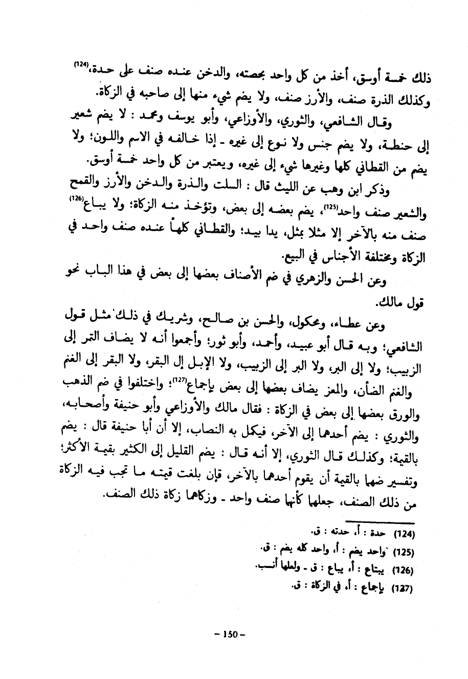 ذَلِكَ خَمْسَةَ أَوْسُقٍ أُخِذَ مِنْ كُلٍّ وَاحِدٍ بِحِصَّتِهِ وَالدَّخَنُ عِنْدَهُ صِنْفٌ عَلَى حِدَةٍ وَكَذَلِكَ الذُّرَةُ صِنْفٌ وَالْأُرْزُ صِنْفٌ وَلَا يُضَمُّ شَيْءٌ مِنْهَا إِلَى صَاحِبِهِ فِي الزَّكَاةِ وَقَالَ الشَّافِعِيُّ وَالثَّوْرِيُّ وَالْأَوْزَاعِيُّ وَأَبُو يُوسُفَ وَمُحَمَّدٌ لَا يُضَمُّ شَعِيرٌ إِلَى حِنْطَةٍ وَلَا يُضَمُّ جِنْسٌ وَلَا نَوْعٌ إِلَى غَيْرِهِ إِذَا خَالَفَهُ فِي الِاسْمِ وَاللَّوْنِ وَلَا يُضَمُّ مِنَ الْقَطَانِيِّ كُلِّهَا وَغَيْرِهَا شَيْءٌ إِلَى غَيْرِهِ وَيُعْتَبَرُ مِنْ كُلِّ وَاحِدٍ خَمْسَةُ أَوْسُقٍ وَذَكَرَ ابْنُ وَهْبٍ عَنِ اللَّيْثِ قَالَ السُّلْتُ وَالذُّرَةُ وَالدَّخَنُ وَالْأُرْزُ وَالْقَمْحُ وَالشَّعِيرُ صِنْفٌ وَاحِدٌ يُضَمُّ بَعْضُهُ إِلَى بَعْضٍ وَتُؤْخَذُ مِنْهُ الزَّكَاةُ وَلَا يُبَاعُ صِنْفٌ مِنْهُ بِالْآخَرِ إلا مثل بِمِثْلٍ يَدًا بِيَدٍ وَالْقَطَانِيُّ كُلُّهَا عِنْدَهُ صِنْفٌ وَاحِدٌ فِي الزَّكَاةِ وَمُخْتَلِفَةُ الْأَجْنَاسِ فِي الْبَيْعِ وَعَنِ الْحَسَنِ وَالزُّهْرِيِّ فِي ضَمِّ الْأَصْنَافِ بَعْضِهَا إِلَى بَعْضٍ فِي هَذَا الْبَابِ نَحْوُ قَوْلِ مَالِكٍ وَعَنْ عَطَاءٍ وَمَحْكُولٍ وَالْحَسَنِ بْنِ صَالِحٍ وَشَرِيكٍ فِي ذَلِكَ مِثْلَ قَوْلِ الشَّافِعِيِّ وَبِهِ قَالَ أَبُو عُبَيْدٍ وَأَحْمَدُ وَأَبُو ثَوْرٍ وَأَجْمَعُوا أَنَّهُ لَا يُضَافُ التَّمْرُ إِلَى الزَّبِيبِ وَلَا إِلَى الْبُرِّ وَلَا الْبُرُّ إِلَى الزَّبِيبِ وَلَا الْإِبِلُ إِلَى الْبَقَرِ وَلَا الْبَقَرُ إِلَى الْغَنَمِ وَالْغَنَمُ الضَّأْنُ وَالْمَعْزُ يُضَافُ بَعْضُهَا إِلَى بَعْضٍ بِإِجْمَاعٍ وَاخْتَلَفُوا فِي ضَمِّ الذَّهَبِ وَالْوَرِقِ بَعْضِهَا إِلَى بَعْضٍ فِي الزَّكَاةِ فَقَالَ مَالِكٌ وَالْأَوْزَاعِيُّ وَأَبُو حَنِيفَةَ وَأَصْحَابُهُ وَالثَّوْرِيُّ يُضَمُّ أَحَدُهُمَا إِلَى الْآخَرِ فَيَكْمُلُ بِهِ النِّصَابُ إِلَّا أَنَّ أَبَا حَنِيفَةَ قَالَ يُضَمُّ بِالْقِيمَةِ وَكَذَلِكَ قَالَ الثَّوْرِيُّ إِلَّا أَنَّهُ قَالَ يُضَمُّ الْقَلِيلُ إِلَى الْكَثِيرِ بقيمة الأكثر وتفسير ضهما بِالْقِيمَةِ أَنْ يُقَوَّمَ أَحَدُهُمَا بِالْآخَرِ فَإِنْ بَلَغَتْ قِيمَتُهُ مَا تَجِبُ فِيهِ الزَّكَاةُ مِنْ ذَلِكَ الصنف جعلهما كأنهما صنف واحد وزكهما زَكَاةَ ذَلِكَ الصِّنْفِ