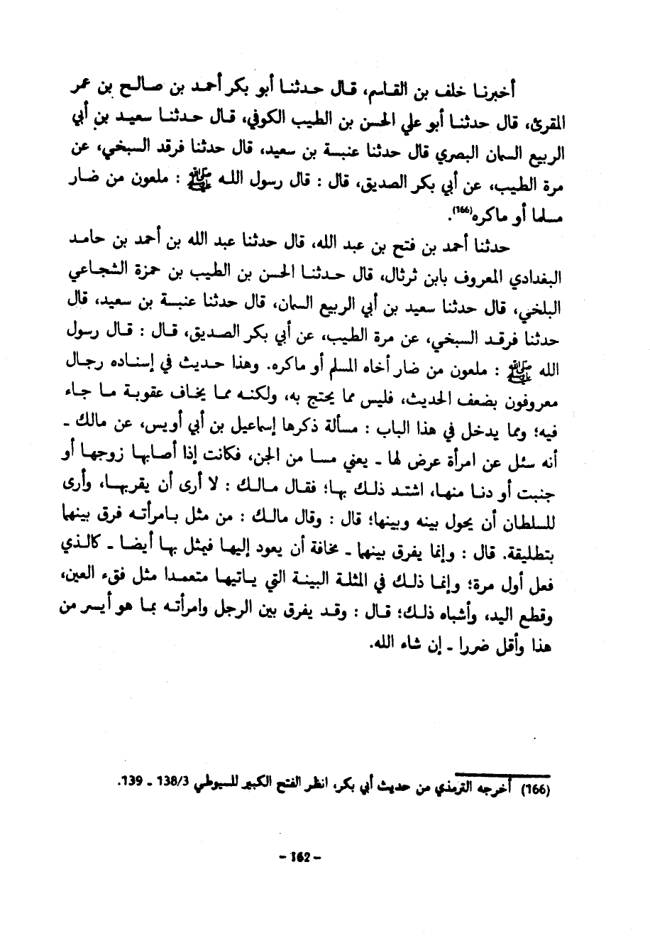 قَالَ حَدَّثَنَا أَبُو بَكْرٍ أَحْمَدُ بْنُ صَالِحِ بْنِ عُمَرَ الْمُقْرِئُ قَالَ حَدَّثَنَا أَبُو عَلِيٍّ الْحَسَنُ بْنُ الطَّيِّبِ الْكُوفِيُّ قَالَ حَدَّثَنَا سَعِيدُ بْنُ أَبِي الرَّبِيعِ السَّمَّانُ الْبَصْرِيُّ قَالَ حَدَّثَنَا عَنْبَسَةُ بْنُ سَعِيدٍ قَالَ حَدَّثَنَا فَرْقَدٌ السَّبَخِيُّ عَنْ مُرَّةَ الطَّيِّبِ عَنْ أَبِي بَكْرٍ الصِّدِّيقِ قَالَ قَالَ رَسُولُ اللَّهِ صَلَّى اللَّهُ عَلَيْهِ وَسَلَّمَ مَلْعُونٌ مَنْ ضَارَّ مُسْلِمًا أَوْ مَاكَرَهُ حَدَّثَنَا أَحْمَدُ بْنُ فَتْحِ بْنِ عَبْدِ اللَّهِ قَالَ حَدَّثَنَا عَبْدُ اللَّهِ بْنُ أَحْمَدَ بْنِ حَامِدٍ الْبَغْدَادِيُّ الْمَعْرُوفُ بِابْنِ ثَرْثَالٍ قَالَ حَدَّثَنَا الْحَسَنُ بْنُ الطَّيِّبِ بْنِ حَمْزَةَ الشُّجَاعِيُّ الْبَلْخِيُّ قَالَ حَدَّثَنَا سَعِيدُ بْنُ أَبِي الرَّبِيعِ السَّمَّانُ قَالَ حَدَّثَنَا عَنْبَسَةُ بْنُ سَعِيدٍ قَالَ حَدَّثَنَا فَرْقَدٌ السَّبَخِيُّ عَنْ مُرَّةَ الطَّيِّبِ عَنْ أَبِي بَكْرٍ الصِّدِّيقِ قَالَ قَالَ رَسُولُ اللَّهِ صَلَّى اللَّهُ عَلَيْهِ وَسَلَّمَ مَلْعُونٌ مَنْ ضَارَّ أَخَاهُ الْمُسْلِمَ أَوْ مَاكَرَهُ وَهَذَا حَدِيثٌ فِي إِسْنَادِهِ رجال معرفون بِضَعْفِ الْحَدِيثِ فَلَيْسَ مِمَّا يُحْتَجُّ بِهِ وَلَكِنَّهُ مِمَّا يُخَافُ عُقُوبَةُ مَا جَاءَ فِيهِ وَمِمَّا يَدْخُلُ فِي هَذَا الْبَابِ مَسْأَلَةٌ ذَكَرَهَا إِسْمَاعِيلُ بْنُ أَبِي أُوَيْسٍ عَنْ مَالِكٍ أَنَّهُ سُئِلَ عَنِ امْرَأَةٍ عَرَضَ لَهَا يَعْنِي مَسًّا مِنَ الْجِنِّ فَكَانَتْ إِذَا أَصَابَهَا زَوْجُهَا أَوْ جَنِبَتْ أَوْ دَنَا مِنْهَا اشْتَدَّ ذَلِكَ بِهَا فَقَالَ مَالِكٌ لَا أَرَى أَنْ يَقْرَبَهَا وَأَرَى لِلسُّلْطَانِ أن يحول بينه وبينهإن قَالَ وَقَالَ مَالِكٌ مَنْ مَثَّلَ بِامْرَأَتِهِ فُرِّقَ بَيْنَهُمَا بِتَطْلِيقَةٍ قَالَ وَإِنَّمَا يُفَرَّقُ بَيْنَهُمَا مَخَافَةَ أَنْ يَعُودَ إِلَيْهَا فَيُمَثِّلَ بِهَا أَيْضًا كَالَّذِي فَعَلَ أَوَّلَ مَرَّةٍ وَإِنَّمَا ذَلِكَ فِي الْمُثْلَةِ الْبَيِّنَةِ الَّتِي يَأْتِيهَا مُتَعَمِّدًا مِثْلُ فَقْءِ الْعَيْنِ وَقَطْعِ الْيَدِ وَأَشْبَاهِ ذَلِكَ قَالَ وَقَدْ يُفَرَّقُ بَيْنَ الرَّجُلِ وَامْرَأَتِهِ بِمَا هُوَ أَيْسَرُ مِنْ هَذَا وَأَقَلُّ ضَرَرًا إِنْ شَاءَ اللَّهُ