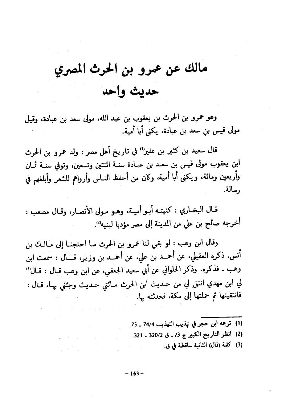 مالك عن عمرو بن الحرث المصري حديث واحد وهو عمرو بن الحرث بْنِ يَعْقُوبَ بْنِ عَبْدِ اللَّهِ مَوْلَى سَعْدِ بْنِ عُبَادَةَ وَقِيلَ مَوْلَى قَيْسِ بْنِ سَعْدِ بْنِ عُبَادَةَ يُكَنَّى أَبَا أُمَيَّةَ قَالَ سَعِيدُ بْنُ كَثِيرِ بْنِ عُفَيْرٍ فِي تَارِيخِ أَهْلِ مصر ولد عمرو بن الحرث ابن يَعْقُوبَ مَوْلَى قَيْسِ بْنِ سَعْدِ بْنِ عُبَادَةَ سَنَةَ اثْنَتَيْنِ وَتِسْعِينَ وَتُوُفِّيَ سَنَةَ ثَمَانٍ وَأَرْبَعِينَ وَمِائَةٍ وَيُكَنَّى أَبَا أُمَيَّةَ وَكَانَ مِنْ أَحْفَظِ النَّاسِ وَأَرْوَاهُمْ لِلشِّعْرِ وَأَبْلَغِهِمْ فِي رِسَالَةٍ قَالَ الْبُخَارِيُّ كُنْيَتُهُ أَبُو أُمَيَّةَ وَهُوَ مَوْلَى الْأَنْصَارِ وَقَالَ مُصْعَبٌ أَخْرَجَهُ صَالِحُ بْنُ عَلِيٍّ مِنَ الْمَدِينَةِ إِلَى مِصْرَ مُؤَدِّبًا لِبَنِيهِ وَقَالَ ابْنُ وهب لو بقي لنا عمرو بن الحرث مَا احْتَجْنَا إِلَى مَالِكِ بْنِ أَنَسٍ ذَكَرَهُ الْعُقَيْلِيُّ عَنْ أَحْمَدَ بْنِ عَلِيٍّ عَنْ أَحْمَدَ بْنِ وَزِيرٍ قَالَ سَمِعْتُ ابْنَ وَهْبٍ فَذَكَرَهُ وذكر الحلواني عَنْ أَبِي سَعِيدٍ الْجُعْفِيِّ عَنِ ابْنِ وَهْبٍ قَالَ قَالَ لِي ابْنُ مَهْدِيٍّ انْتَقِ لِي من حديث ابن الحرث مِائَتَيْ حَدِيثٍ وَجِئْنِي بِهَا قَالَ فَانْتَقَيْتُهَا ثُمَّ حَمَلْتُهَا إِلَى مَكَّةَ فَحَدَّثْتُهُ بِهَا
