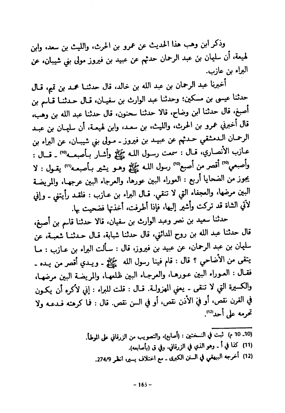 وَذَكَرَ ابْنُ وَهْبٍ هَذَا الْحَدِيثَ عَنْ عَمْرِو بن الحرث والليث بن سعد وابن لهيعة أن سليمان بن عبد الرحمان حَدَّثَهُمْ عَنْ عُبَيْدِ بْنِ فَيْرُوزَ مَوْلَى بَنِي شَيْبَانَ عَنِ الْبَرَاءِ بْنِ عَازِبٍ أَخْبَرَنَا عَبْدُ الرحمان بْنُ عَبْدِ اللَّهِ بْنِ خَالِدٍ قَالَ حَدَّثَنَا مُحَمَّدِ بْنِ تَمِيمٍ قَالَ حَدَّثَنَا عِيسَى بْنُ مِسْكِينٍ وَحَدَّثَنَا عَبْدُ الْوَارِثِ بْنُ سُفْيَانَ قَالَ حَدَّثَنَا قَاسِمُ بْنُ أَصْبَغَ قَالَ حَدَّثَنَا ابْنُ وَضَّاحٍ قَالَا حَدَّثَنَا سَحْنُونُ قَالَ حَدَّثَنَا عَبْدُ اللَّهِ بْنُ وَهْبٍ قَالَ أَخْبَرَنِي عَمْرُو بْنُ الحرث والليث بن سعد وابن لهيعة أن سليمان بن عبد الرحمان الدِّمَشْقِيَّ حَدَّثَهُمْ عَنْ عُبَيْدِ بْنِ فَيْرُوزَ مَوْلَى بين شَيْبَانَ عَنِ الْبَرَاءِ بْنِ عَازِبٍ الْأَنْصَارِيِّ قَالَ سَمِعْتُ رَسُولَ اللَّهِ صَلَّى اللَّهُ عَلَيْهِ وسلم وَأَشَارَ بِإِصْبُعِهِ قَالَ وَإِصْبُعِي أَقْصَرُ مِنْ إِصْبُعِ رسول الله صلى الله عليه وسلم وهو يُشِيرُ بِإِصْبُعِهِ يَقُولُ لَا يَجُوزُ مِنَ الضَّحَايَا أربع العوراء البين عورها والعرجاء البيت عرجها والمريضة البيت مَرَضُهَا وَالْعَجْفَاءُ الَّتِي لَا تُنْقِي قَالَ الْبَرَاءُ بْنُ عَازِبٍ فَلَقَدْ رَأَيْتُنِي وَإِنِّي لَآتِي الشَّاةَ قَدْ تُرِكَتْ وَأُشِيرُ إِلَيْهَا فَإِذَا أَطْرَفَتْ أَخَذْتُهَا فَضَحَّيْتُ بِهَا حَدَّثَنَا سَعِيدُ بْنُ نَصْرٍ وَعَبْدُ الْوَارِثِ بْنُ سُفْيَانَ قَالَا حَدَّثَنَا قَاسِمُ بْنُ أَصْبَغَ قَالَ حَدَّثَنَا عَبْدُ اللَّهِ بْنُ رَوْحٍ الْمَدَائِنِيُّ قَالَ حَدَّثَنَا شَبَّابَةُ قَالَ حَدَّثَنَا شُعْبَةُ عن سليمان بن عبد الرحمان عَنْ عُبَيْدِ بْنِ فَيْرُوزَ قَالَ سَأَلْتُ الْبَرَاءَ بْنَ عَازِبٍ مَا يُتَّقَى مِنَ الْأَضَاحِيِّ قَالَ قَامَ فِينَا رَسُولُ اللَّهِ صَلَّى اللَّهُ عَلَيْهِ وَسَلَّمَ وَيَدِي أَقْصَرُ مِنْ يَدِهِ فَقَالَ الْعَوْرَاءُ الْبَيِّنُ عَوَرُهَا وَالْعَرْجَاءُ الْبَيِّنُ ظَلْعُهَا وَالْمَرِيضَةُ الْبَيِّنُ مَرَضُهَا وَالْكَسِيرَةُ الَّتِي لَا تُنْقِي يَعْنِي الْمَهْزُولَةَ قَالَ قُلْتُ لِلْبَرَاءِ إِنِّي لَأَكْرَهُ أَنْ يَكُونَ فِي الْقَرْنِ نَقْصٌ أَوْ فِي الْأُذُنِ نَقْصٌ أَوْ فِي السِّنِّ نَقْصٌ قَالَ فَمَا كَرِهْتَهُ فَدَعْهُ وَلَا تُحَرِّمْهُ عَلَى أَحَدٍ
