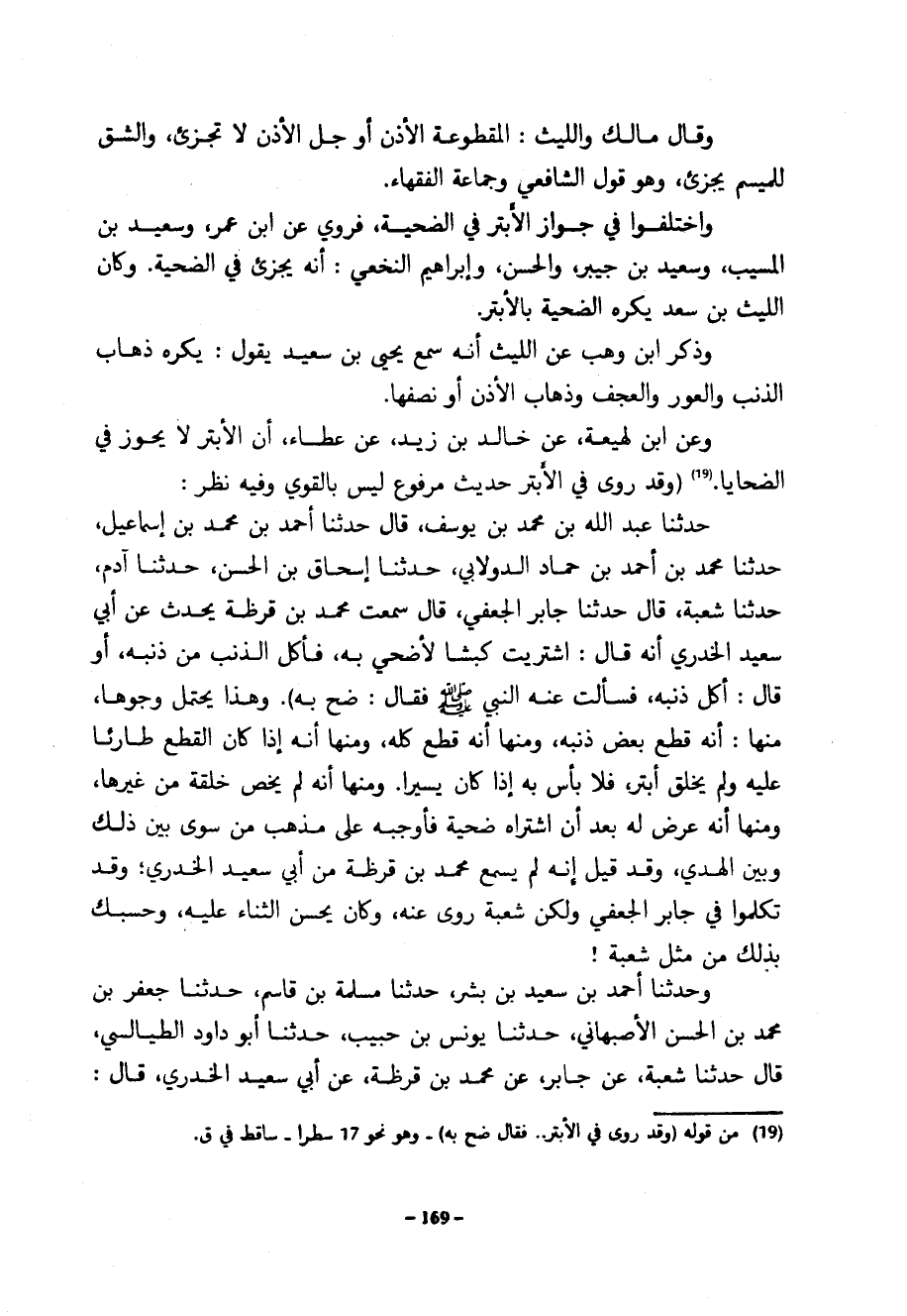 وقال مالك والليث الْمَقْطُوعَةُ الْأُذُنِ أَوْ جُلِّ الْأُذُنِ لَا تُجْزِئُ وَالشَّقُّ لِلْمِيسَمِ يُجْزِئُ وَهُوَ قَوْلُ الشَّافِعِيِّ وَجَمَاعَةِ الْفُقَهَاءِ وَاخْتَلَفُوا فِي جَوَازِ الْأَبْتَرِ فِي الضَّحِيَّةِ فَرُوِيَ عَنِ ابْنِ عُمَرَ وَسَعِيدِ بْنِ الْمُسَيَّبِ وَسَعِيدِ بْنِ جُبَيْرٍ وَالْحَسَنِ وَإِبْرَاهِيمَ النَّخَعِيِّ أَنَّهُ يُجْزِئُ فِي الضَّحِيَّةِ وَكَانَ اللَّيْثُ بْنُ سَعْدٍ يَكْرَهُ الضَّحِيَّةَ بِالْأَبْتَرِ وَذَكَرَ ابْنُ وَهْبٍ عَنِ اللَّيْثِ أَنَّهُ سَمِعَ يَحْيَى بْنَ سَعِيدٍ يَقُولُ يُكْرَهُ ذَهَابُ الذَّنَبِ وَالْعَوَرُ وَالْعَجَفُ وَذَهَابُ الْأُذُنِ أَوْ نِصْفِهَا وَعَنِ ابْنِ لَهِيعَةَ عَنْ خَالِدِ بْنِ زَيْدٍ عَنْ عَطَاءٍ أَنَّ الْأَبْتَرَ لَا يَجُوزُ فِي الضَّحَايَا (وَقَدْ رُوِيَ فِي الْأَبْتَرِ حَدِيثٌ مَرْفُوعٌ لَيْسَ بِالْقَوِيِّ وَفِيهِ نَظَرٌ حَدَّثَنَا عَبْدُ اللَّهِ بْنُ مُحَمَّدِ بْنِ يُوسُفَ قَالَ حَدَّثَنَا أَحْمَدُ بْنُ مُحَمَّدِ بْنِ إِسْمَاعِيلَ حَدَّثَنَا مُحَمَّدُ بْنُ أَحْمَدَ بْنِ حَمَّادٍ الدُّولَابِيُّ حَدَّثَنَا إِسْحَاقُ بْنُ الْحَسَنِ حَدَّثَنَا آدَمُ حَدَّثَنَا شُعْبَةُ قَالَ حَدَّثَنَا جَابِرٌ الْجُعْفِيُّ قَالَ سَمِعْتُ مُحَمَّدَ بْنَ قَرَظَةَ يُحَدِّثُ عَنْ أَبِي سَعِيدٍ الْخُدْرِيِّ أَنَّهُ قَالَ اشْتَرَيْتُ كَبْشًا لِأُضَحِّيَ بِهِ فَأَكَلَ الذِّئْبُ مِنْ ذَنَبِهِ أَوْ قَالَ أَكَلَ ذَنَبَهُ فَسَأَلْتُ عَنْهُ النَّبِيَّ صَلَّى اللَّهُ عَلَيْهِ وَسَلَّمَ فَقَالَ ضَحِّ بِهِ) وَهَذَا يَحْتَمِلُ وُجُوهًا مِنْهَا أَنَّهُ قُطِعَ بَعْضُ ذَنَبِهِ وَمِنْهَا أَنَّهُ قُطِعَ كُلُّهُ وَمِنْهَا أَنَّهُ إِذَا كَانَ الْقَطْعُ طَارِئًا عَلَيْهِ وَلَمْ يُخْلَقْ أَبْتَرَ فَلَا بَأْسَ بِهِ إِذَا كَانَ يَسِيرًا وَمِنْهَا أَنَّهُ لَمْ يَخُصَّ خِلْقَةً مِنْ غَيْرِهَا وَمِنْهَا أَنَّهُ عَرَضَ لَهُ بعد أن شتراه ضَحِيَّةً فَأَوْجَبَهُ عَلَى مَذْهَبِ مَنْ سَوَّى بَيْنَ ذَلِكَ وَبَيْنَ الْهَدْيِ وَقَدْ قِيلَ إِنَّهُ لَمْ يَسْمَعْ مُحَمَّدُ بْنُ قَرَظَةَ مِنْ أَبِي سَعِيدٍ الْخُدْرِيِّ وَقَدْ تَكَلَّمُوا فِي جَابِرٍ الْجُعْفِيِّ وَلَكِنَّ شُعْبَةَ رَوَى عَنْهُ وَكَانَ يُحْسِنُ الثَّنَاءَ عَلَيْهِ وَحَسْبُكَ بِذَلِكَ مِنْ مِثْلِ شُعْبَةَ وَحَدَّثَنَا أَحْمَدُ بْنُ سَعِيدِ بْنِ بِشْرٍ حَدَّثَنَا مَسْلَمَةُ بْنُ قَاسِمٍ حَدَّثَنَا جَعْفَرُ بْنُ مُحَمَّدِ بْنِ الْحَسَنِ الْأَصْبَهَانِيُّ حَدَّثَنَا يُونُسُ بْنُ حَبِيبٍ حَدَّثَنَا أَبُو دَاوُدَ الطَّيَالِسِيُّ قَالَ حَدَّثَنَا شُعْبَةُ عَنْ جَابِرٍ عَنْ مُحَمَّدِ بْنِ قَرَظَةَ عَنْ أَبِي سَعِيدٍ الخدري قال