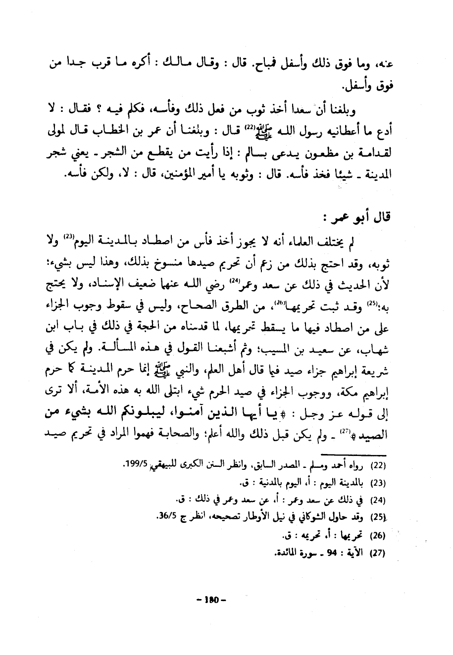 عَنْهُ وَمَا فَوْقَ ذَلِكَ وَأَسْفَلَ فَمُبَاحٌ قَالَ وَقَالَ مَالِكٌ أَكْرَهُ مَا قَرُبَ جِدًّا مِنْ فَوْقٍ وَأَسْفَلَ وَبَلَغَنَا أَنَّ سَعْدًا أَخَذَ ثَوْبَ مَنْ فَعَلَ ذَلِكَ وَفَأْسَهُ فَكُلِّمَ فِيهِ فَقَالَ لَا أَدَعُ مَا أَعْطَانِيهِ رَسُولُ اللَّهِ صَلَّى اللَّهُ عَلَيْهِ وَسَلَّمَ قَالَ وَبَلَغَنَا أَنَّ عُمَرَ بْنَ الْخَطَّابِ قَالَ لِمَوْلًى لِقُدَامَةَ بْنِ مَظْعُونٍ يدعى بسالم إِذَا رَأَيْتَ مَنْ يَقْطَعُ مِنَ الشَّجَرِ يَعْنِي شَجَرَ الْمَدِينَةِ شَيْئًا فَخُذْ فَأْسَهُ قَالَ وَثَوْبَهُ يَا أَمِيرَ الْمُؤْمِنِينَ قَالَ لَا وَلَكِنْ فَأْسَهُ قَالَ أَبُو عُمَرَ لَمْ يَخْتَلِفِ الْعُلَمَاءُ أَنَّهُ لا يجوز أخذ فأس اصْطَادَ بِالْمَدِينَةِ الْيَوْمَ وَلَا ثَوْبِهِ وَقَدِ احْتَجَّ بِذَلِكَ مَنْ زَعَمَ أَنَّ تَحْرِيمَ صَيْدِهَا مَنْسُوخٌ بِذَلِكَ وَهَذَا لَيْسَ بِشَيْءٍ لِأَنَّ الْحَدِيثَ فِي ذَلِكَ عَنْ سَعْدٍ وَعُمَرَ رَضِيَ اللَّهُ عَنْهُمَا ضَعِيفُ الْإِسْنَادِ وَلَا يُحْتَجُّ بِهِ وَقَدْ ثَبَتَ تَحْرِيمُهَا مِنَ الطُّرُقِ الصِّحَاحِ وَلَيْسَ فِي سُقُوطِ وُجُوبِ الْجَزَاءِ عَلَى مَنِ اصْطَادَ فِيهَا مَا يُسْقِطُ تَحْرِيمَهَا لِمَا قَدَّمْنَاهُ مِنَ الْحُجَّةَ فِي ذَلِكَ فِي بَابِ ابْنِ شِهَابٍ عَنِ سَعِيدِ بْنِ المسيب وثم أشبعنا الْقَوْلَ فِي هَذِهِ الْمَسْأَلَةِ وَلَمْ يَكُنْ فِي شَرِيعَةِ إِبْرَاهِيمَ جَزَاءُ صَيْدٍ فِيمَا قَالَ أَهْلُ الْعِلْمِ وَالنَّبِيُّ صَلَّى اللَّهُ عَلَيْهِ وَسَلَّمَ إِنَّمَا حَرَّمَ الْمَدِينَةَ كَمَا حَرَّمَ إِبْرَاهِيمُ مَكَّةَ وَوُجُوبُ الْجَزَاءِ فِي صَيْدِ الْحَرَمِ شَيْءٌ ابْتَلَى اللَّهُ بِهِ هَذِهِ الْأُمَّةَ أَلَا تَرَى إِلَى قَوْلِهِ عز وجل يا أيها الذين آمنوا ليبولنكم اللَّهُ بِشَيْءٍ مِنَ الصَّيْدِ وَلَمْ يَكُنْ قَبْلَ ذَلِكَ وَاللَّهُ أَعْلَمُ وَالصَّحَابَةُ فَهِمُوا الْمُرَادَ فِي تحريم صيد