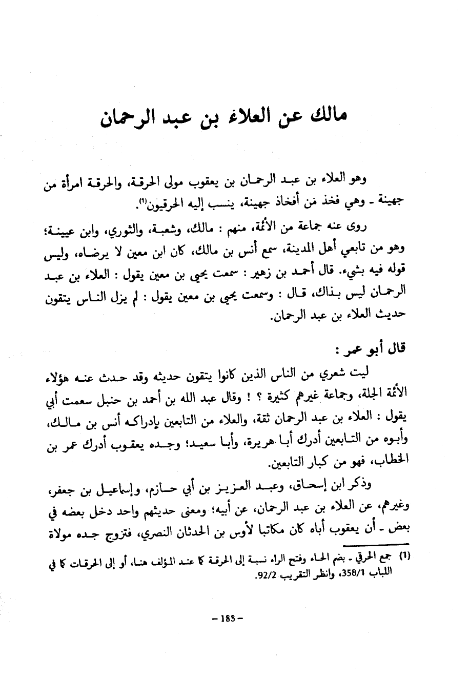 والحرقة امرأة جُهَيْنَةَ وَهِيَ فَخِذٌ مِنْ أَفْخَاذِ جُهَيْنَةَ يُنْسَبُ إليه الحرقيون روى عنه جماعة من الأمئة مِنْهُمْ مَالِكٌ وَشُعْبَةُ وَالثَّوْرِيُّ وَابْنُ عُيَيْنَةَ وَهُوَ مِنْ تَابِعِي أَهْلِ الْمَدِينَةِ سَمِعَ أَنَسَ بْنَ مَالِكٍ كَانَ ابْنُ مَعِينٍ لَا يَرْضَاهُ وَلَيْسَ قَوْلُهُ فِيهِ بِشَيْءٍ قَالَ أَحْمَدُ بْنُ زُهَيْرٍ سَمِعْتُ يَحْيَى بْنَ مَعِينٍ يَقُولُ الْعَلَاءُ بْنُ عبد الرحمان لَيْسَ بِذَاكَ قَالَ وَسَمِعْتُ يَحْيَى بْنَ مَعِينٍ يَقُولُ لَمْ يَزَلِ النَّاسُ يَتَّقُونَ حَدِيثَ الْعَلَاءِ بن عبد الرحمان قَالَ أَبُو عُمَرَ لَيْتَ شِعْرِي مَنِ النَّاسُ الَّذِينَ كَانُوا يَتَّقُونَ حَدِيثَهُ وَقَدْ حَدَّثَ عَنْهُ هَؤُلَاءِ الْأَئِمَّةُ الْجُلَّةُ وَجَمَاعَةٌ غَيْرُهُمْ كَثِيرَةٌ وَقَالَ عَبْدُ اللَّهِ بْنُ أَحْمَدَ بْنِ حَنْبَلٍ سَمِعْتُ أبي يقول العلاء بن عبد الرحمان ثِقَةٌ وَالْعَلَاءُ مِنَ التَّابِعِينَ بِإِدْرَاكِهِ أَنَسَ بْنَ مَالِكٍ وَأَبُوهُ مِنَ التَّابِعِينَ أَدْرَكَ أَبَا هُرَيْرَةَ وأبا سعيد وجده يعقوب أدرك بْنَ الْخَطَّابِ فَهُوَ مِنْ كِبَارِ التَّابِعِينَ وَذَكَرَ ابْنُ إِسْحَاقَ وَعَبْدُ الْعَزِيزِ بْنُ أَبِي حَازِمٍ وَإِسْمَاعِيلُ بْنُ جَعْفَرٍ وَغَيْرُهُمْ عَنِ الْعَلَاءِ بْنِ عبد الرحمان عَنْ أَبِيهِ وَمَعْنَى حَدِيثِهِمْ وَاحِدٌ دَخَلَ بَعْضُهُ فِي بَعْضٍ أَنَّ يَعْقُوبَ أَبَاهُ كَانَ مُكَاتِبًا لِأَوْسِ بْنِ الْحَدَثَانِ النَّصْرِيِّ فَتَزَوَّجَ جَدُّهُ مَوْلَاةً